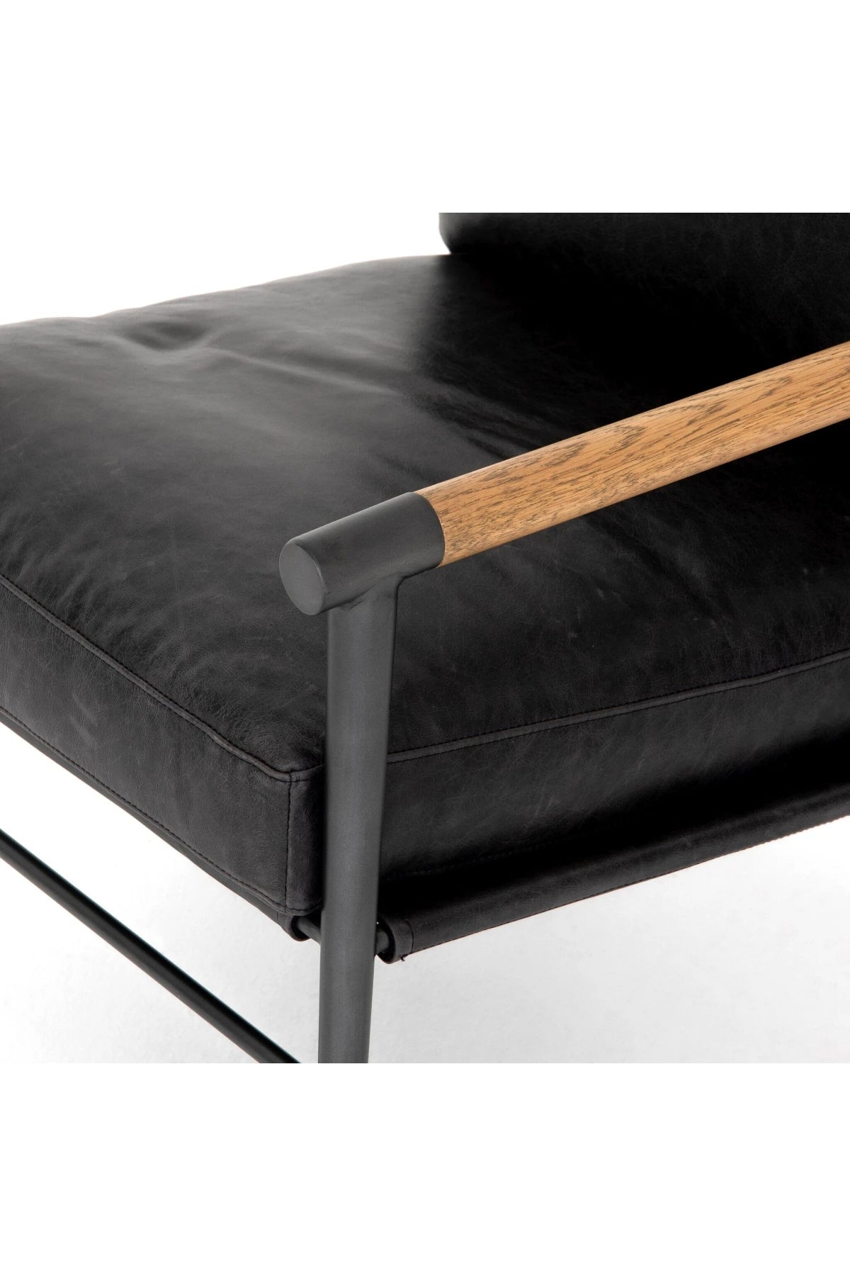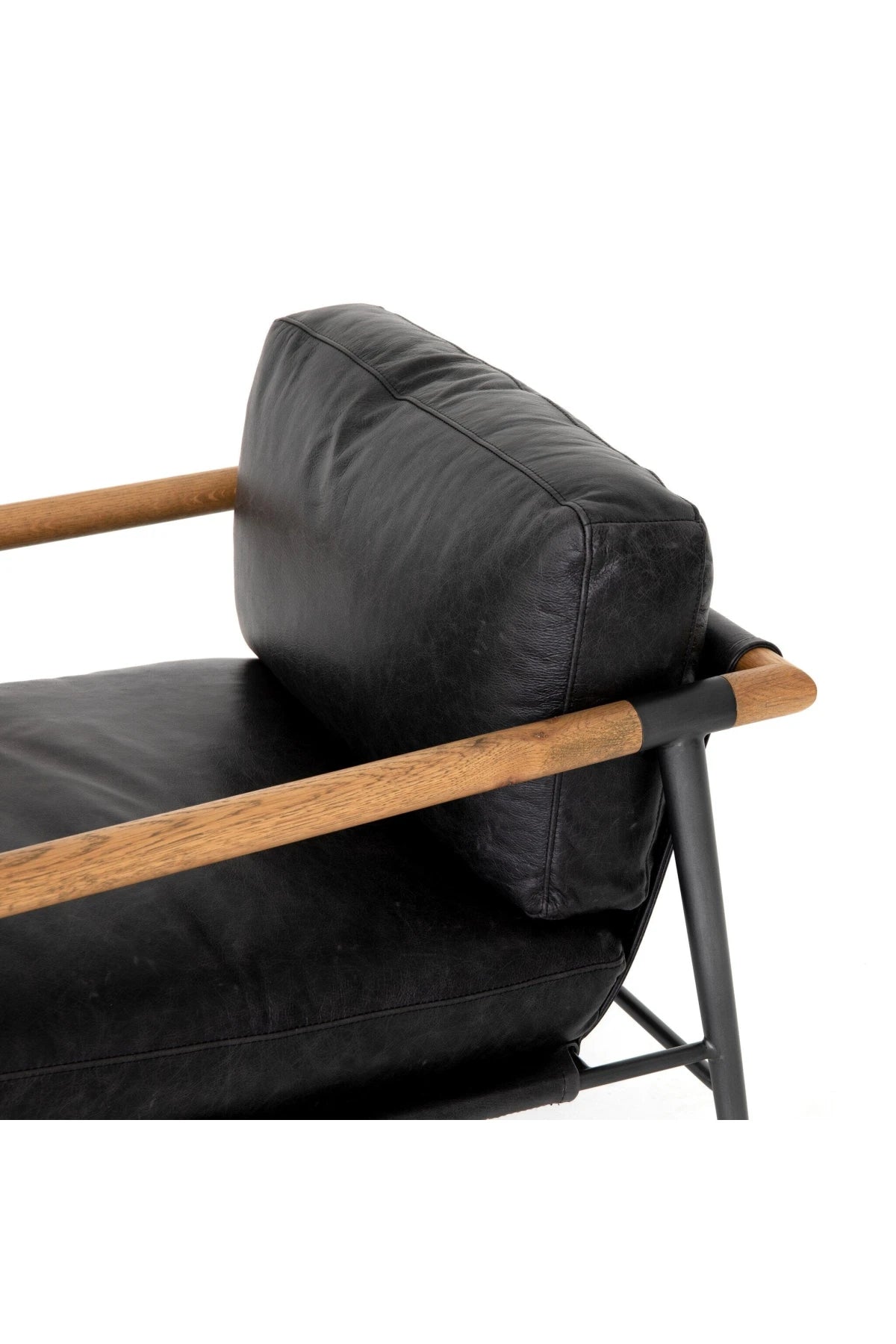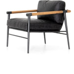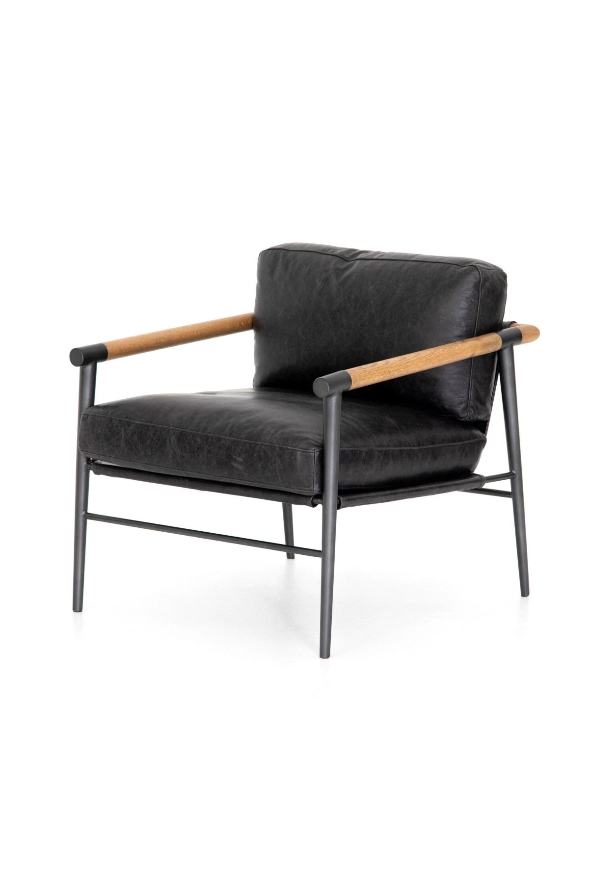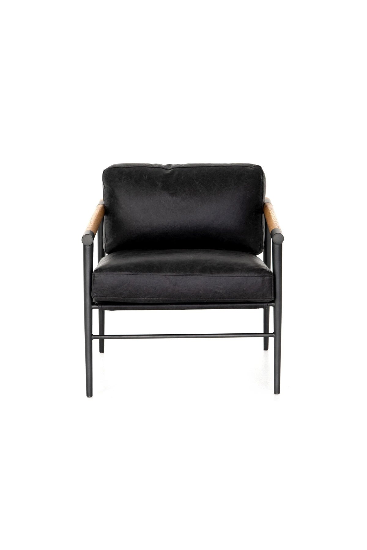 Meet the Rowen Chair. Buttery black seating of top-grain leather, with angular arms of exposed oak providing fresh contrast. Slim, carbon-finished steel legs for a dose of modern-industrial edge.