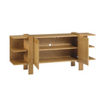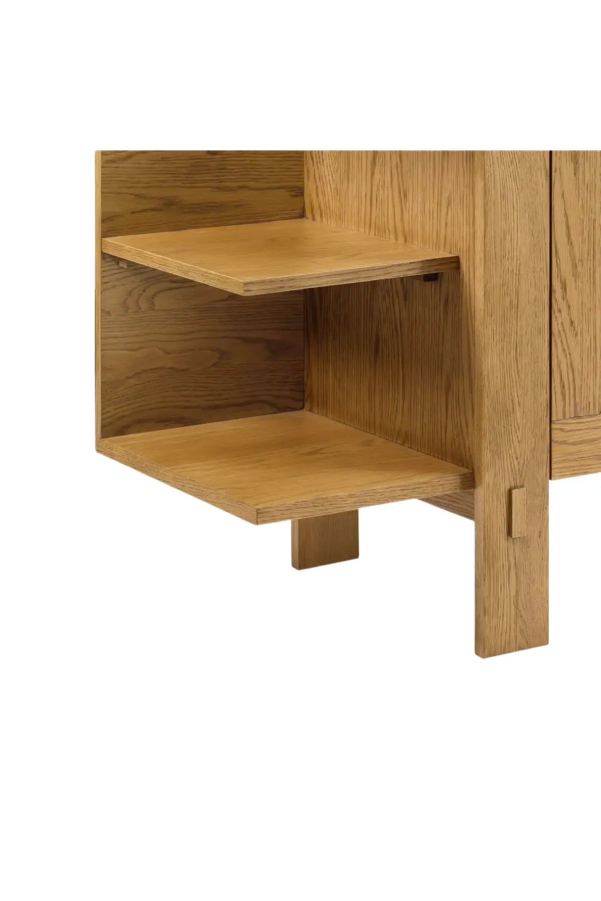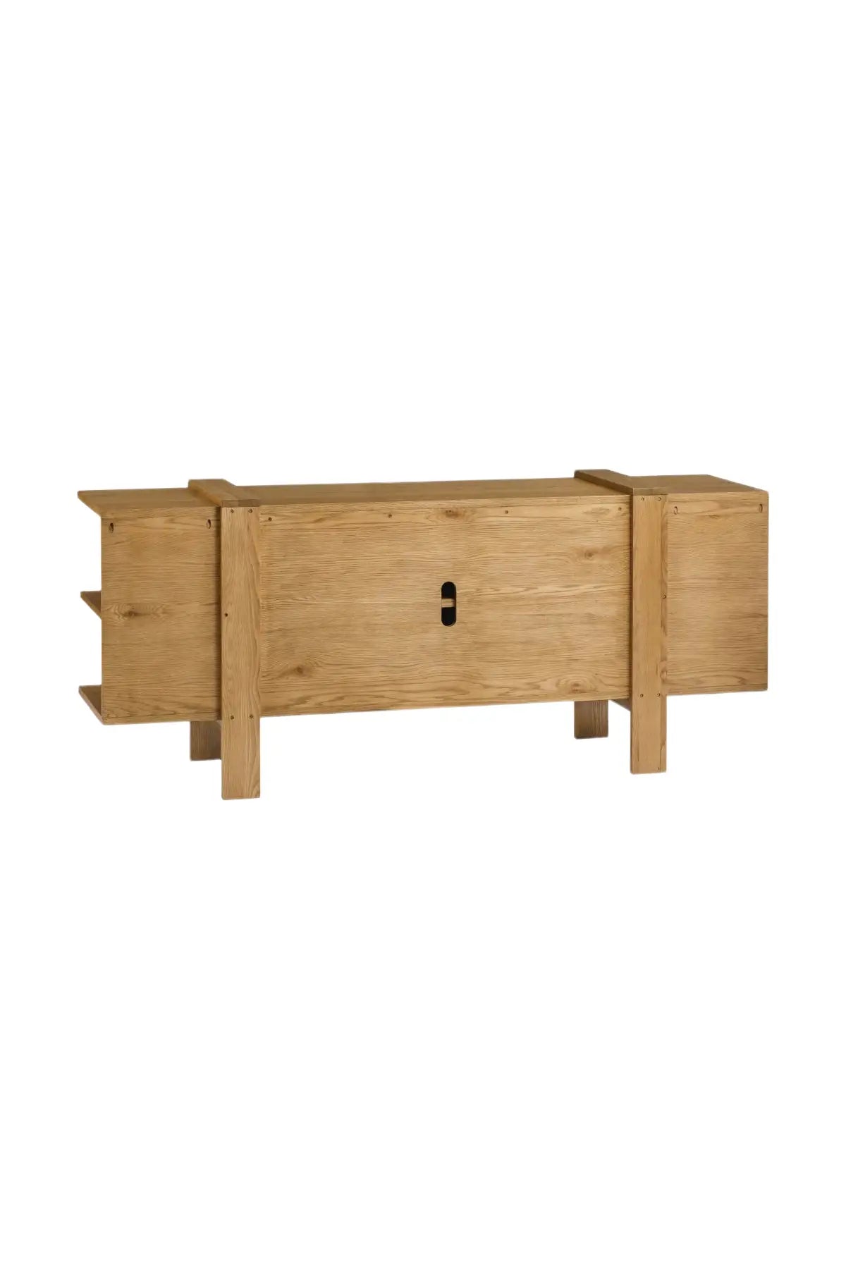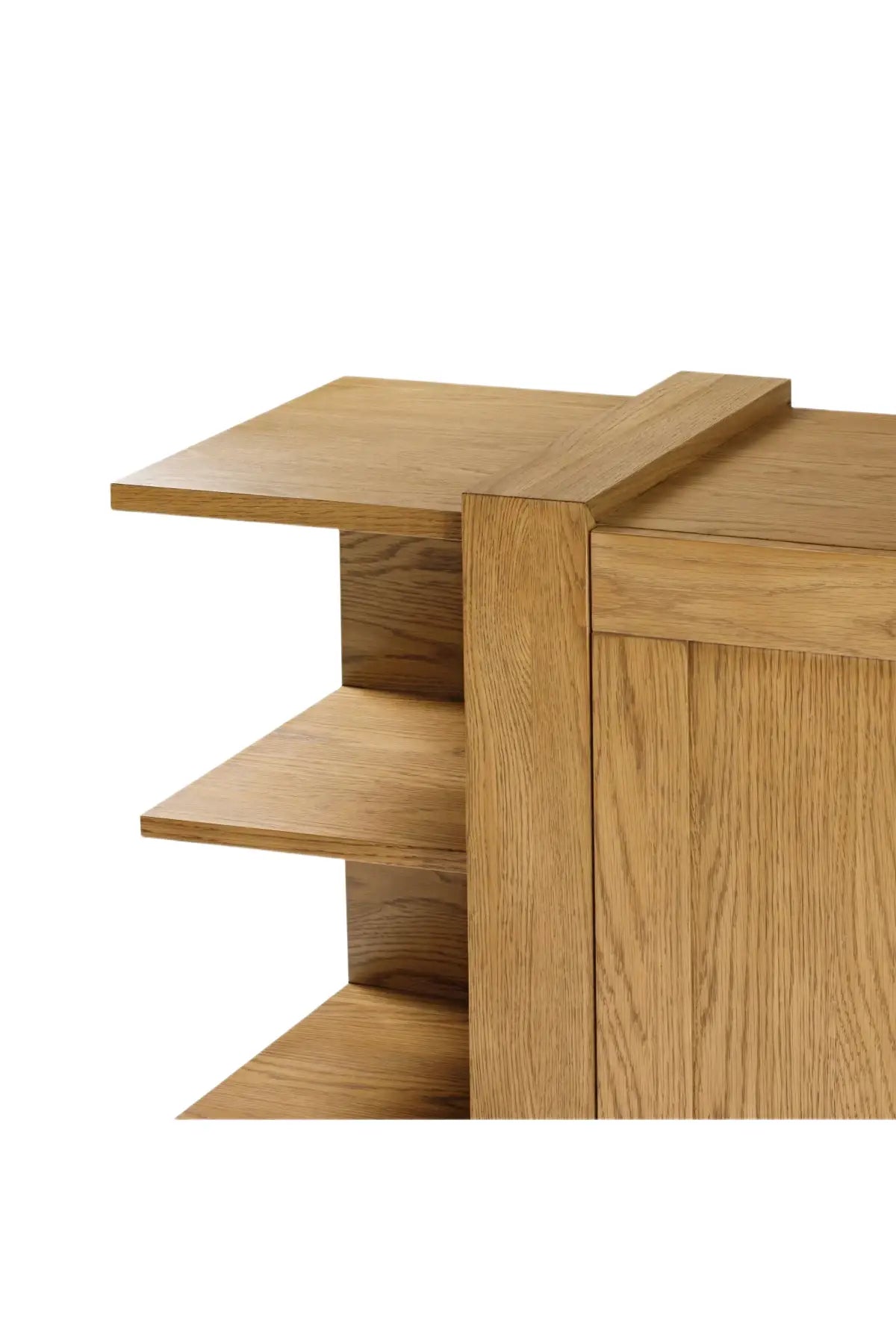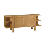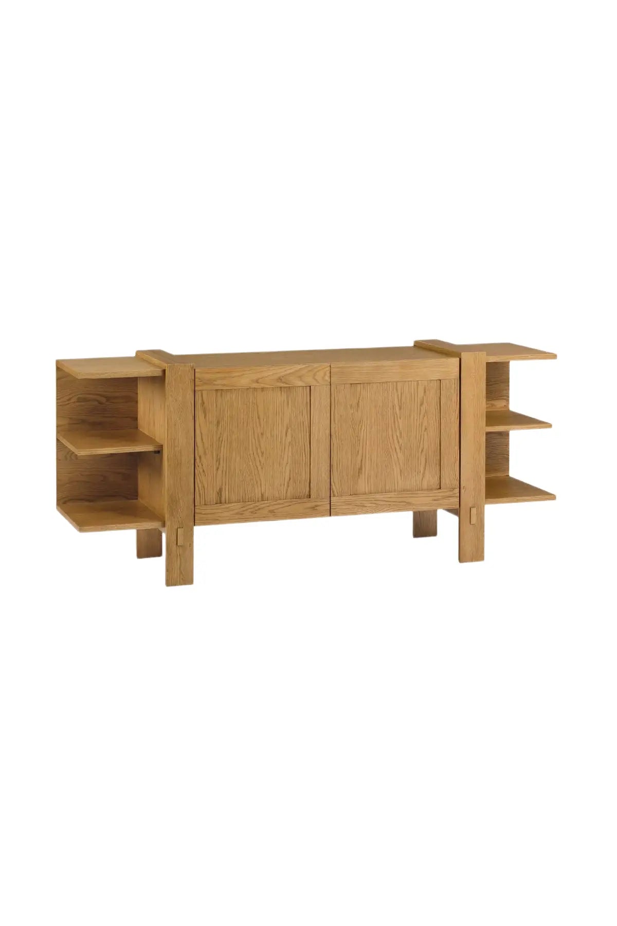 The Saguaro Oak Sideboard – a striking combination of functionality and sculptural design. Crafted from solid oak, this sideboard features open shelving flanking a 2-door cabinet, offering both display space and concealed storage. Anchored by sculptural wide plank legs, the Saguaro Oak Sideboard is a visual delight that seamlessly blends form with purpose.