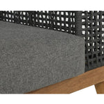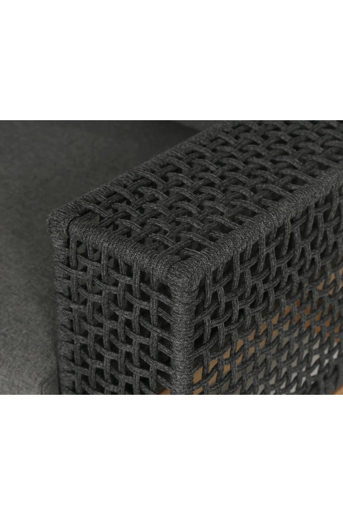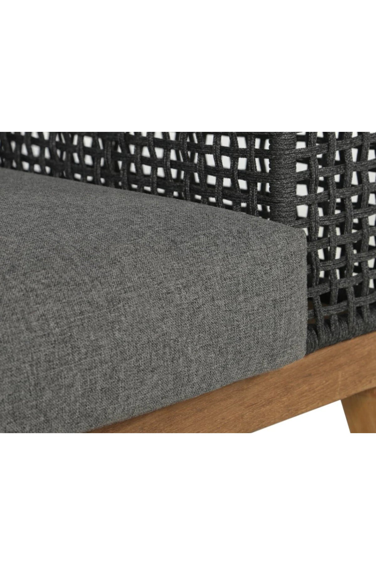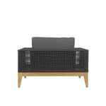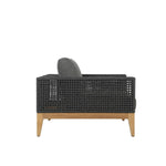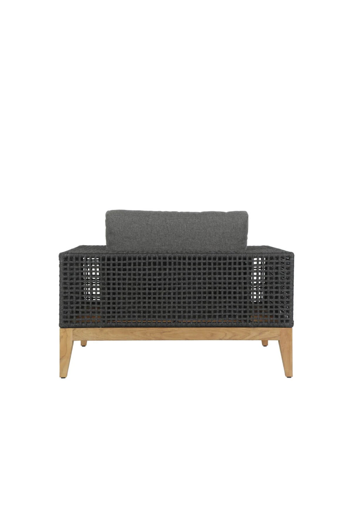 The Salerno Armchair features a deep seat in gracebay grey fabric with wide powder-coated aluminum armrests wrapped in dark greymix weave. A solid natural teak wood frame completes the design. Suitable for indoor and covered outdoor spaces. Teak wood will develop a silver-grey finish over time. Teak wood has a high oil content that enables its outdoor resistant properties. These natural oils may surface and potentially leave teak marks on fabrics upon contact, which can be easily washed away.