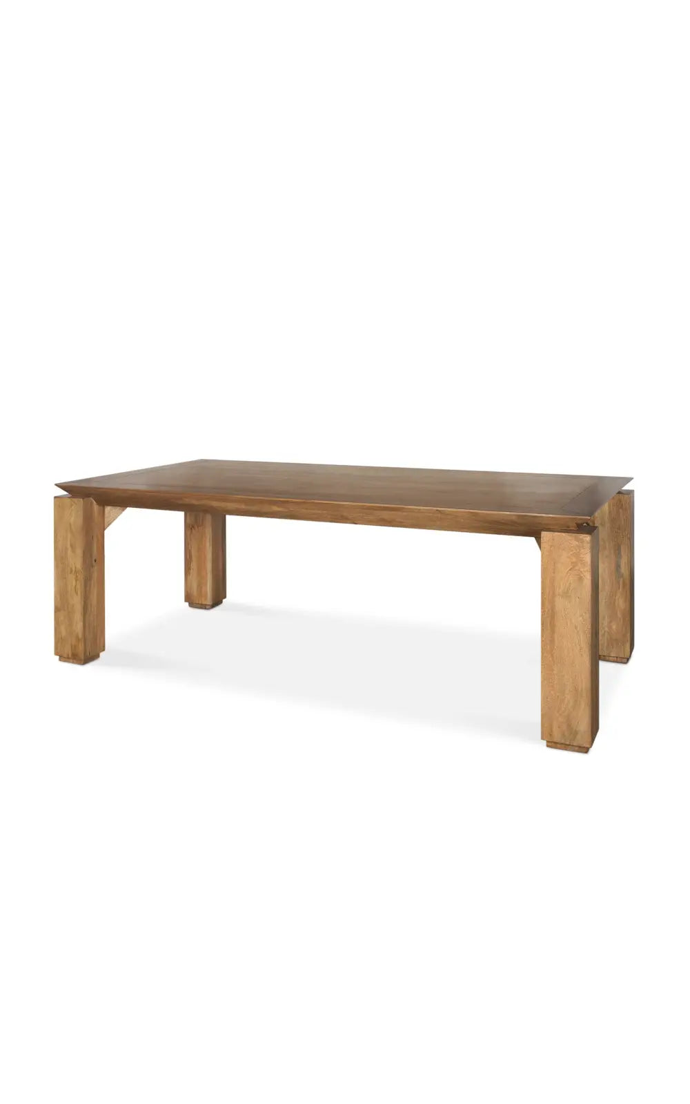 Meet the Sapphira Dining Table. This dining table exudes a timeless charm with its solid wood construction and natural finish. Its rectangular design, supported by sturdy block legs, offers durability and a minimalist aesthetic that complements a variety of interior styles.
