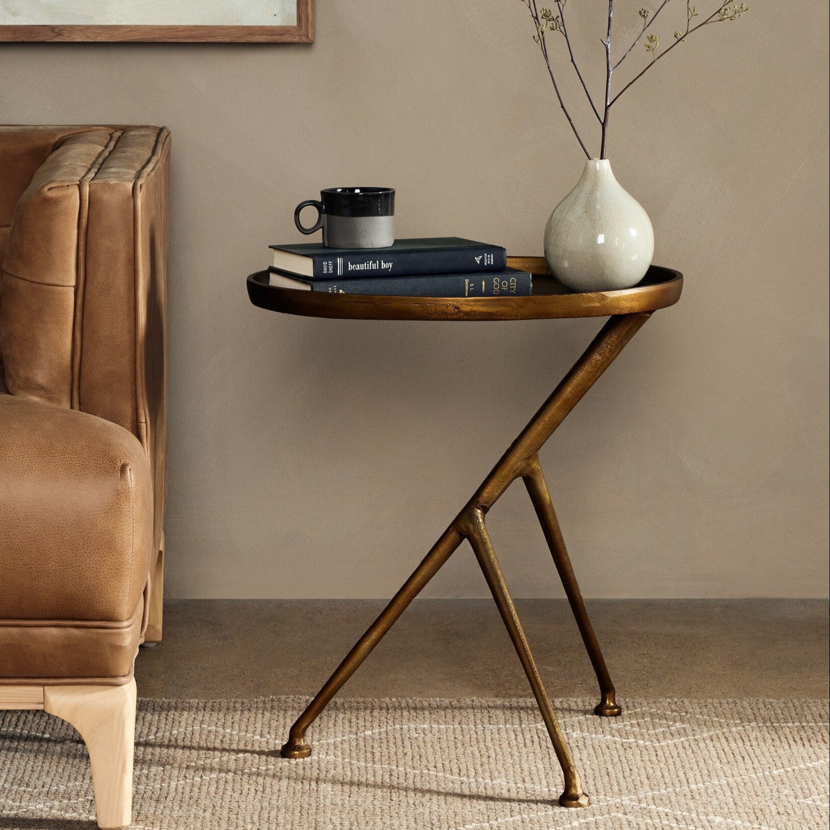 Meet the Schmidt Accent Table. The tripod table with a cleverly balanced twist. Angular cast aluminum is finished in raw brass to bring out highs and lows. Great indoors or out — cover or store indoors during inclement weather and when not in use.