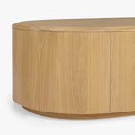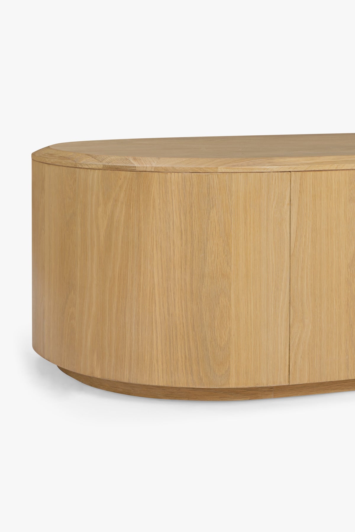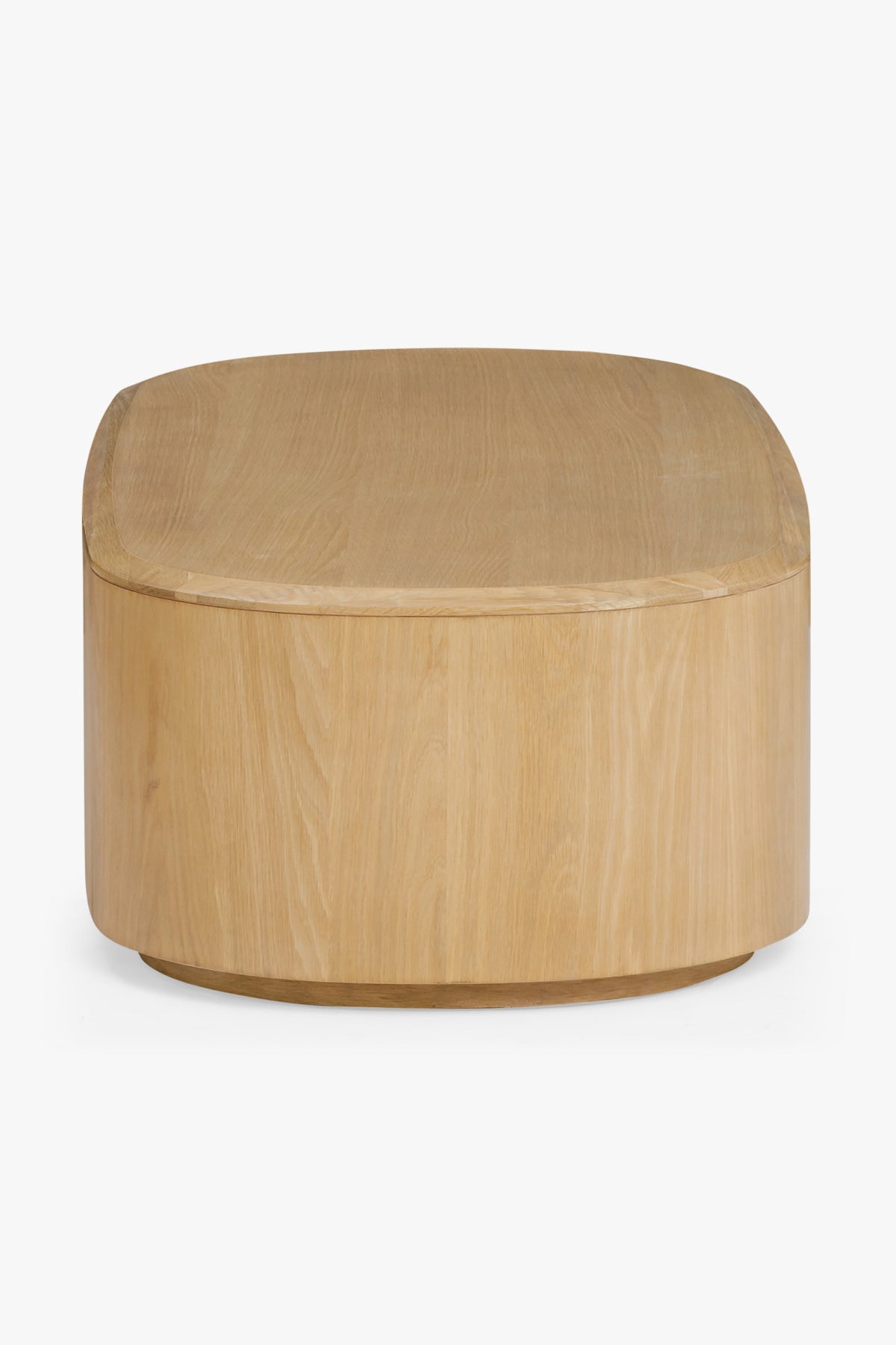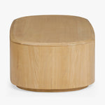 The Serena Oval Coffee Table is designed in a bold island-like shape, with a recessed plinth giving it a floating appearance. The beveled wood top highlights the tables organic lines.