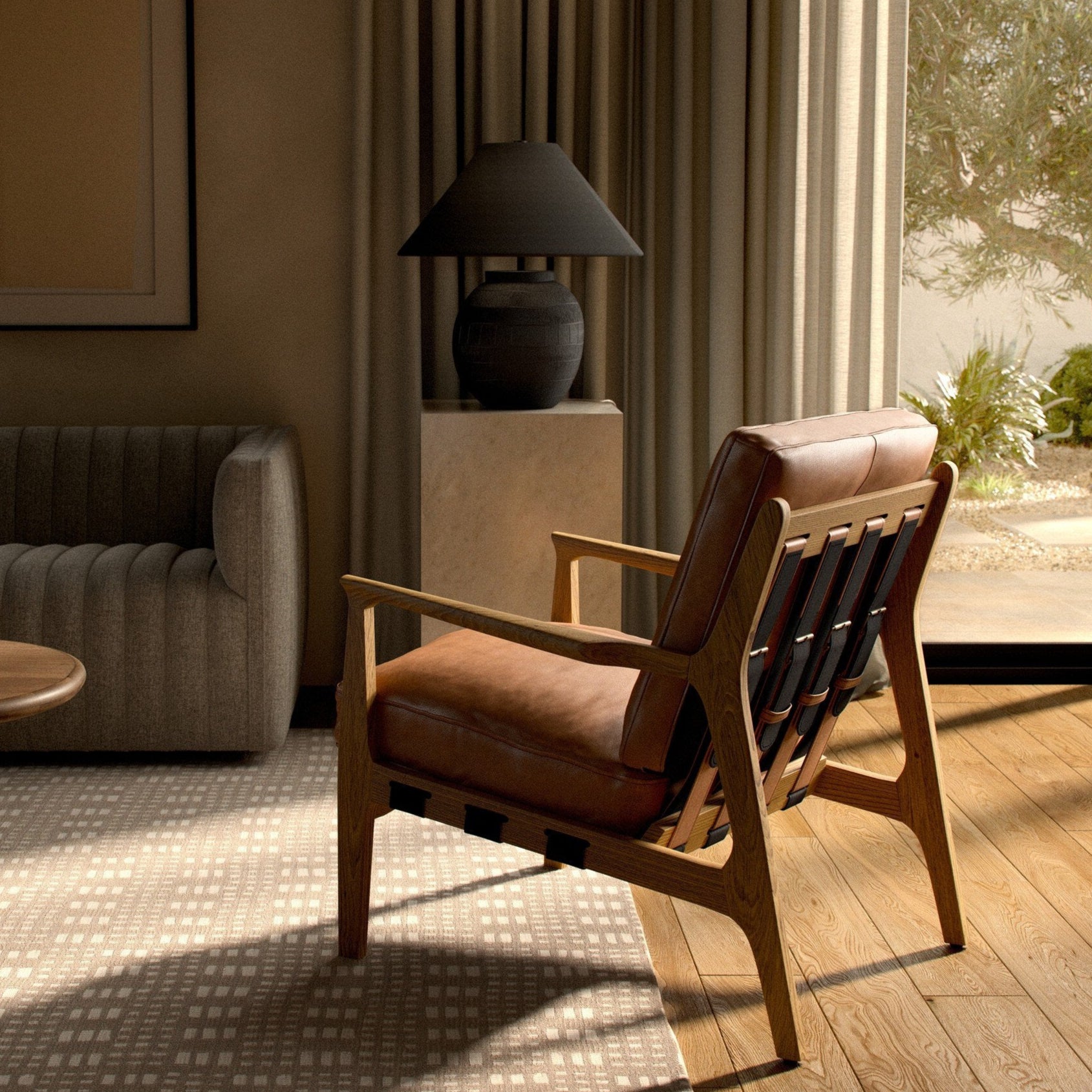 Meet the Silas Chair. A striking silhouette with design-forward details any way you look at it. Top-grain, hand-finished leather sits in a natural ash wood frame held by parachute strapping made of canvas, leather and metal buckles.