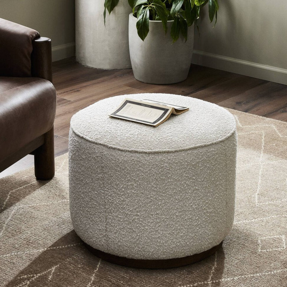 Meet the Sinclair Round Ottoman - Knoll Natural. This round ottoman of textural cream boucle can be placed just about anywhere, bringing with it a hip retro vibe.