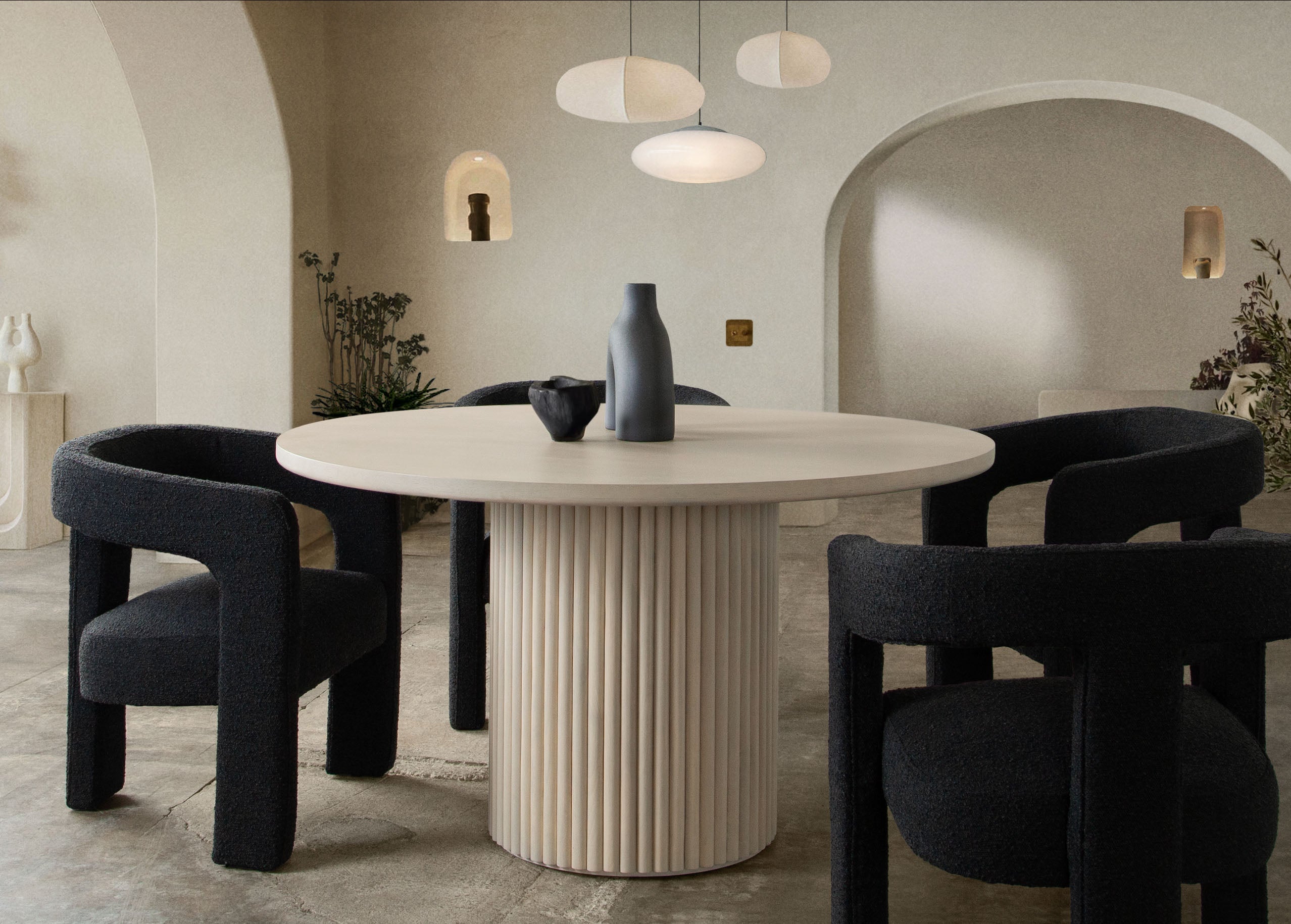 Gather round the Siren Dining Table at your next get-together. Simple in shape, but rich in design and details with its hand-carved fluted pedestal base. The Siren Dining Table is finished in a subtle Almond Grey finish to blend with any room's surroundings for any occasion.