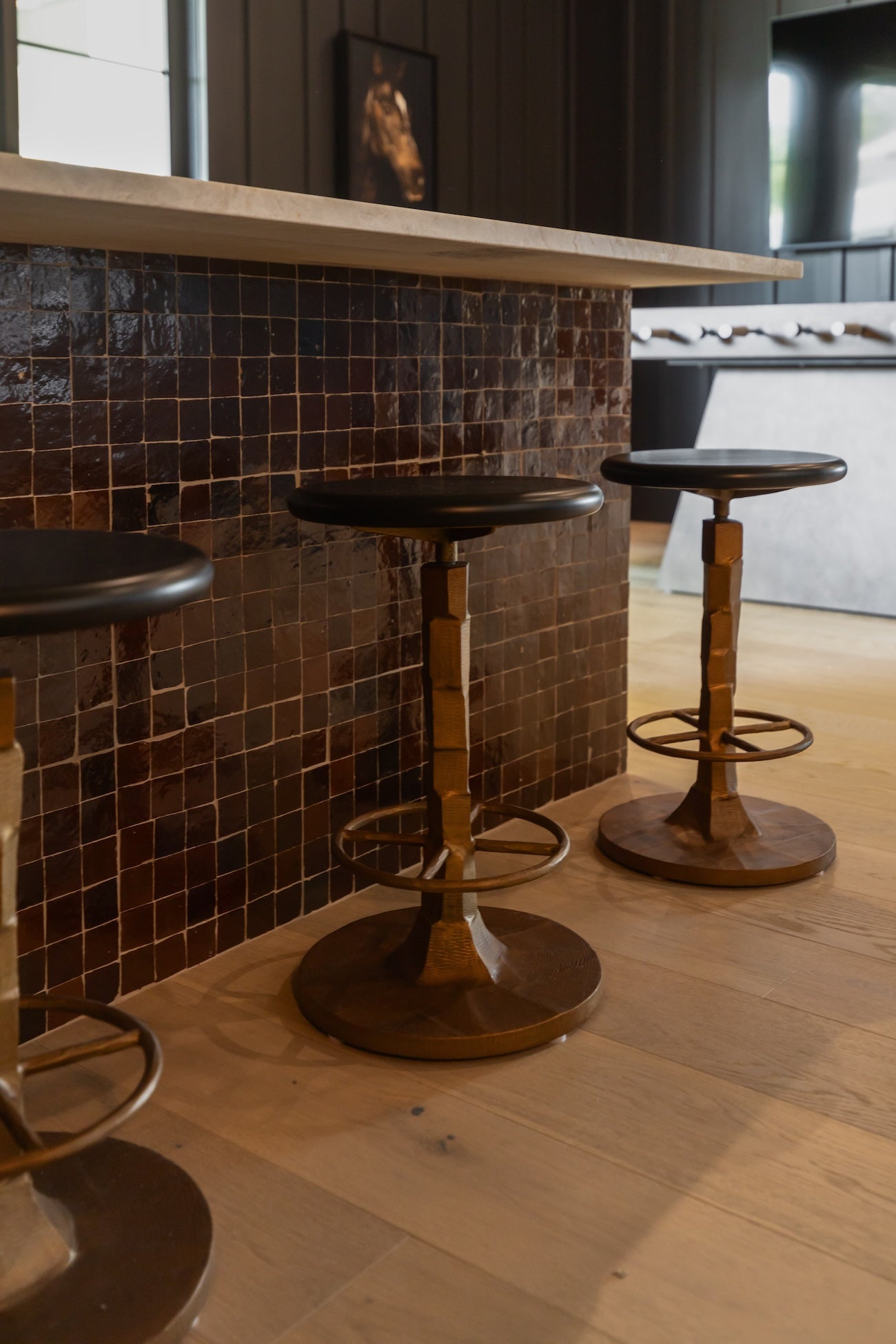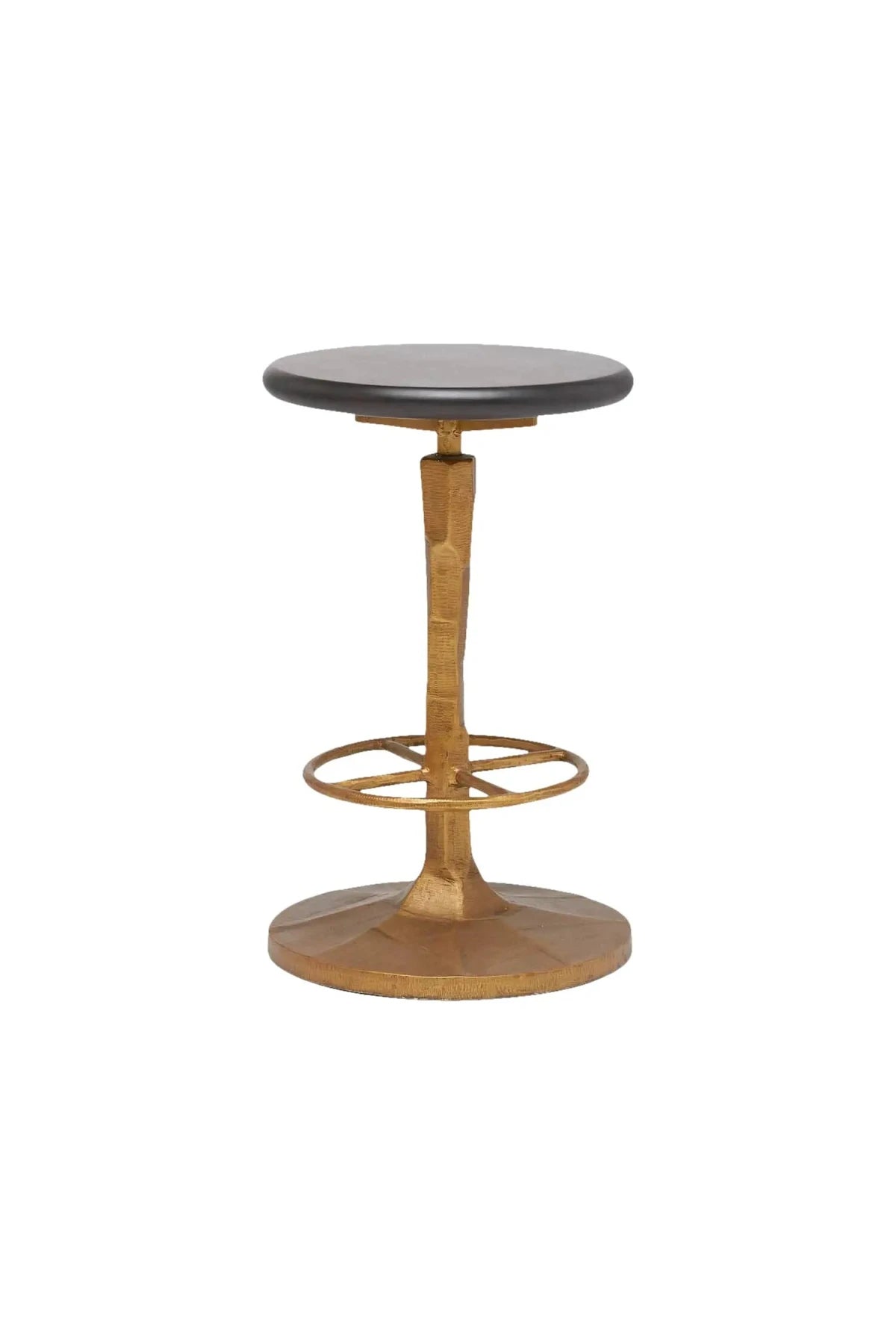 Meet the classic Solon Bar + Counter Stool. The tapered base of our Solon has a sculptural feel thanks to its carved aesthetic the Black finish augments iron's solid quality while the Aged Brass finish gives it a nice metallic warmth. A slim round seat keeps the silhouette simple, and the crisscross footrest is a fun, functional detail.