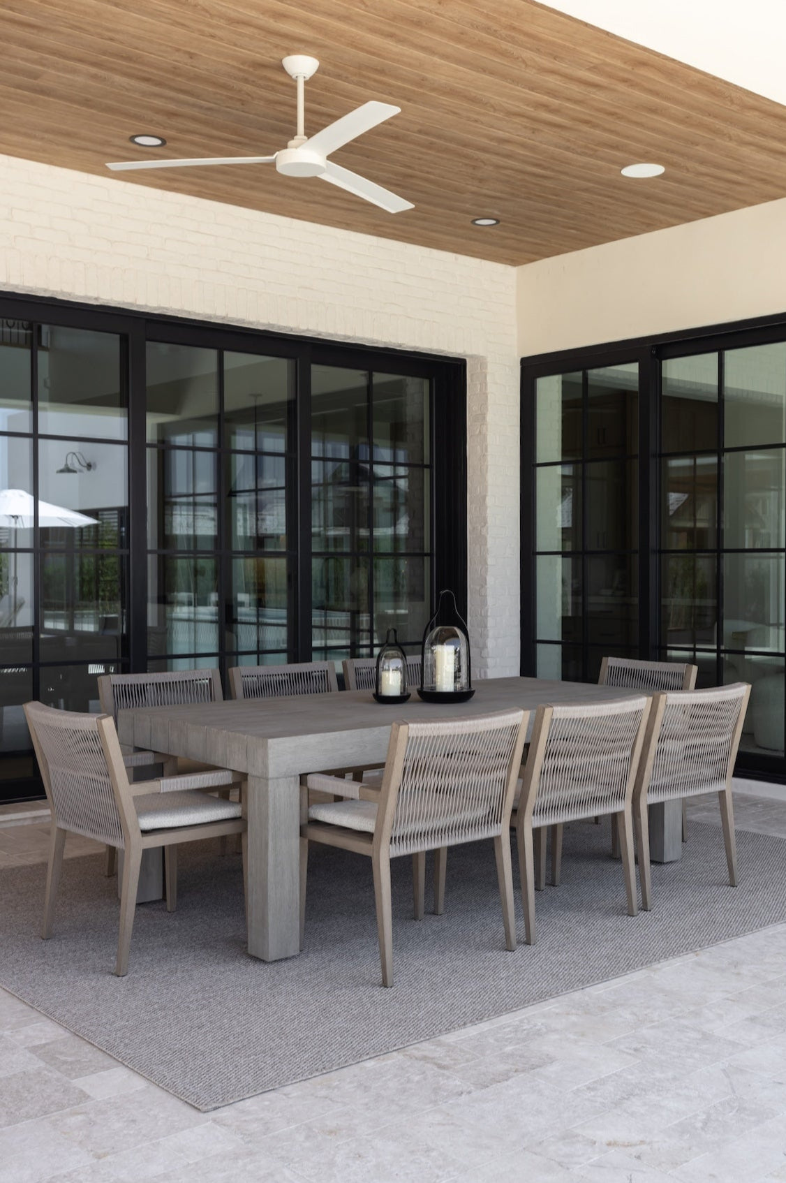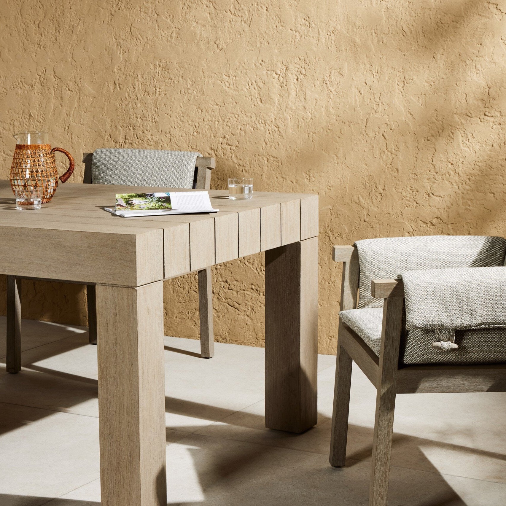 Meet the Sonora Outdoor Dining Table. Organic elements, indoors or out. Teakwood is fashioned into a clean-lined dining table and weathered to a natural grey. Safe for outdoor use — cover or store indoors during inclement weather and when not in use.