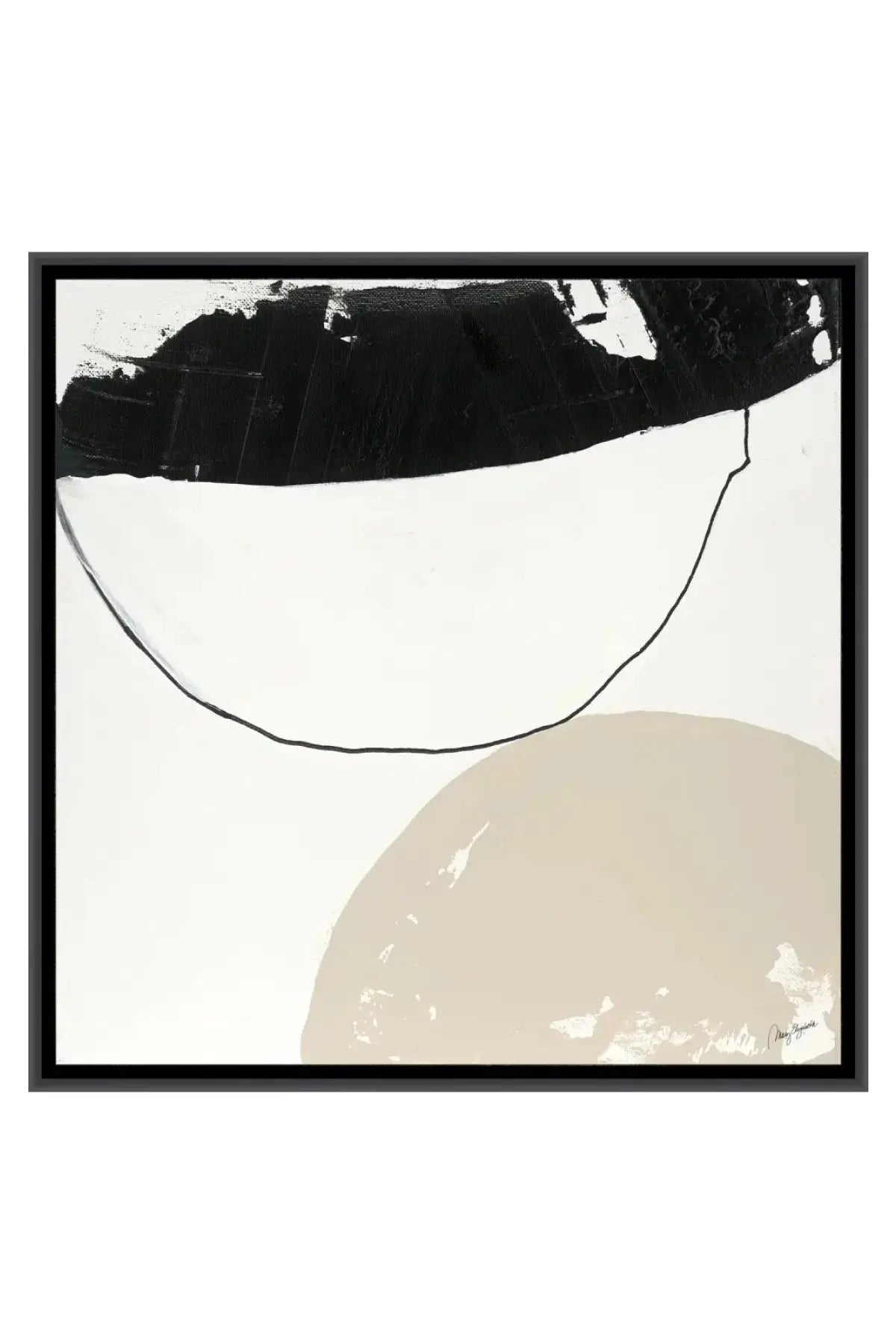 Meet the Steady Habit 1 Wall Art. This abstract artwork features a composition of black and beige circular shapes against a white background, creating a harmonious balance of form and minimalistic elegance. Printed as a fine art giclée on premium artist-grade canvas, ensuring exceptional color accuracy and detail for a gallery-quality piece. A gel finish is a hand-applied with brushstrokes that follow the contours of the original image, adding a subtle and authentic texture. Crafted from sustainable polystyrene, the floater frame creates a striking effect by suspending the artwork within the frame, adding depth and a touch of modern elegance. Professionally framed and ready to hang.