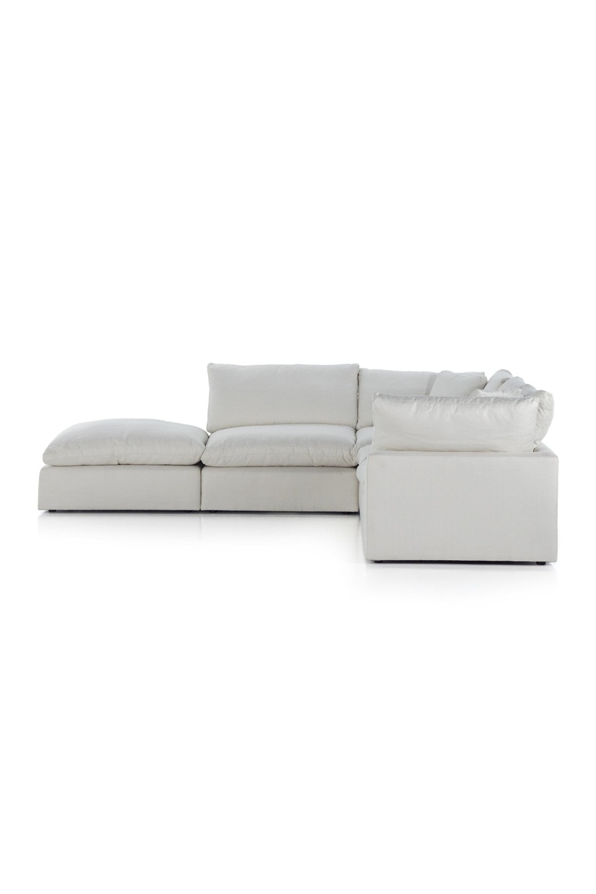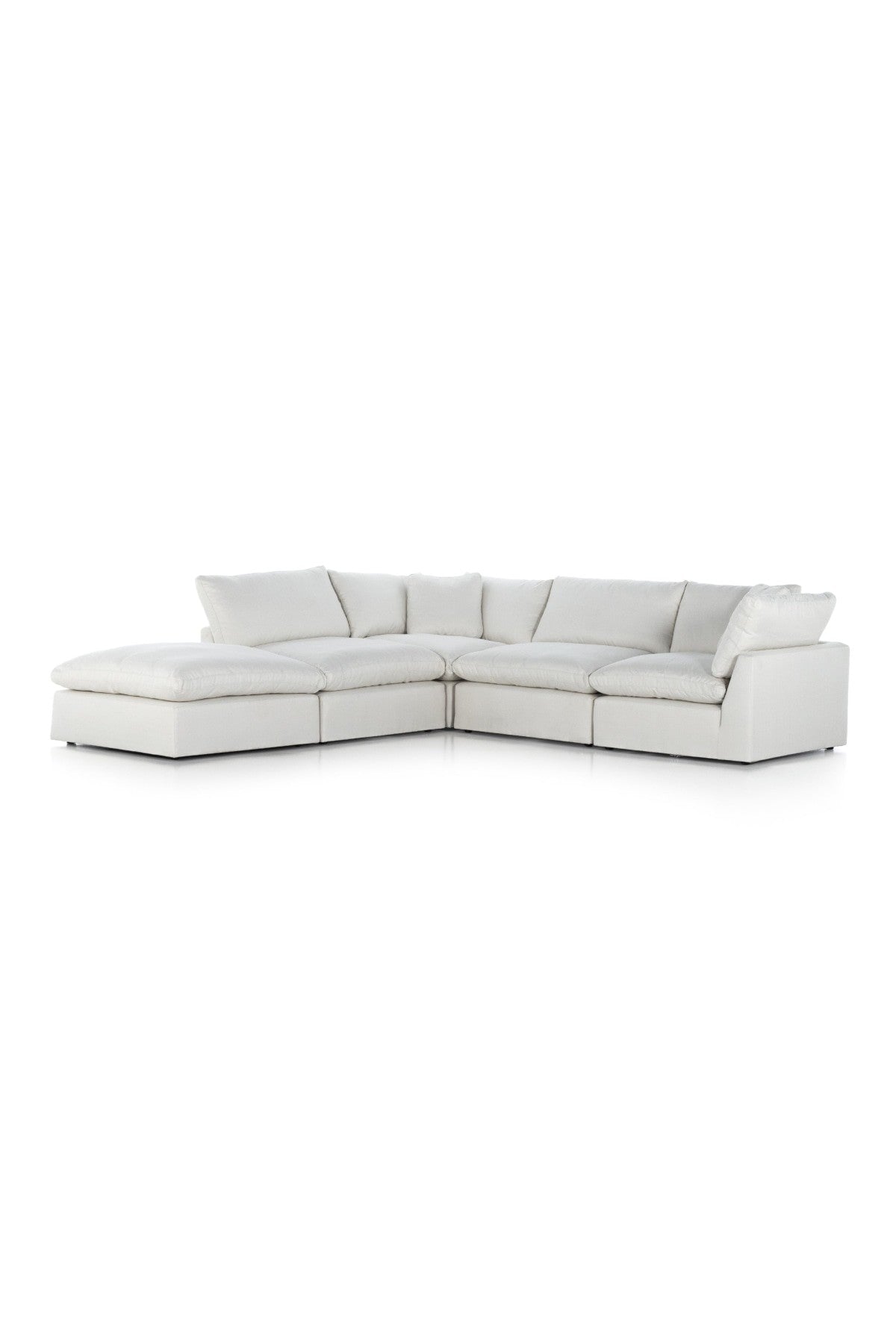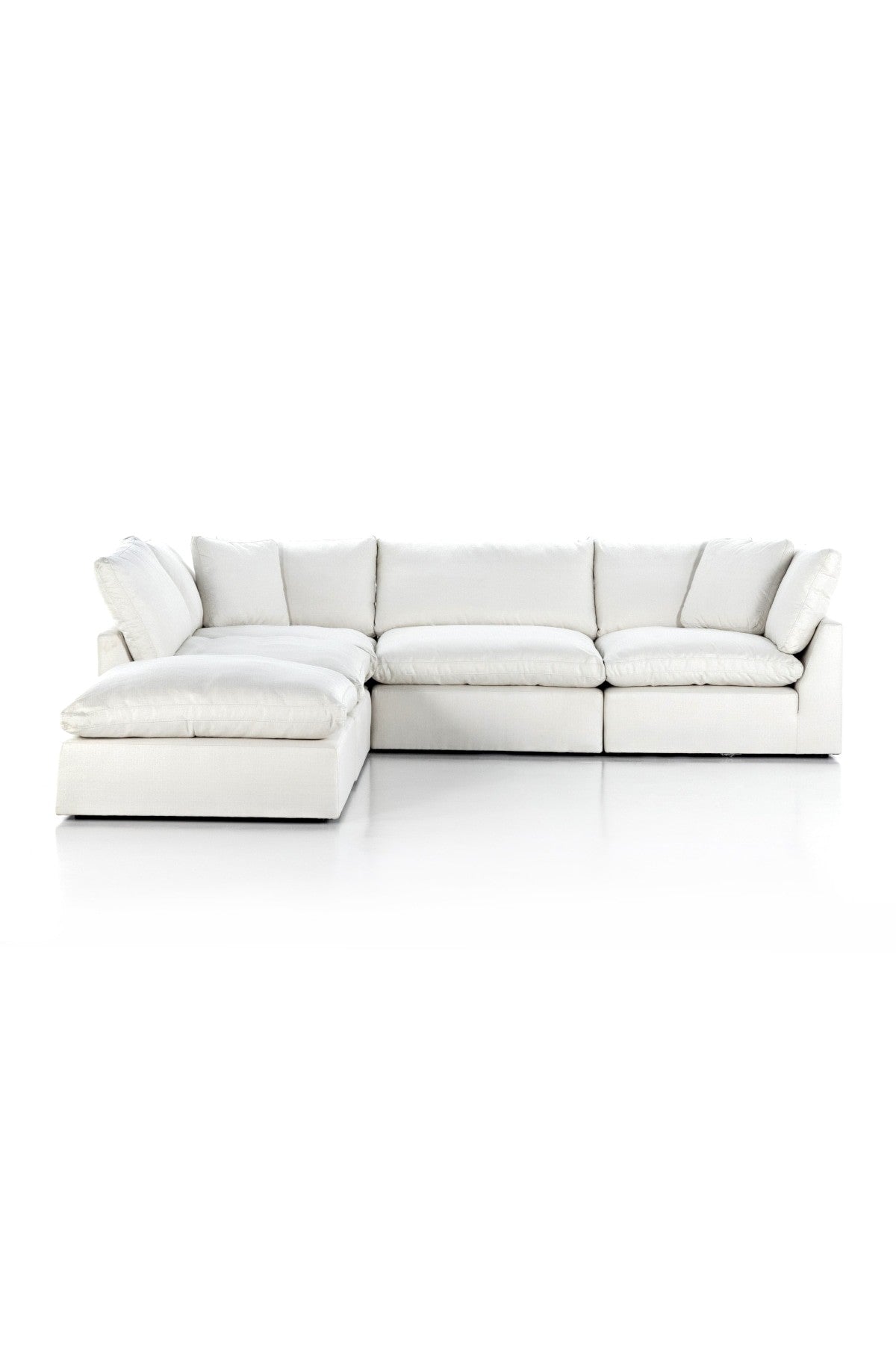 Meet the Stevie 4-Piece Sectional W/ Ottoman. This 4-Piece Sectional with Ottoman offers stylish comfort with durable, stain-resistant fabric and feather-blend cushions. Its modular design fits any space, making it a smart and elegant addition to your home.