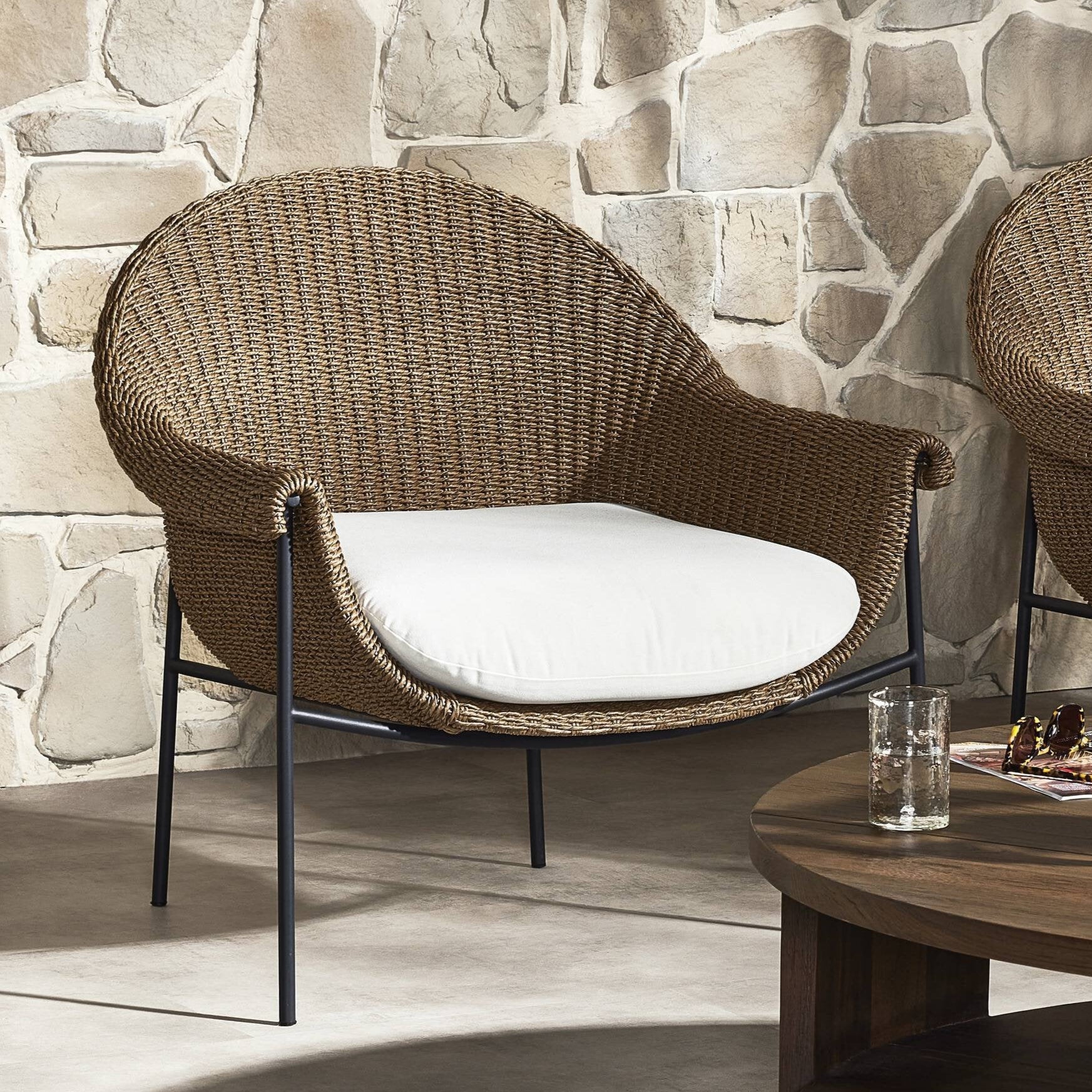 Meet the Suerte Outdoor Chair. With a curvy silhouette and classic rolled arms, brown woven hyacinth adds texture to vintage-inspired outdoor accent seating, complemented by an airy iron cradle base for a beautiful balance of scale. Cover or store indoors during inclement weather and when not in use.