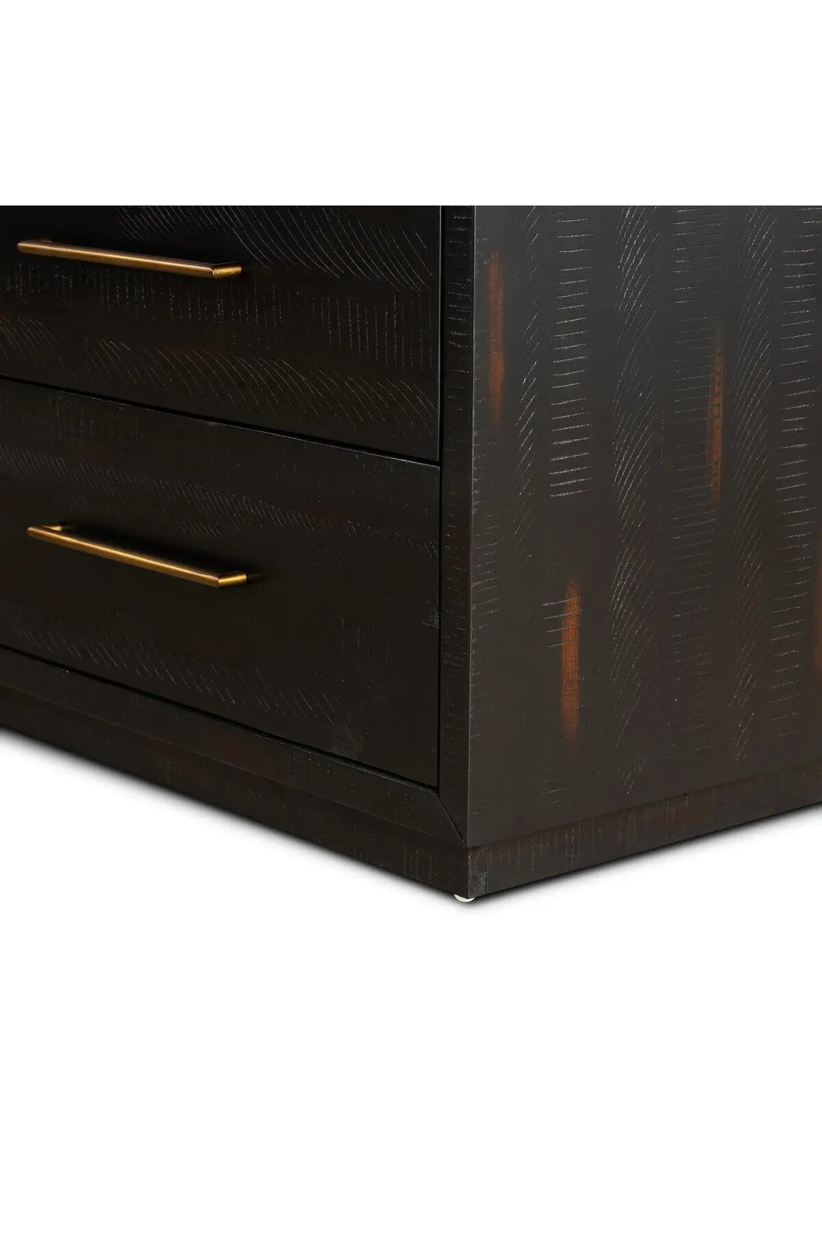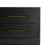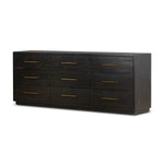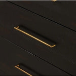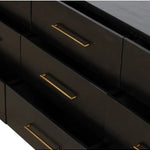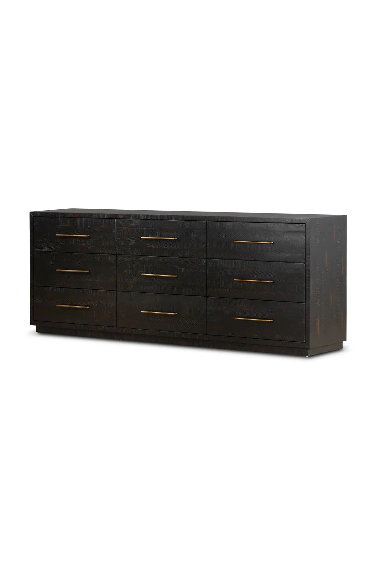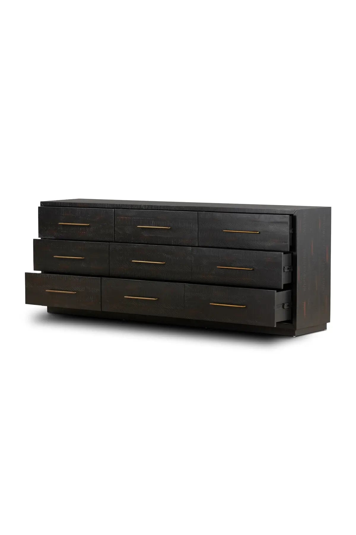 Meet the Suki 9 Drawer Dresser. The Suki 9 Drawer Dresser is simple sophistication with a modern edge. Solid acacia forms long, clean lines to lighten the natural depth of a burnished black finish. Brass-finished hardware adds a sleek touch to nine spacious drawers.