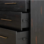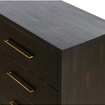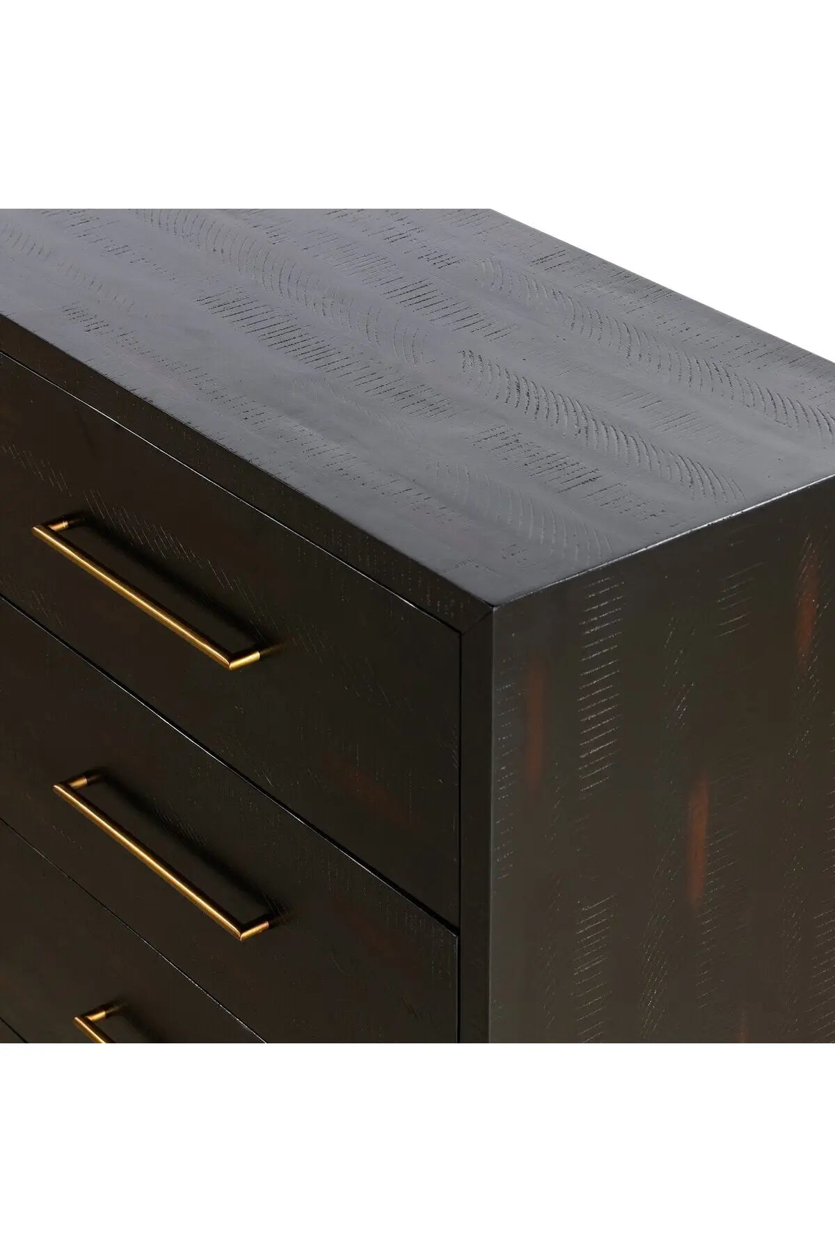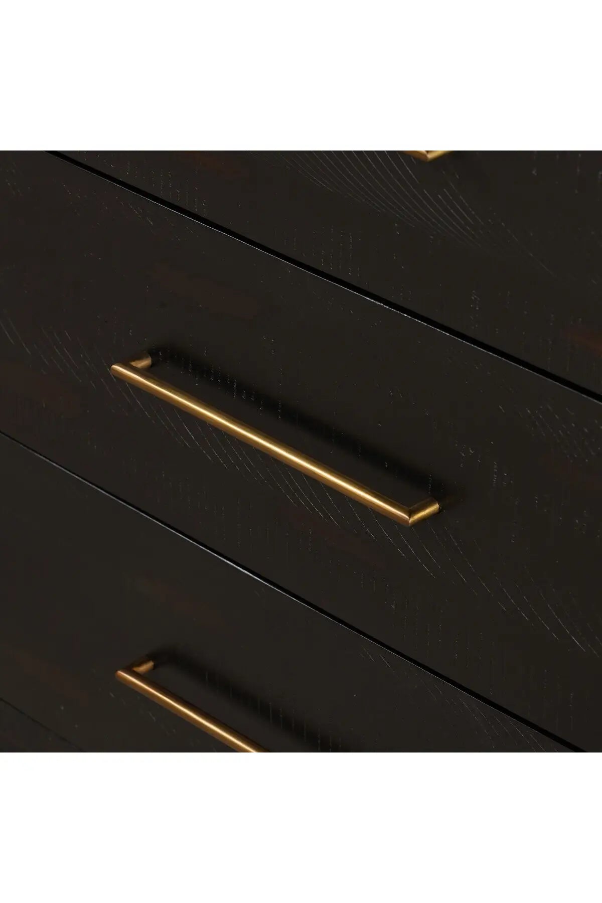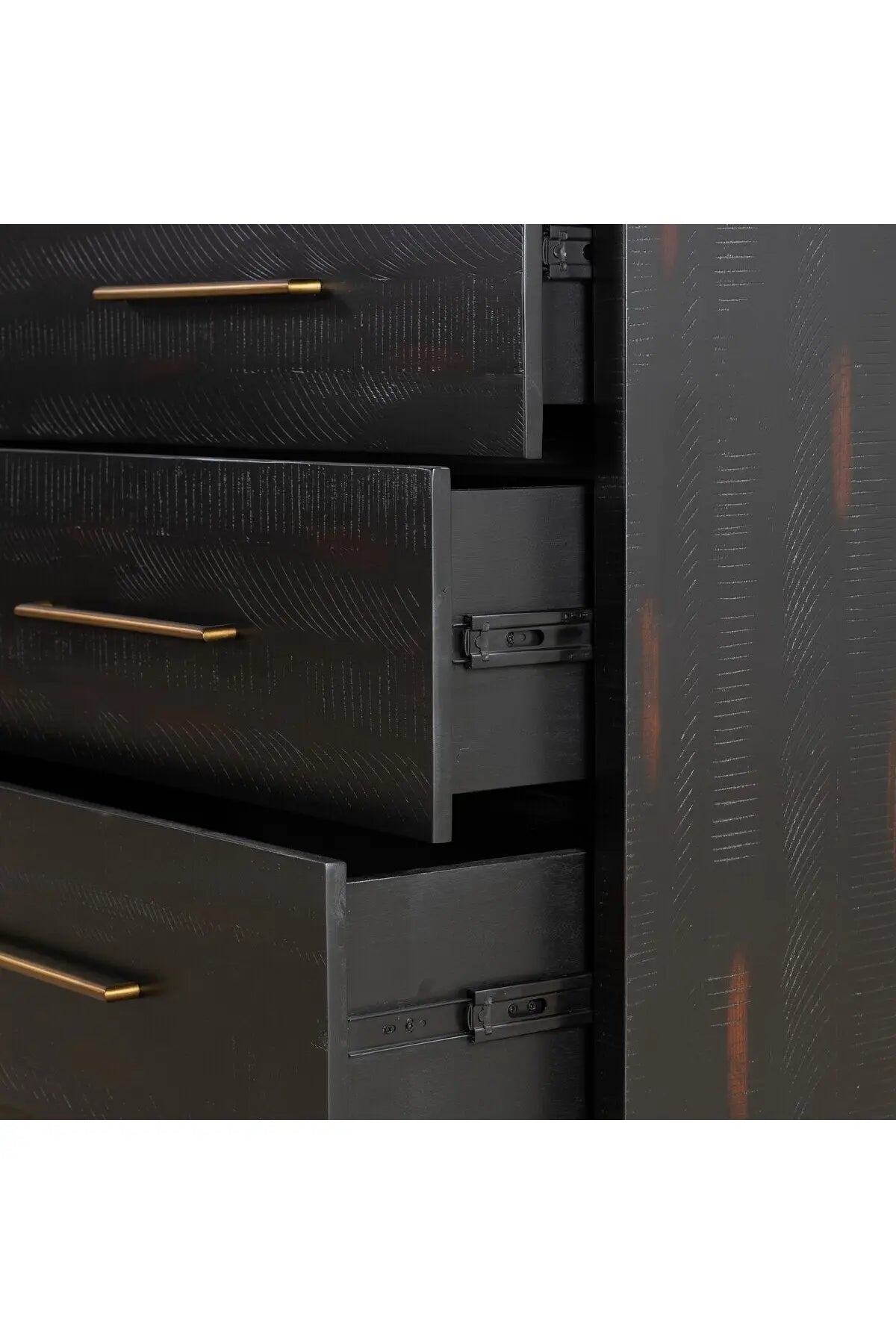 Meet the Suki 9 Drawer Dresser. The Suki 9 Drawer Dresser is simple sophistication with a modern edge. Solid acacia forms long, clean lines to lighten the natural depth of a burnished black finish. Brass-finished hardware adds a sleek touch to nine spacious drawers.