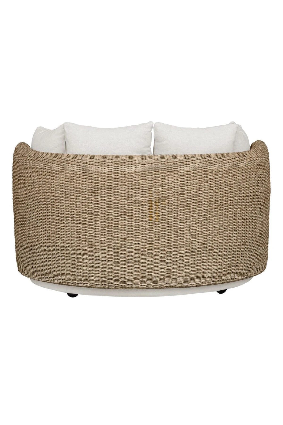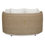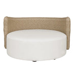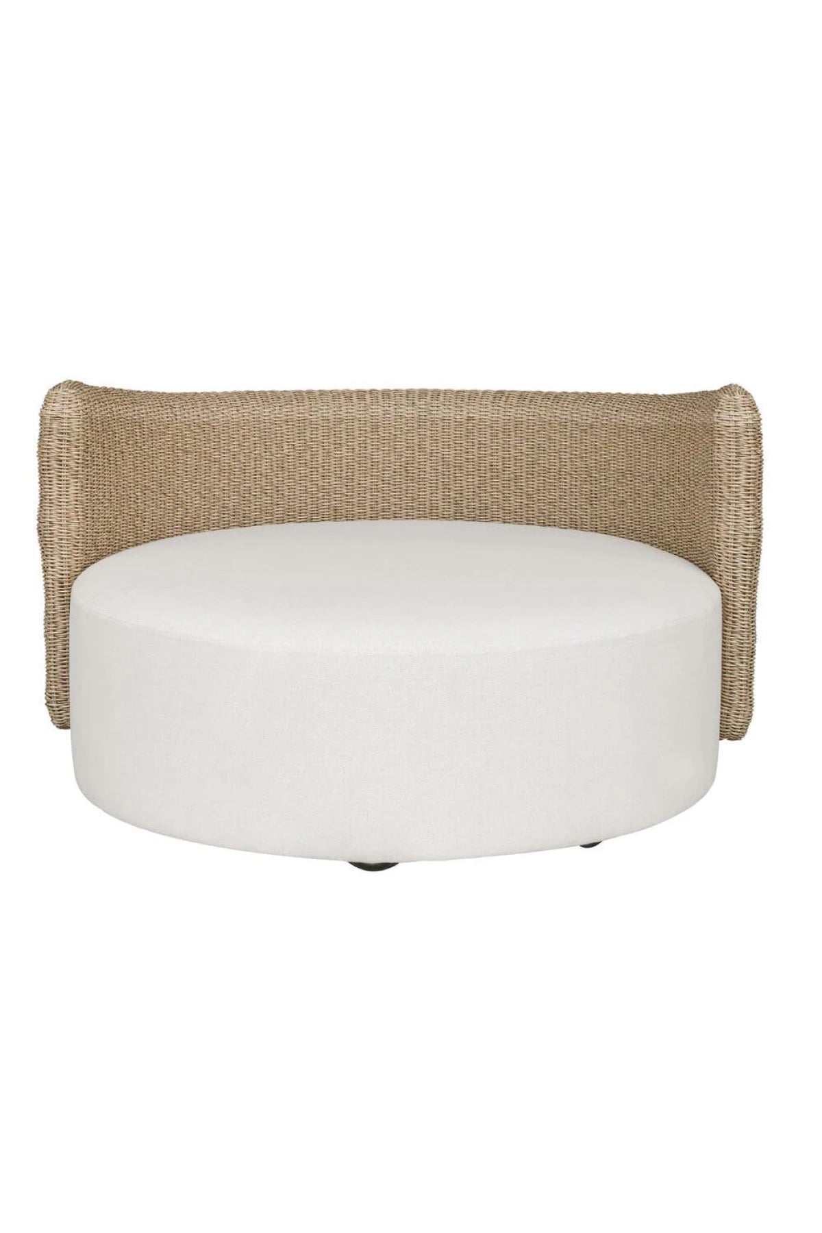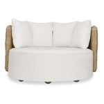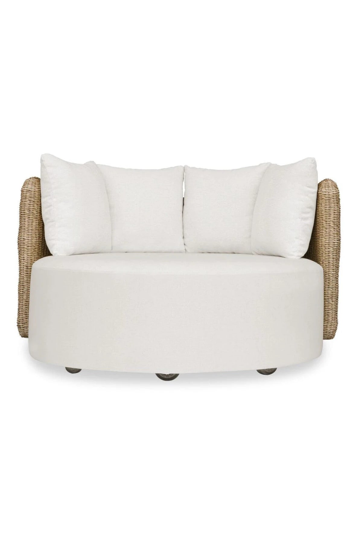 Unwind in the sun with the inviting Sunset Outdoor Swivel Day Bed. Featuring an oversized, sculpted back that is hand woven in twisted oatmeal all-weather wicker. Its plush seat and throw pillows are upholstered in oyster white solution dyed acrylic fabric designed to withstand the moisture and dirt that comes with outdoor use.