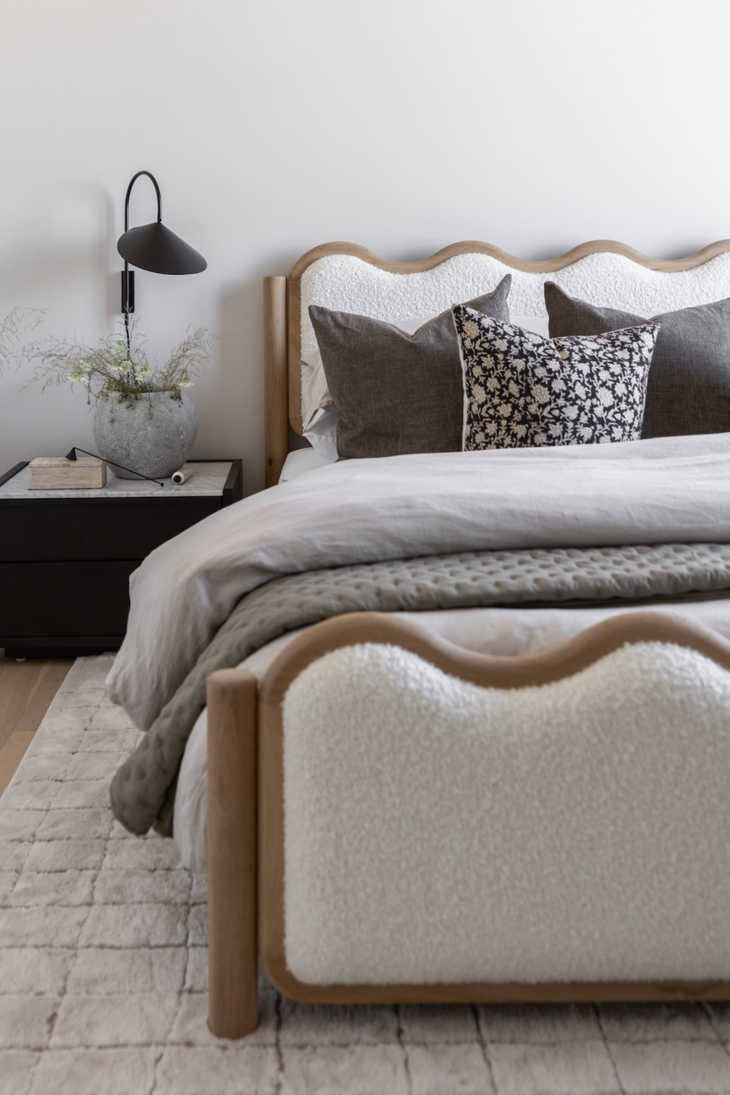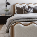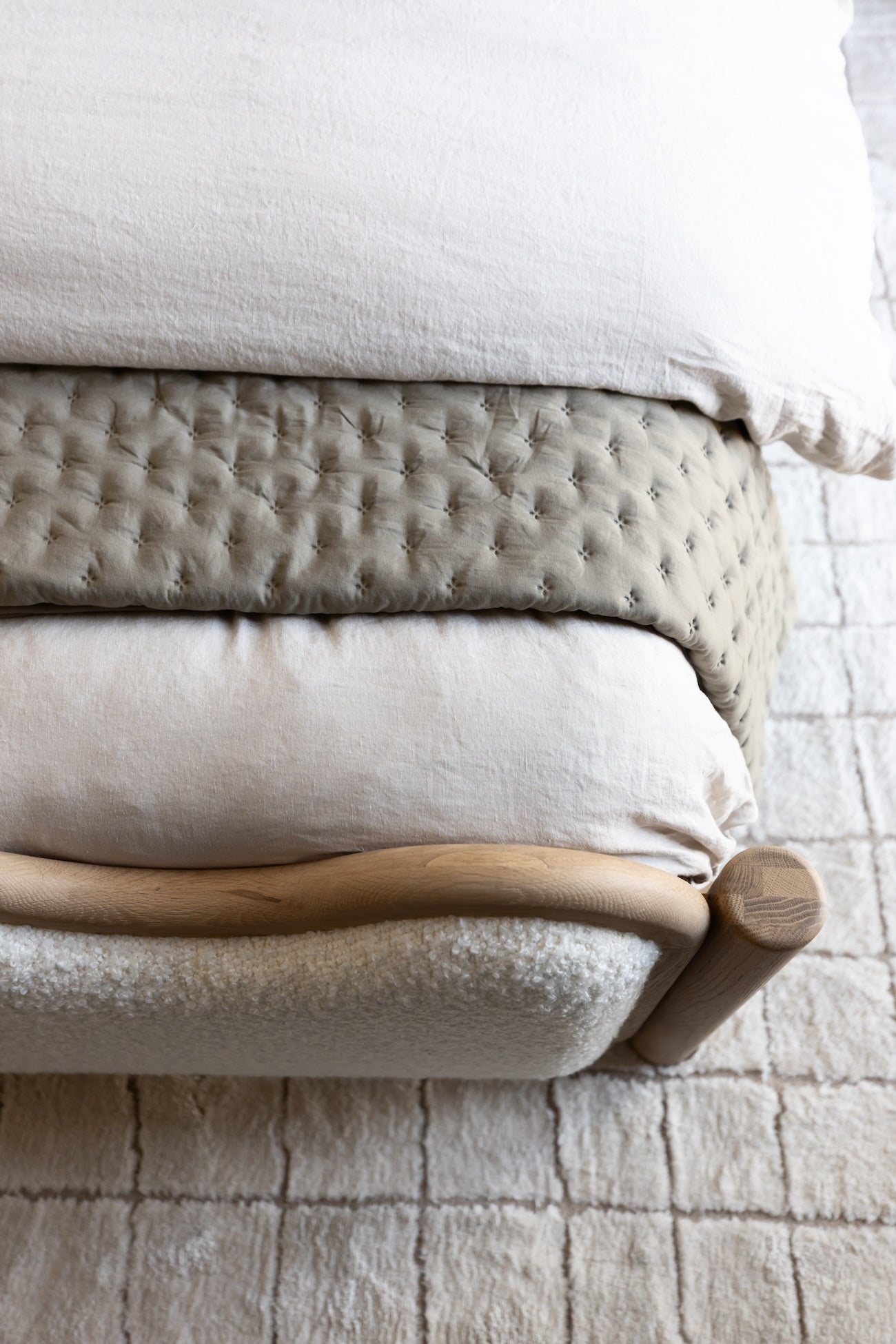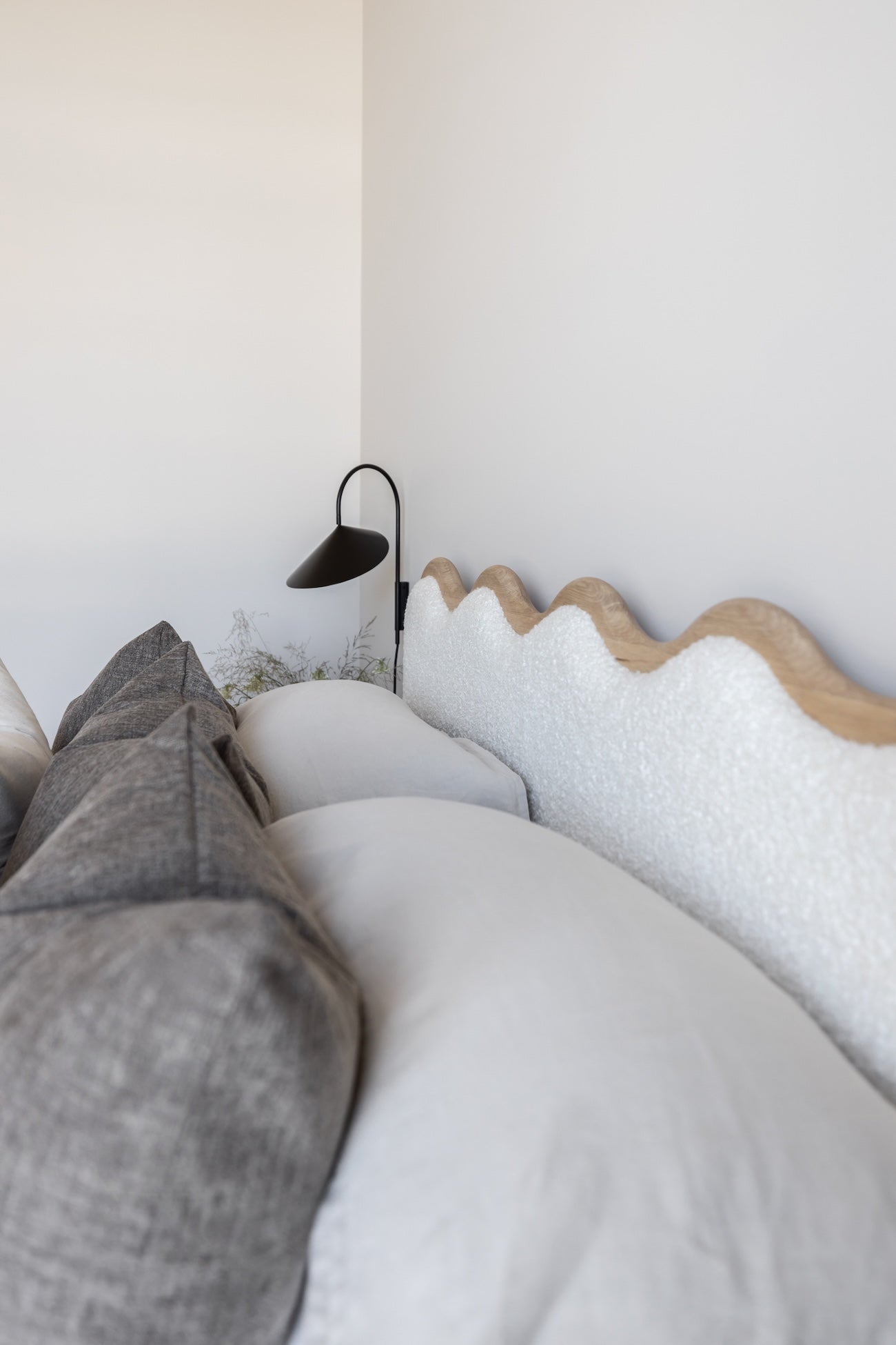 Dynamic in form, our Swirl Bed will add a touch of whimsy to your bedroom. A solid, FSC-certified Oak surround frames a soft, upholstered boucle head and footboard with a soft, wavy edge. Slats included.