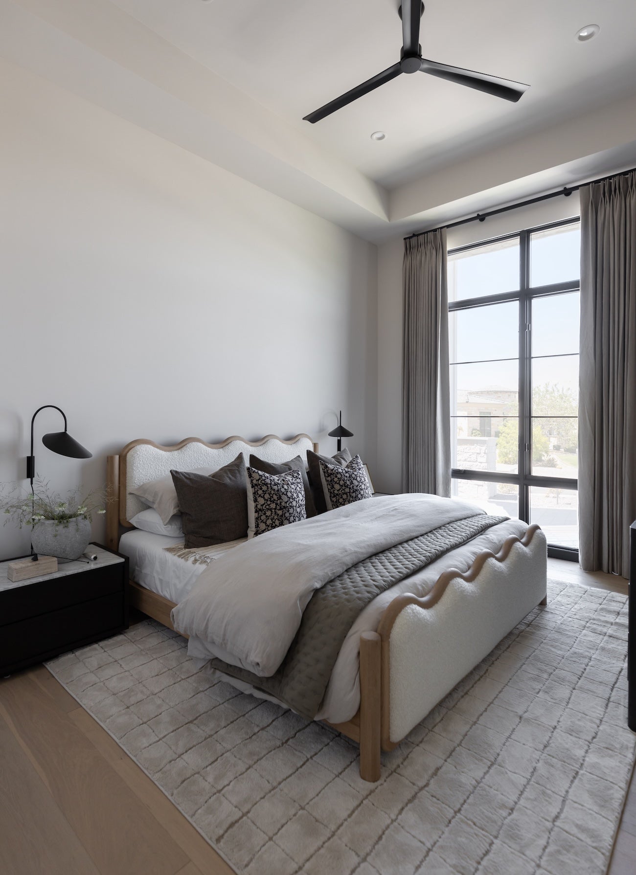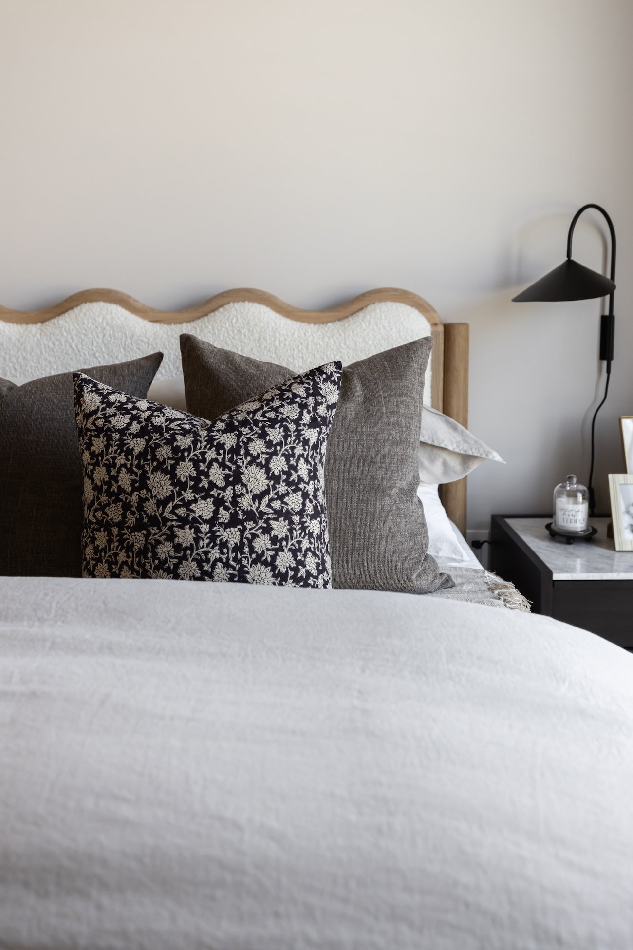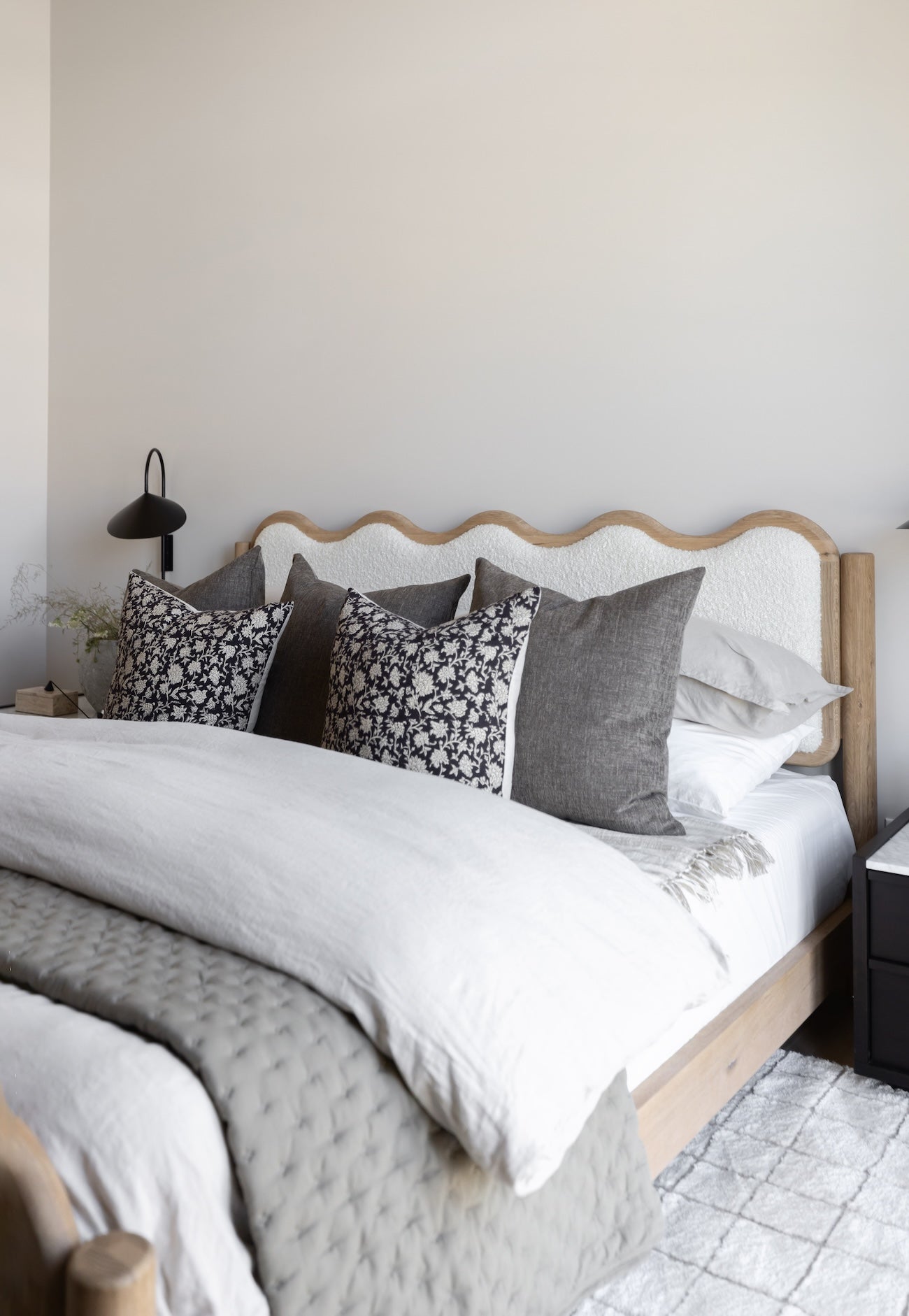 Dynamic in form, our Swirl Bed will add a touch of whimsy to your bedroom. A solid, FSC-certified Oak surround frames a soft, upholstered boucle head and footboard with a soft, wavy edge. Slats included.
