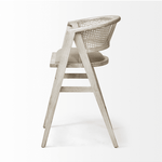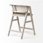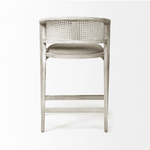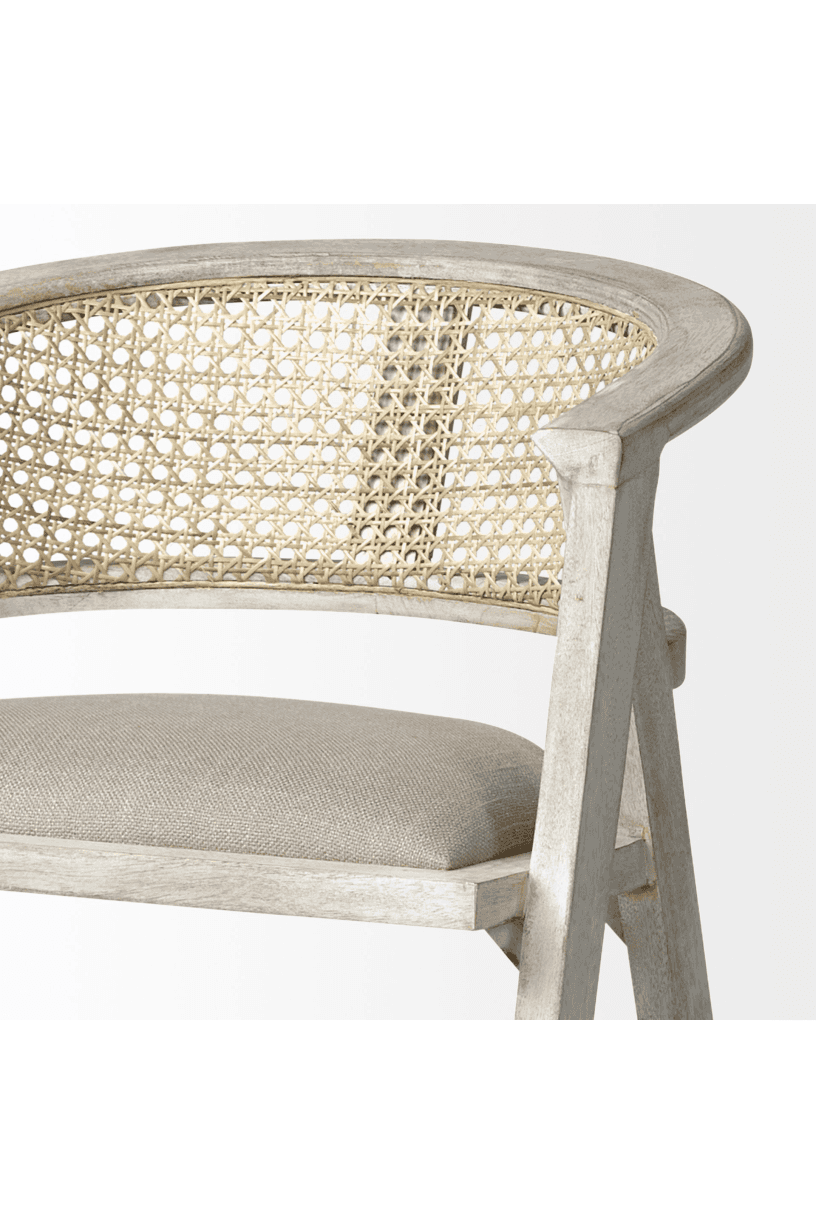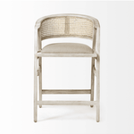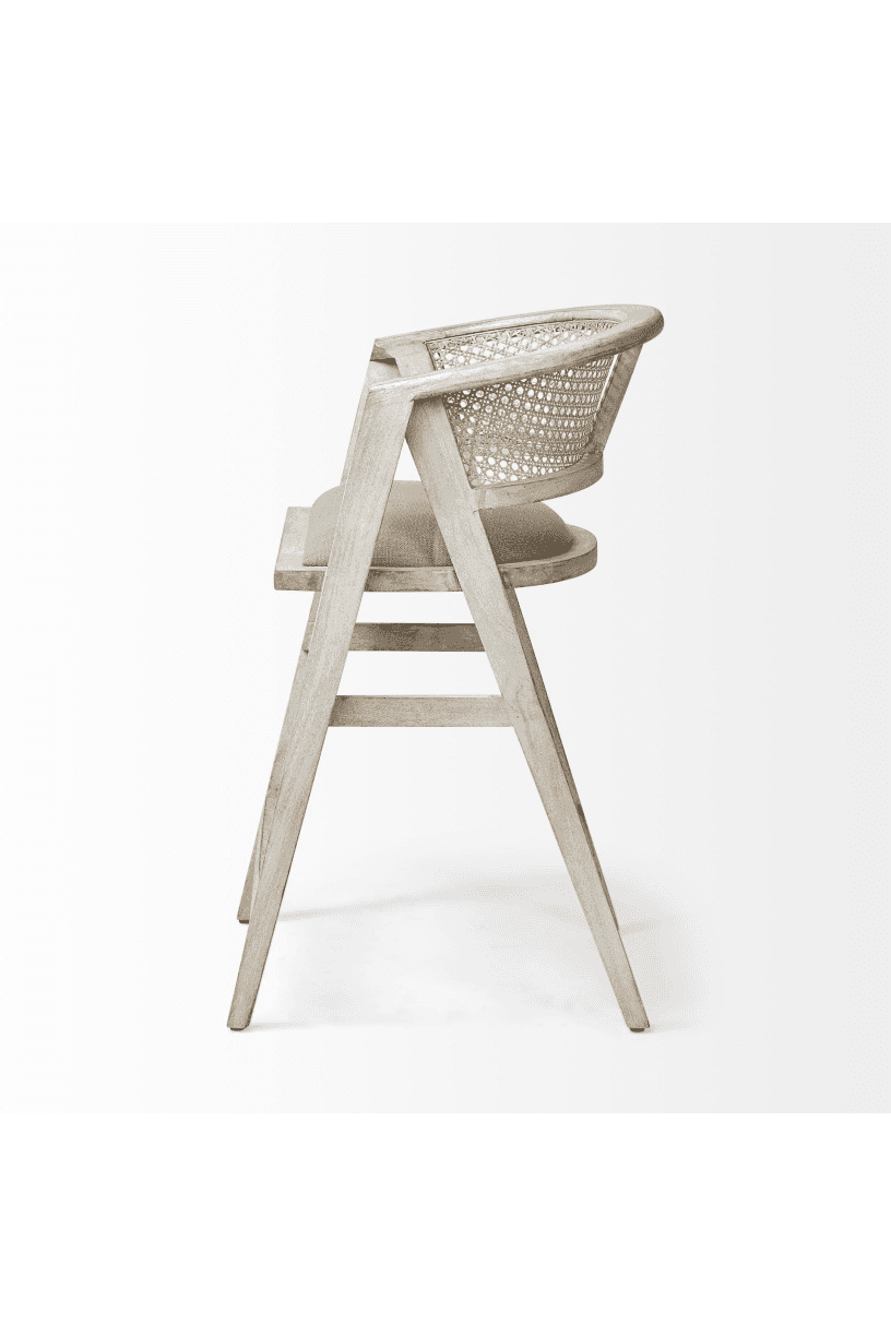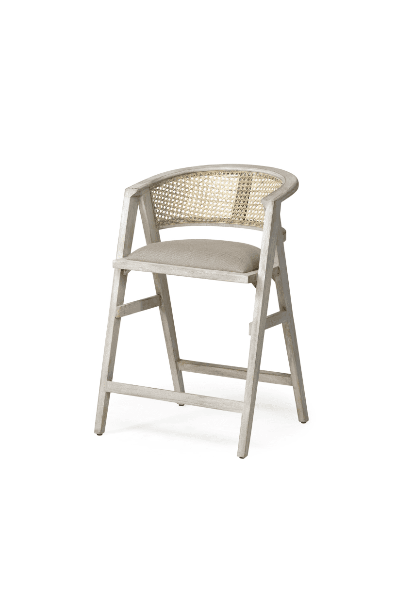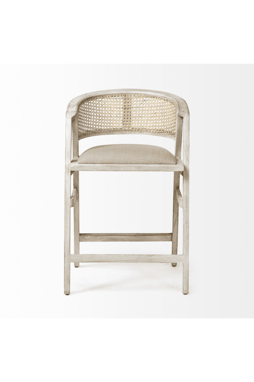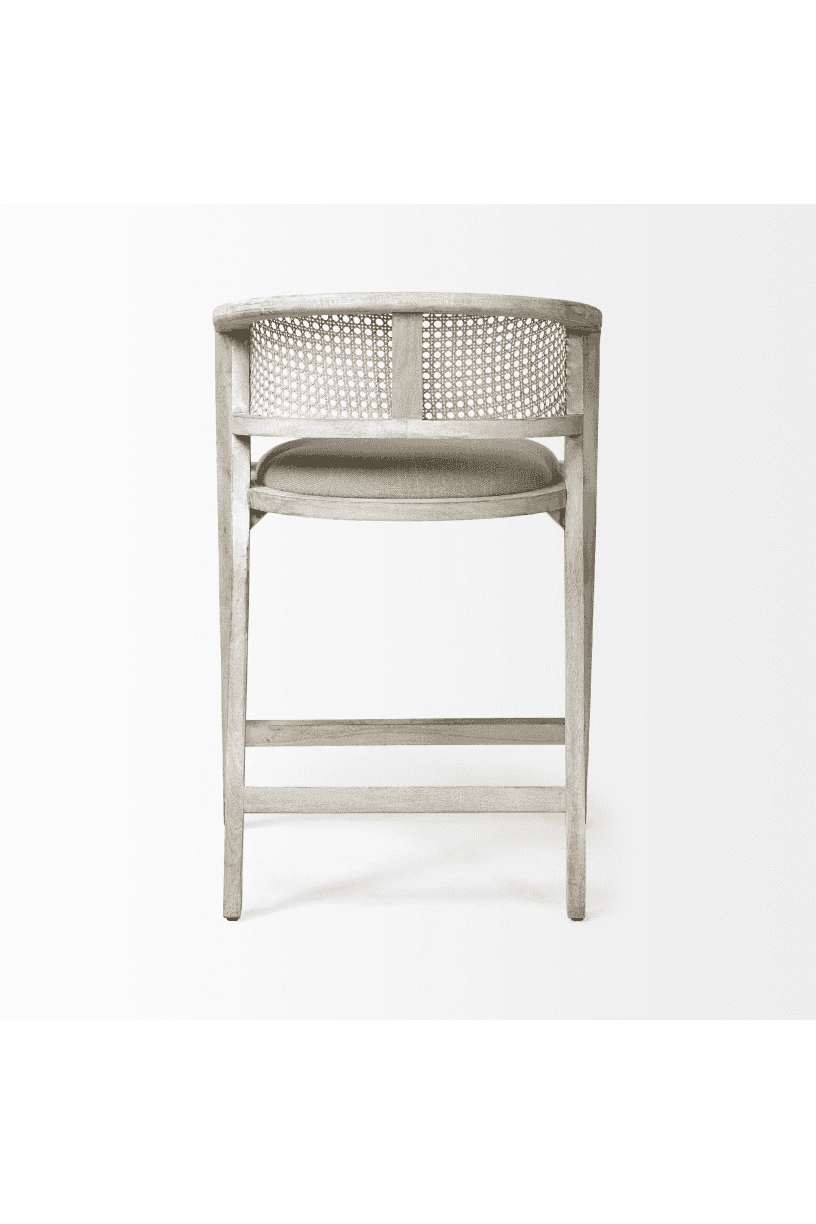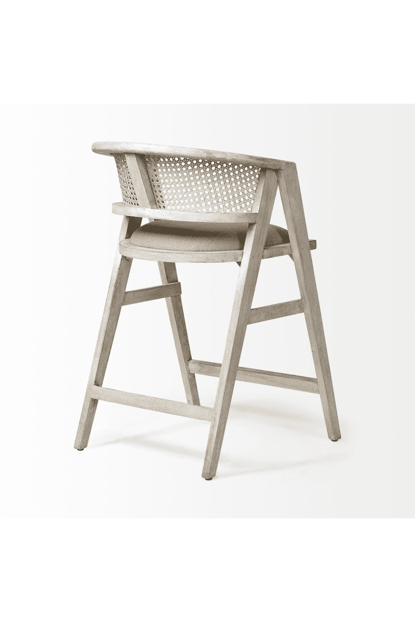 Meet the Tabitha Counter Stool. Simple and minimal, just the way we like it! This counter stool features a sturdy frame with triangular legs, crafted from Indian mango wood and finished in a whitewashed tone. It dons a curved cane back and has a padded, linen-wrapped seat to ensure unparalleled comfort.