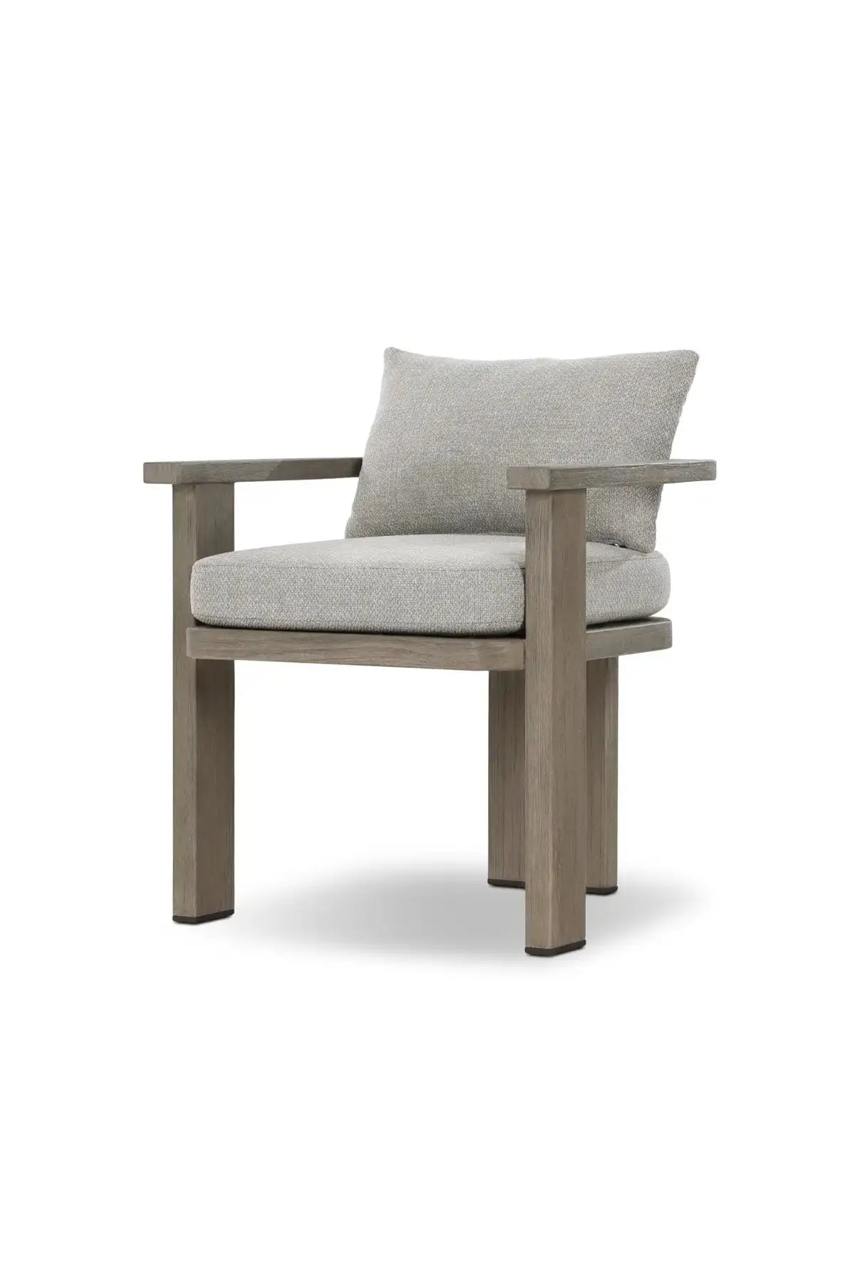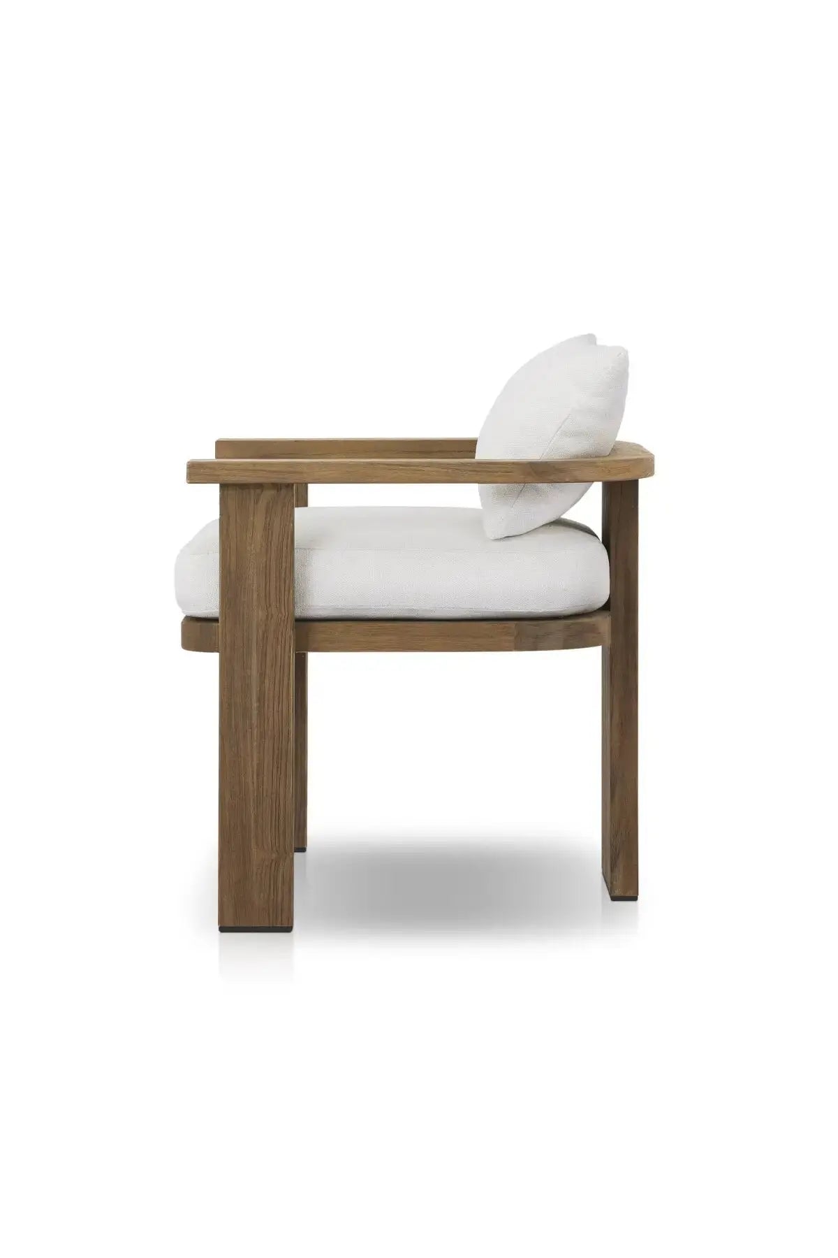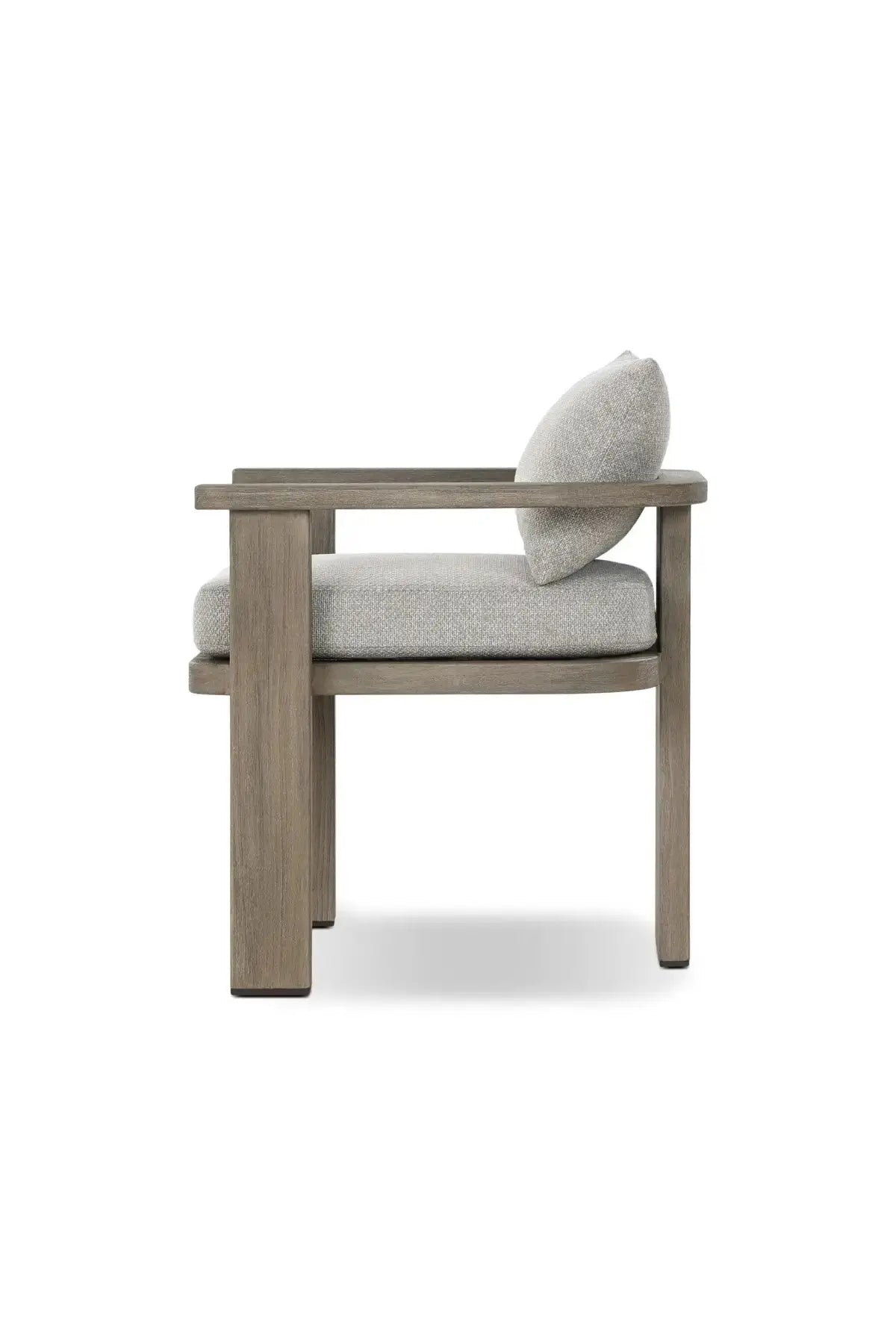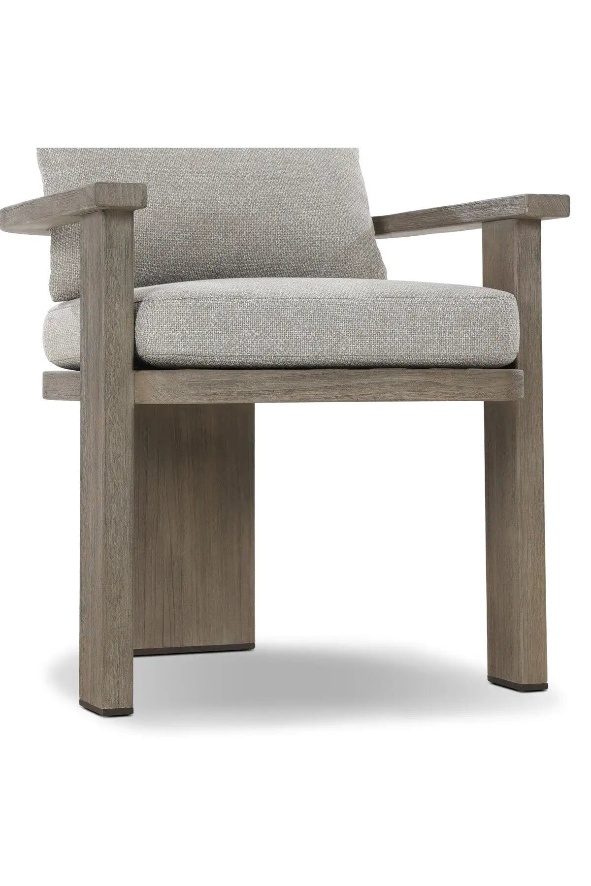 Meet the Tahana Outdoor Dining Armchair. This outdoor dining armchair combines a unique three-leg design with a comfortable curved back, made from sustainable FSC®-certified wood. Its thick cushions are upholstered with durable Italian fabric for lasting comfort. Protect it by covering or storing it indoors when not in use.
