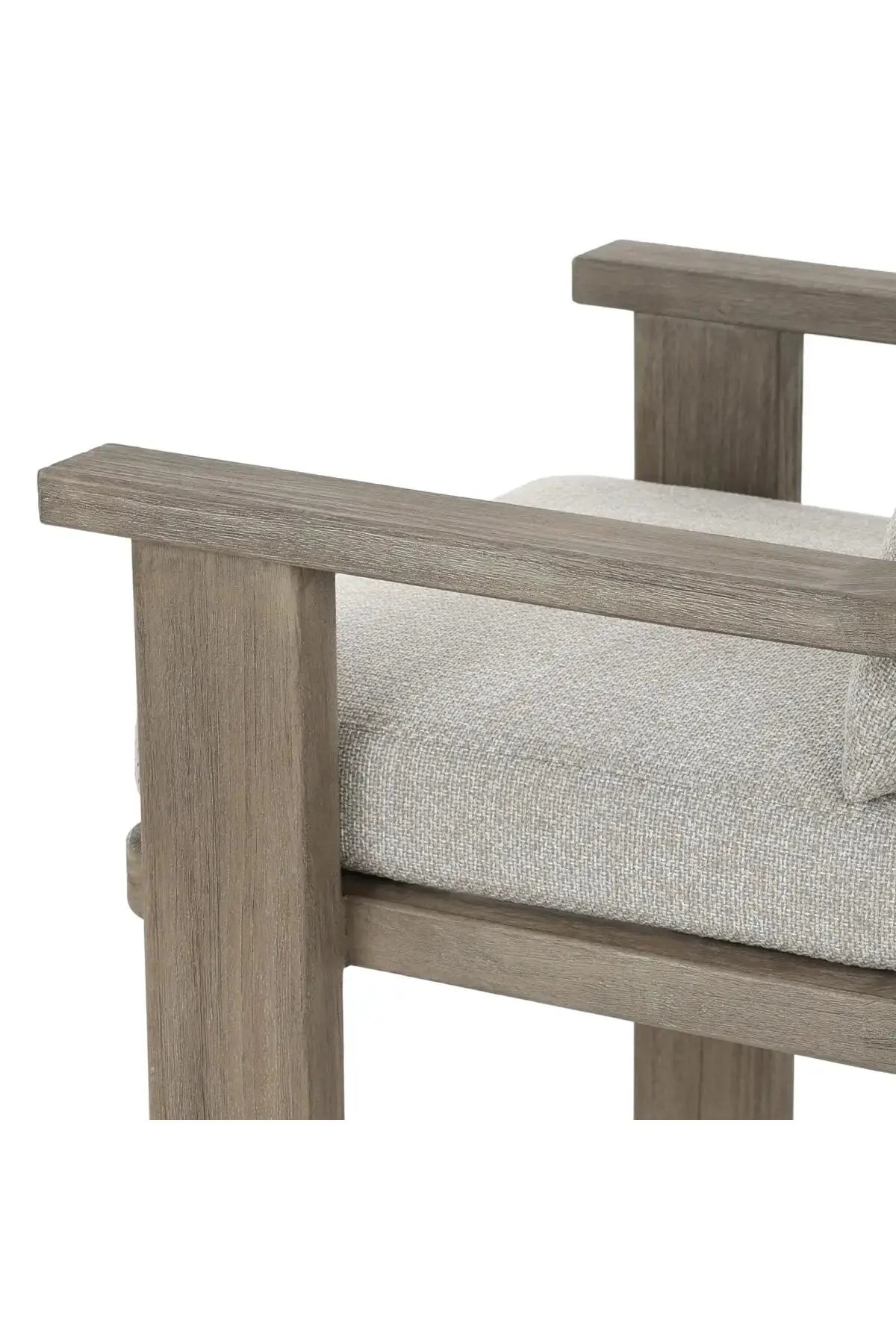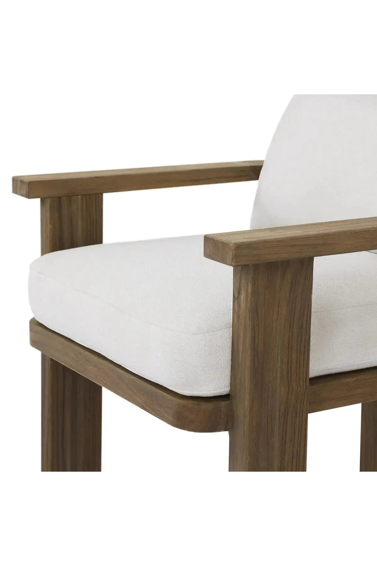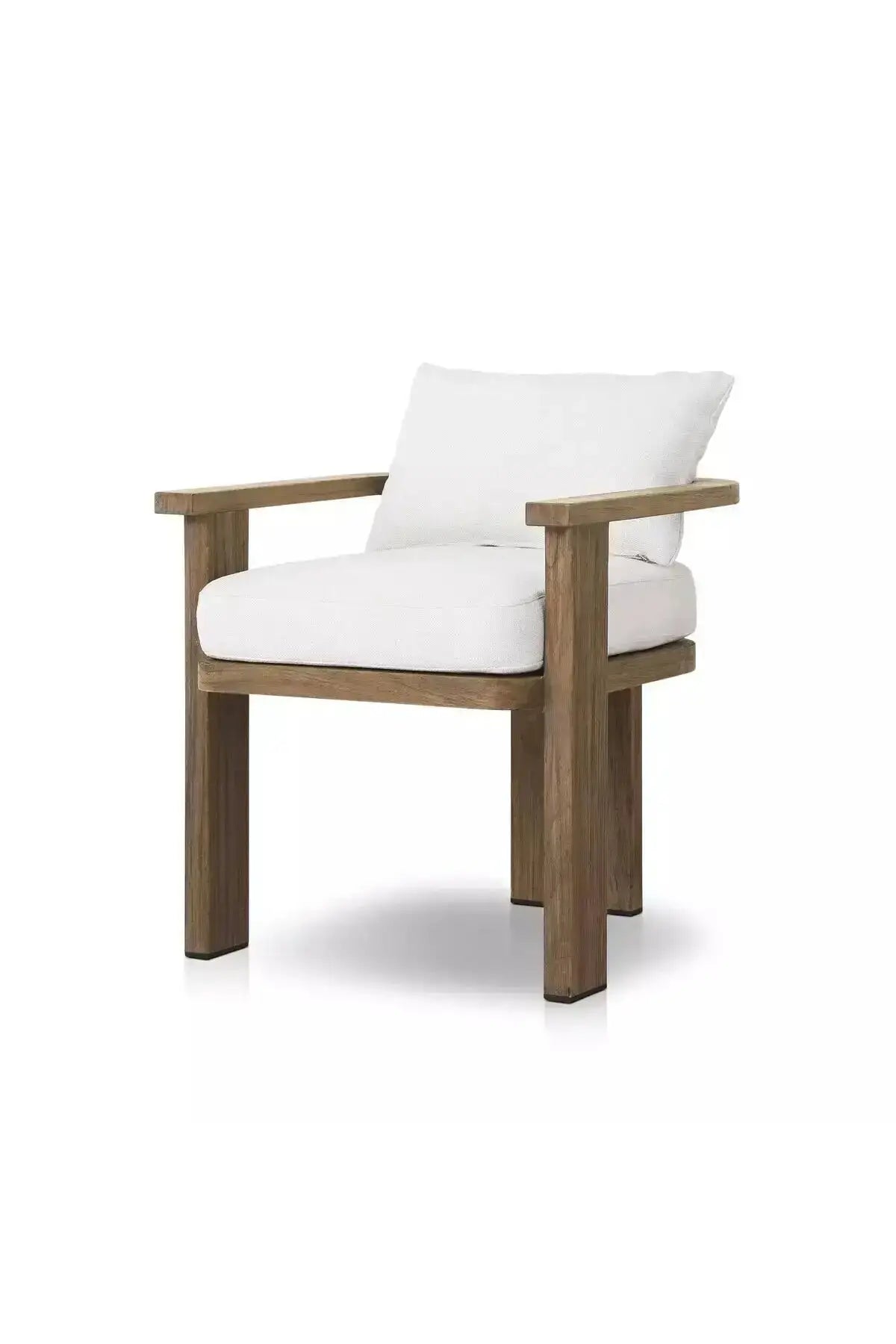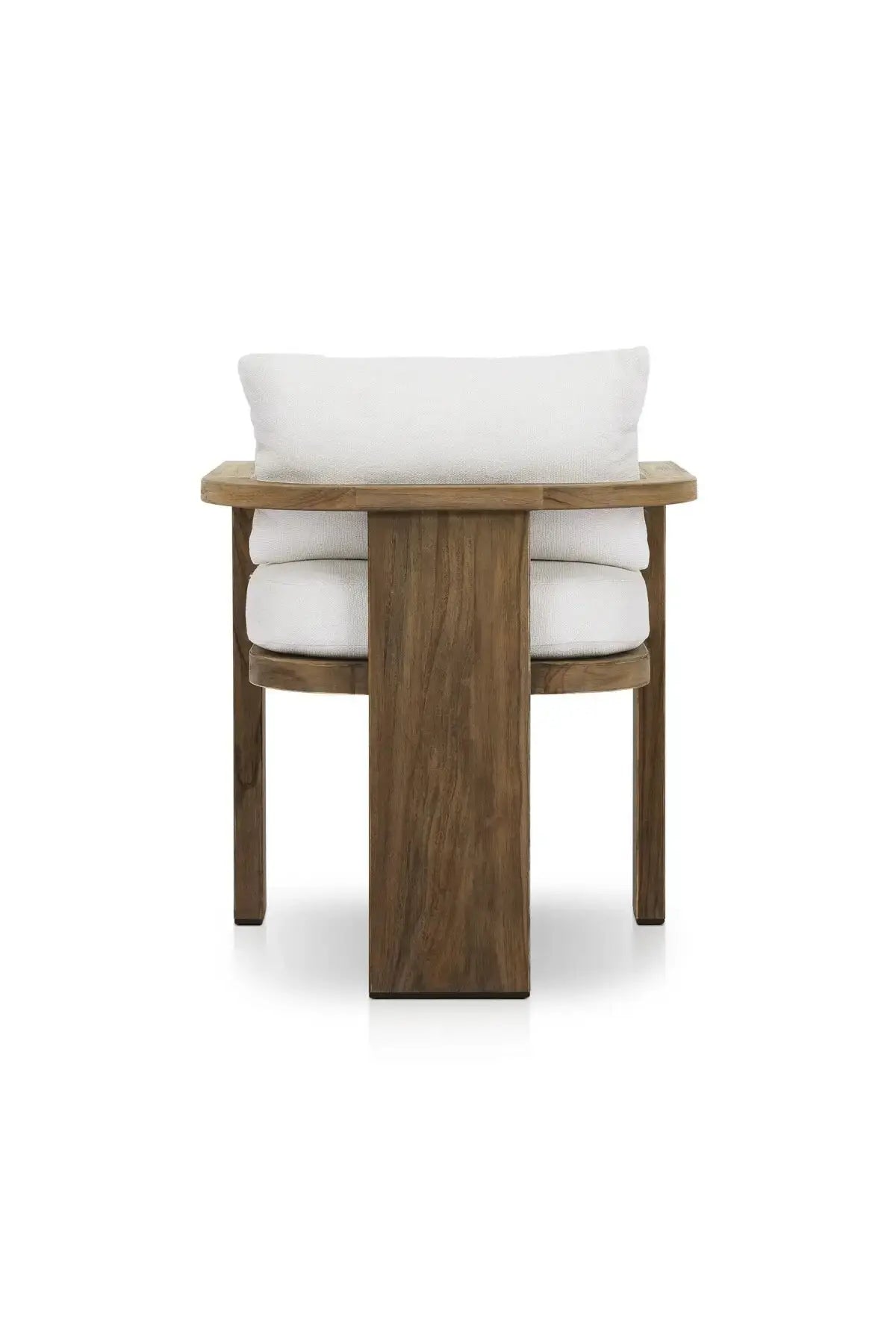 Meet the Tahana Outdoor Dining Armchair. This outdoor dining armchair combines a unique three-leg design with a comfortable curved back, made from sustainable FSC®-certified wood. Its thick cushions are upholstered with durable Italian fabric for lasting comfort. Protect it by covering or storing it indoors when not in use.