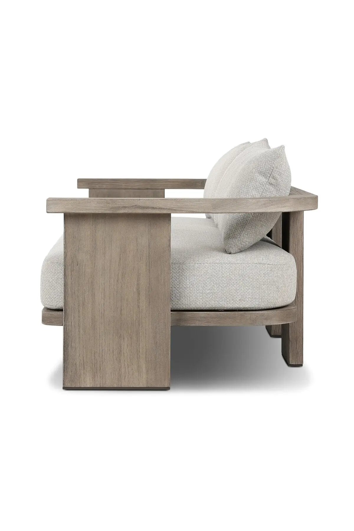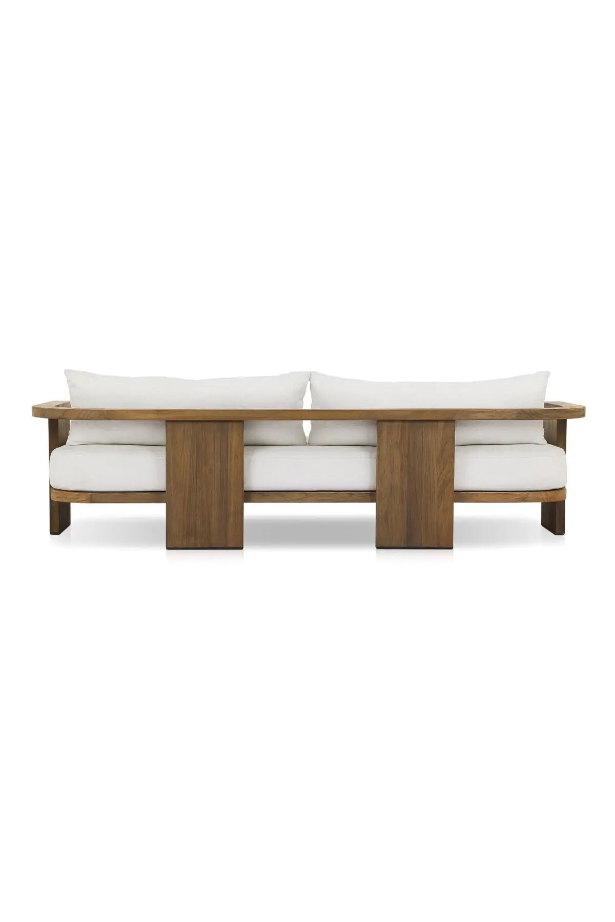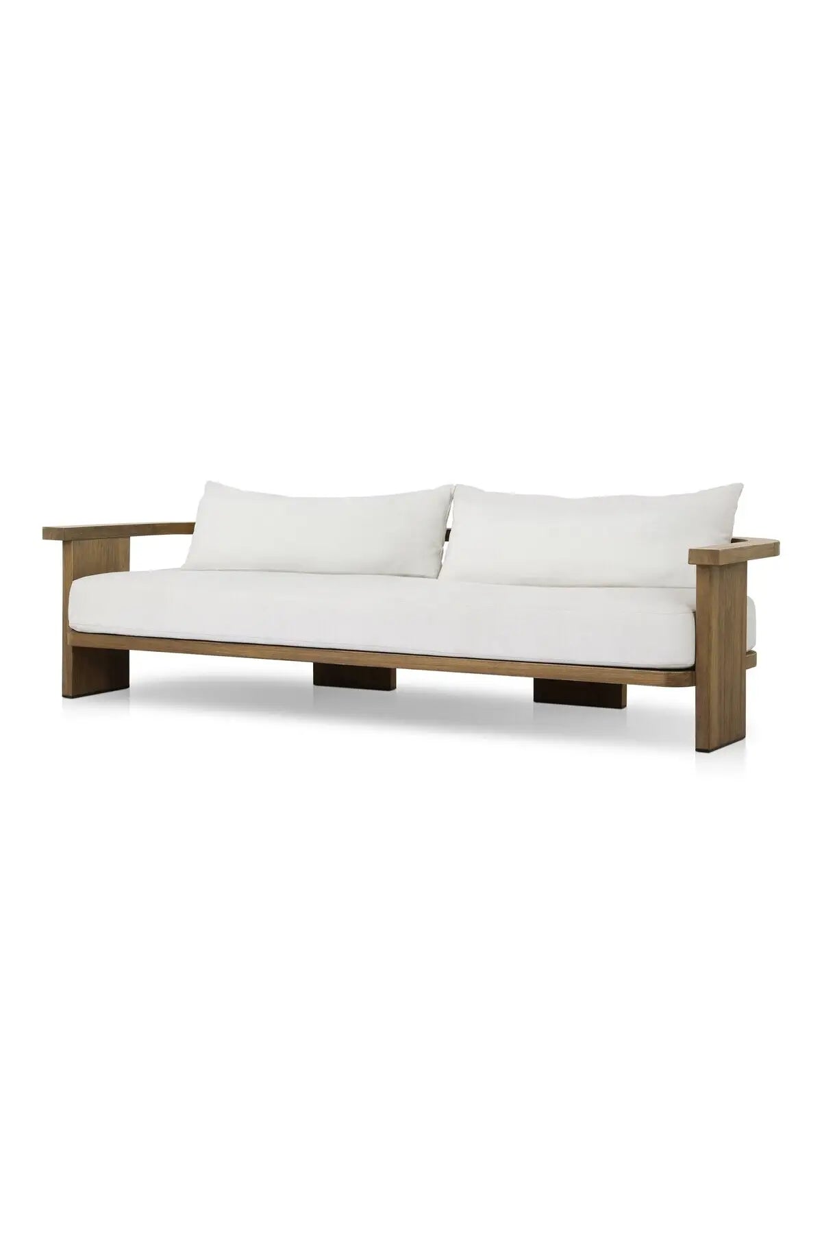 Meet the Tahana Outdoor Sofa. Clean and simple, this bold outdoor sofa features a distinctive design and curved seat back, crafted from FSC®-certified wood. The thick box cushion and knife-edge back cushion are finished in a high performance Italian upholstery. Cover or store indoors during inclement weather and when not in use.