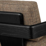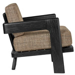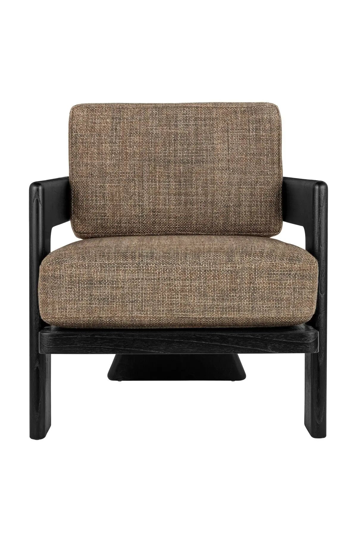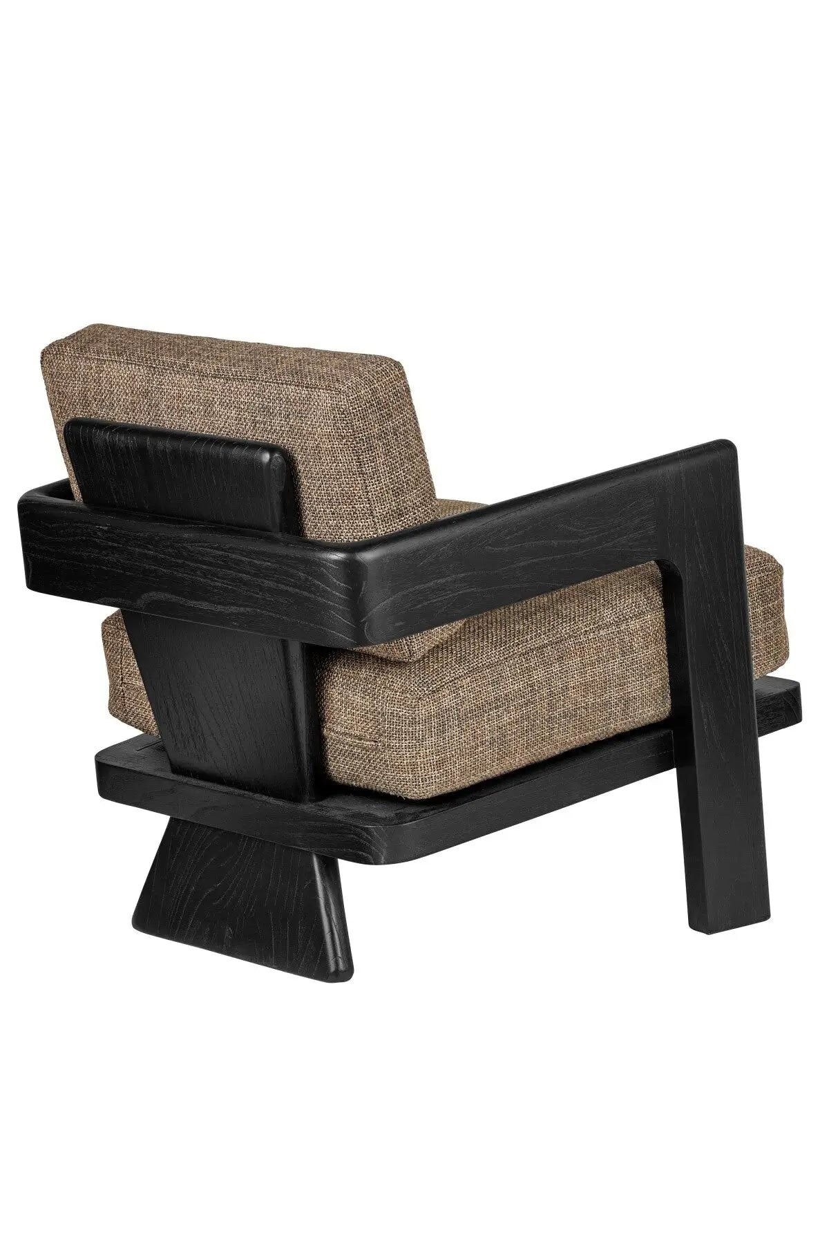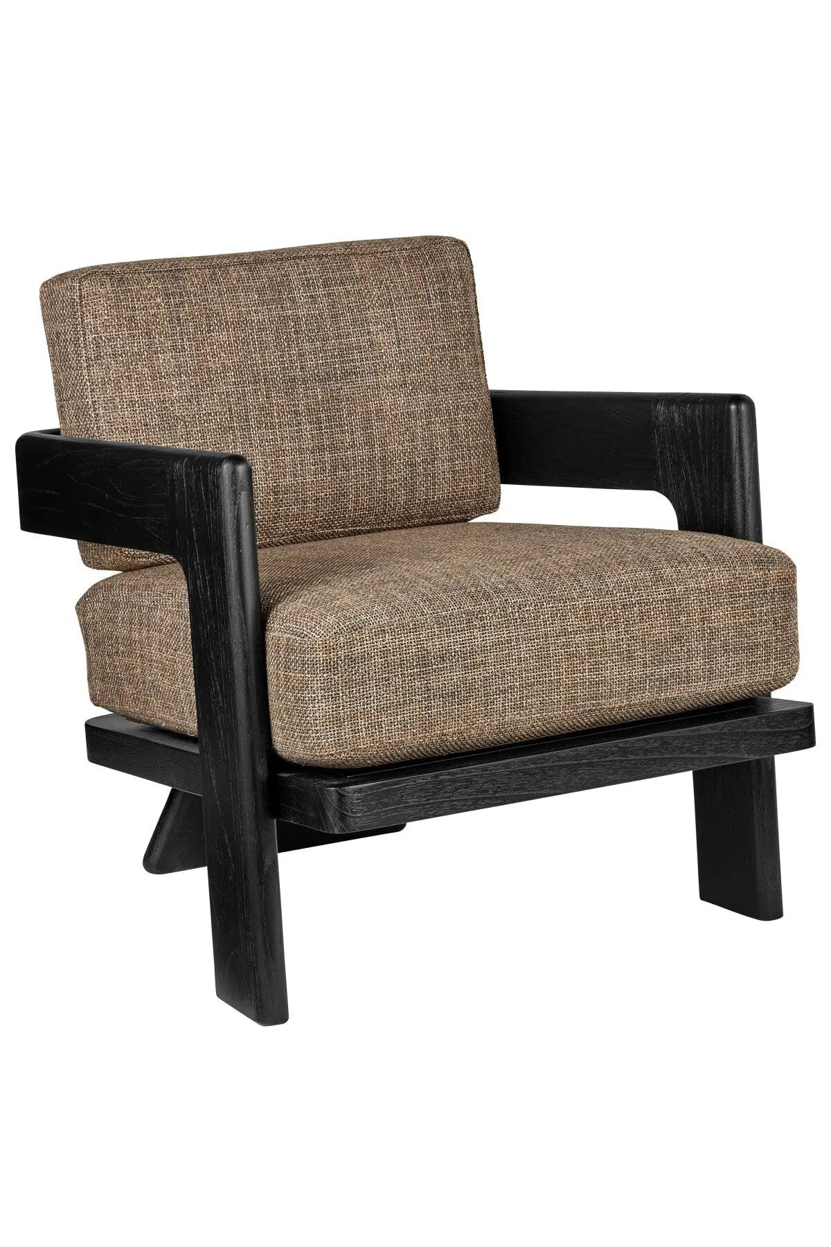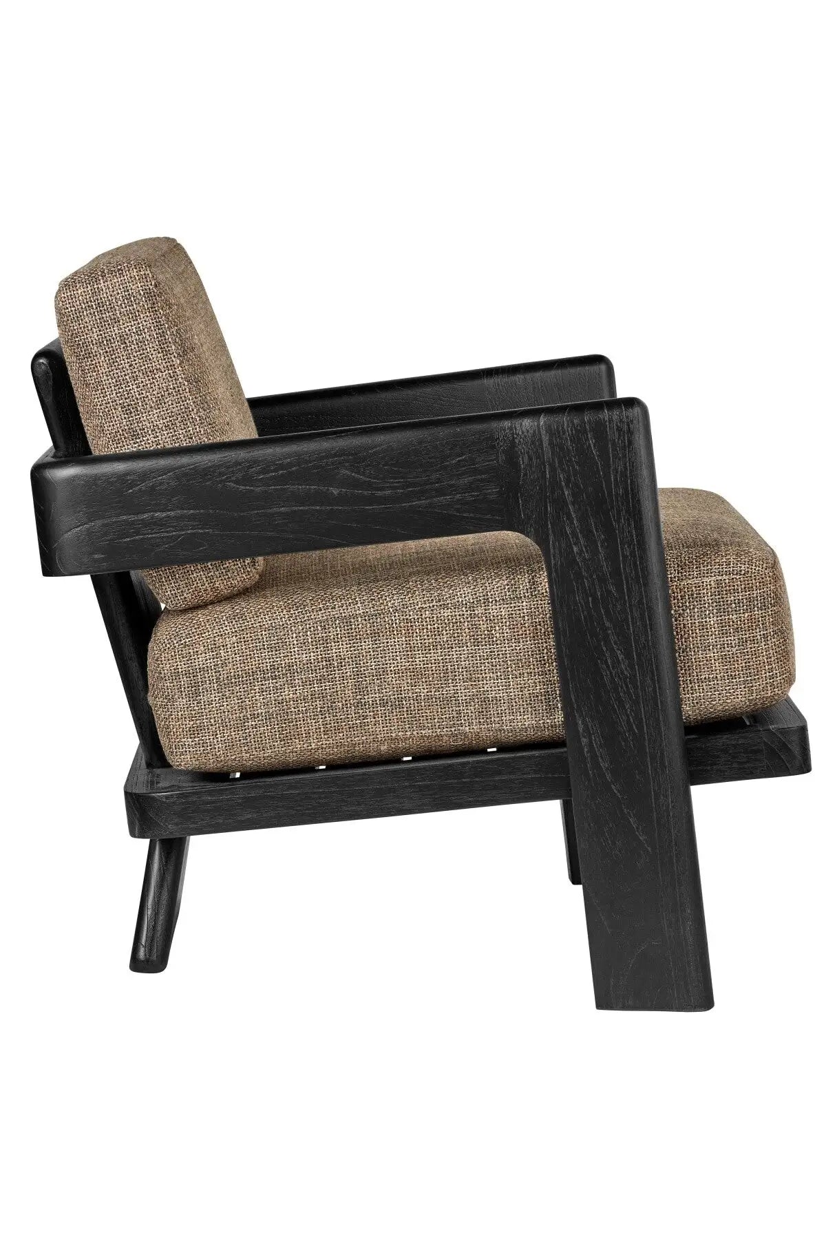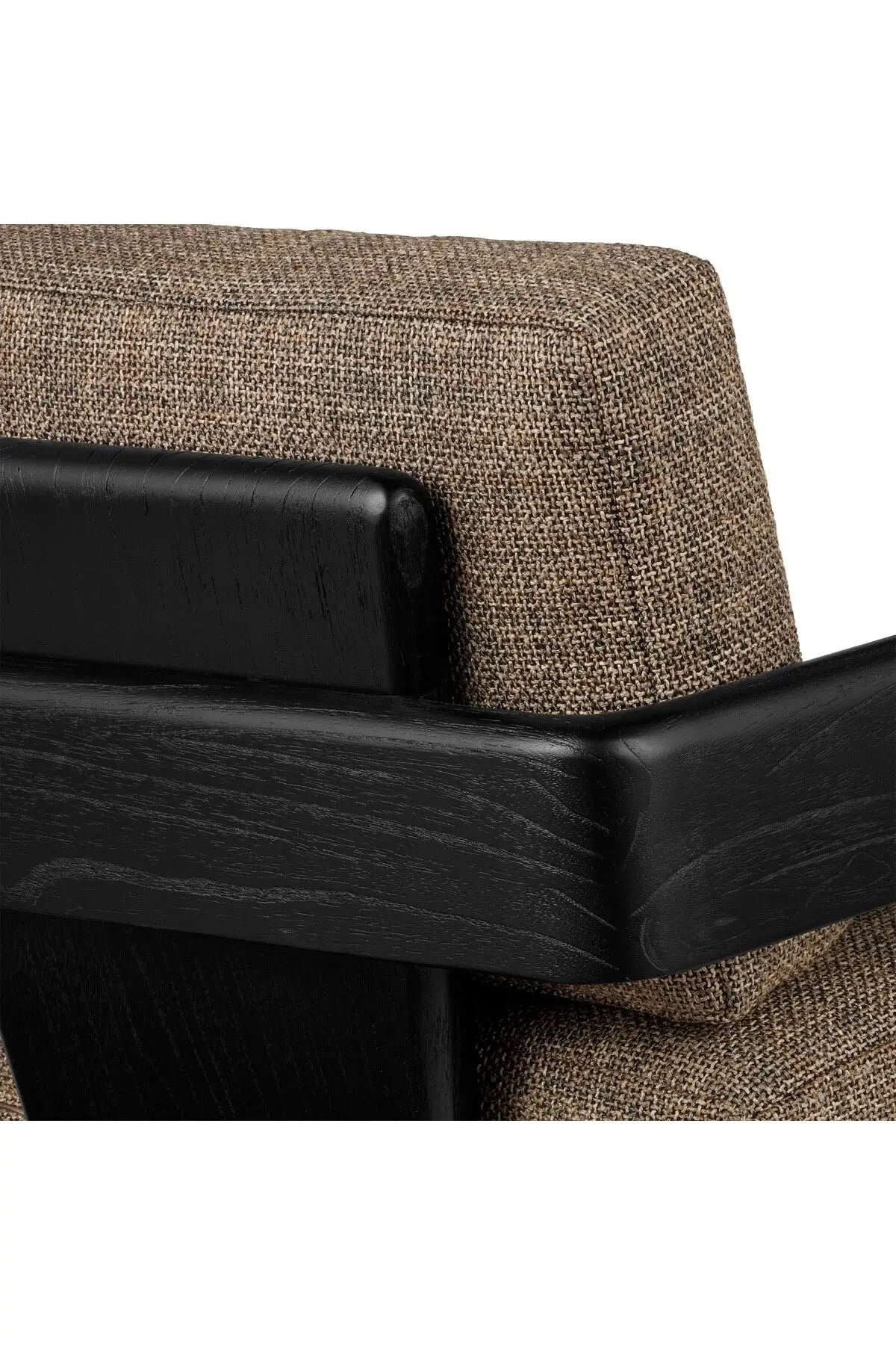 The Theo Lounge Chair, covered in Rig Otter fabric, has a solid Mindi wood frame in a caviar black finish. The upholstery fabric on this piece packs a punch with its textural weave + serves as a light contrast to the dark wood.