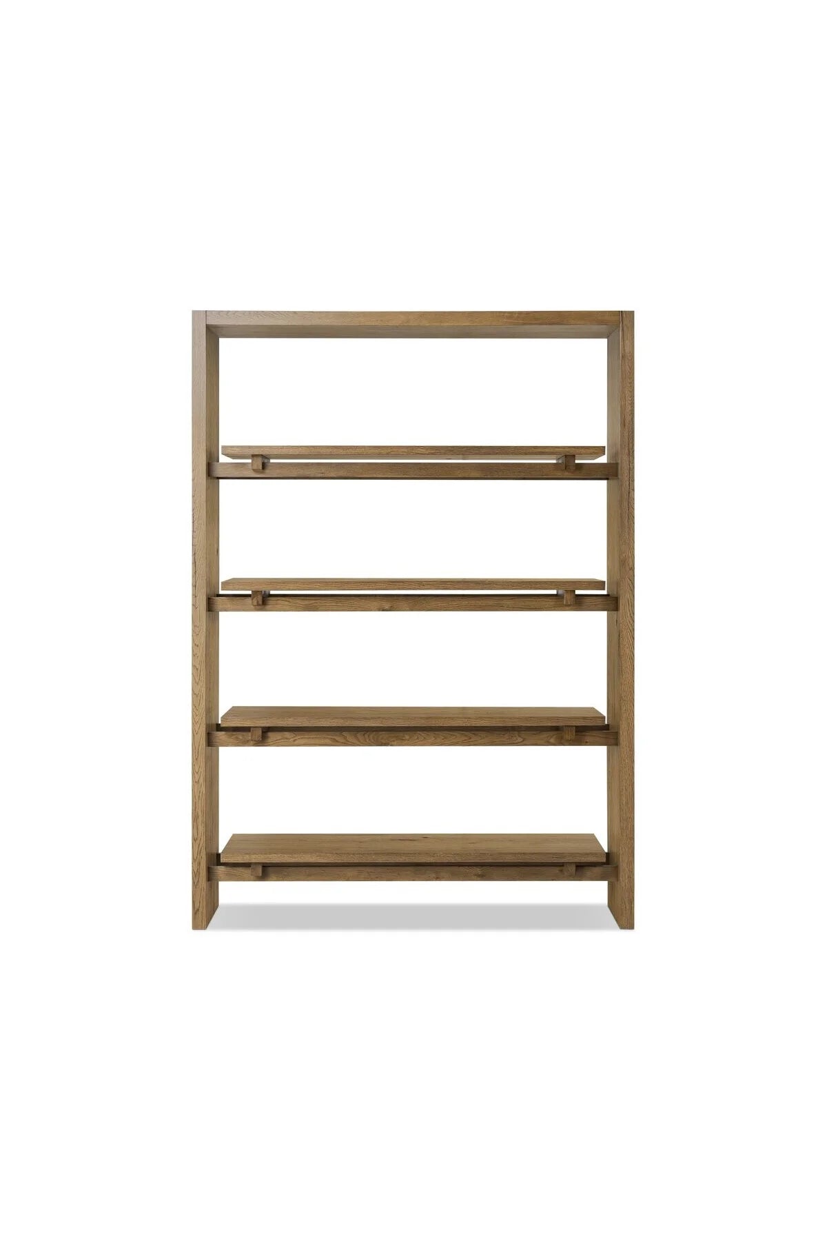 Meet the Theodore Bookcase. A study in shape. Black acacia forms crescent-shaped legs and sprawling oval tabletop, bringing organic presence to the living room.