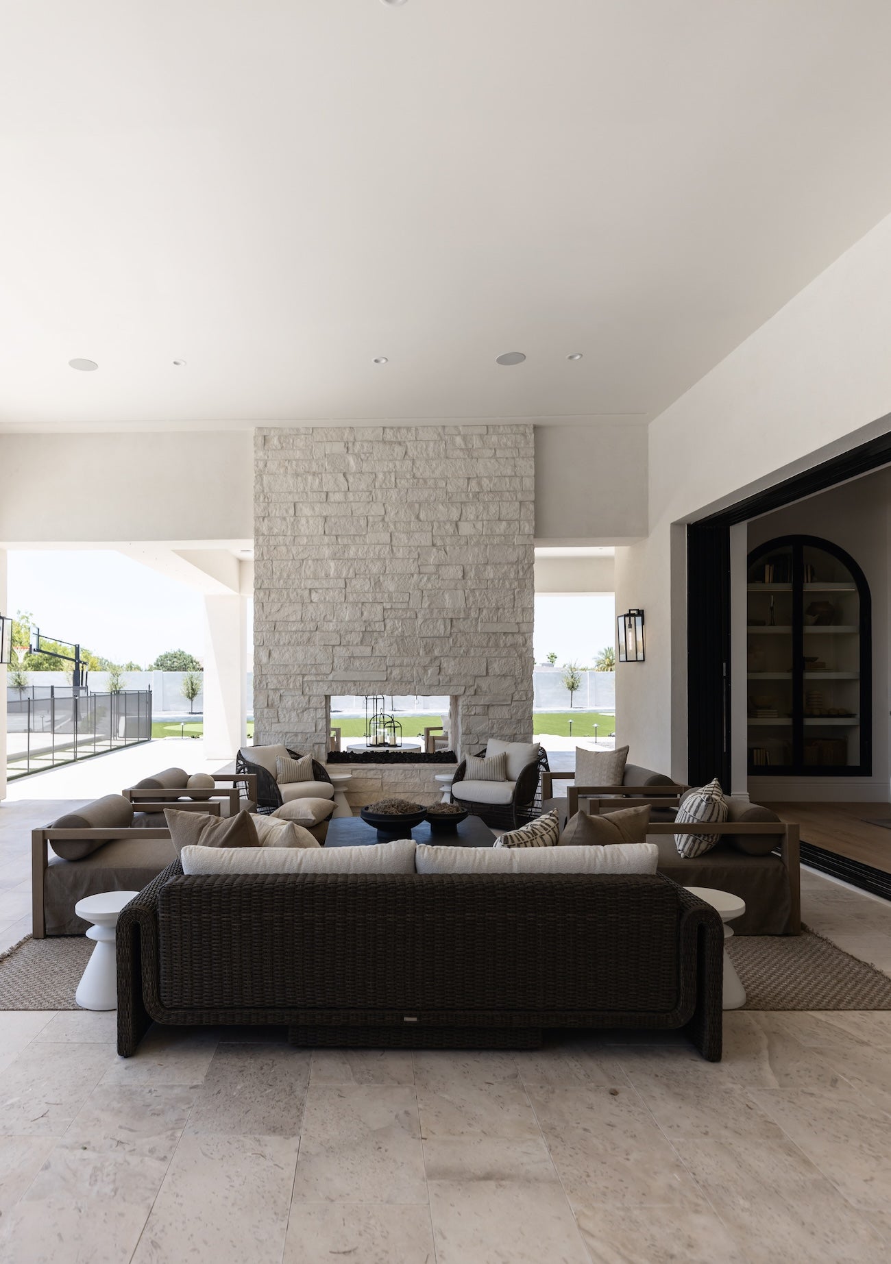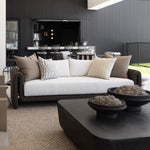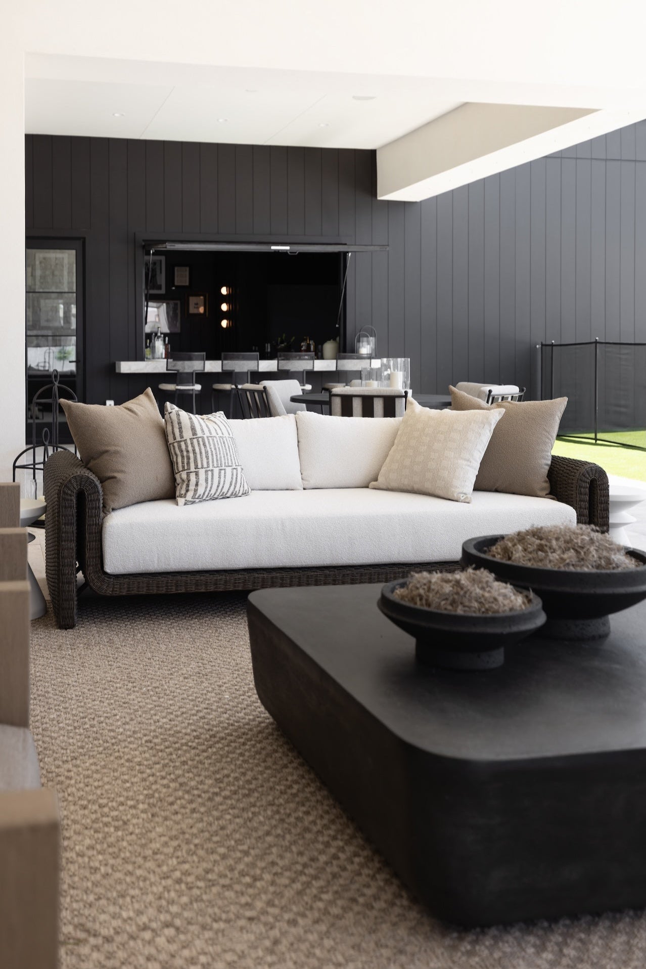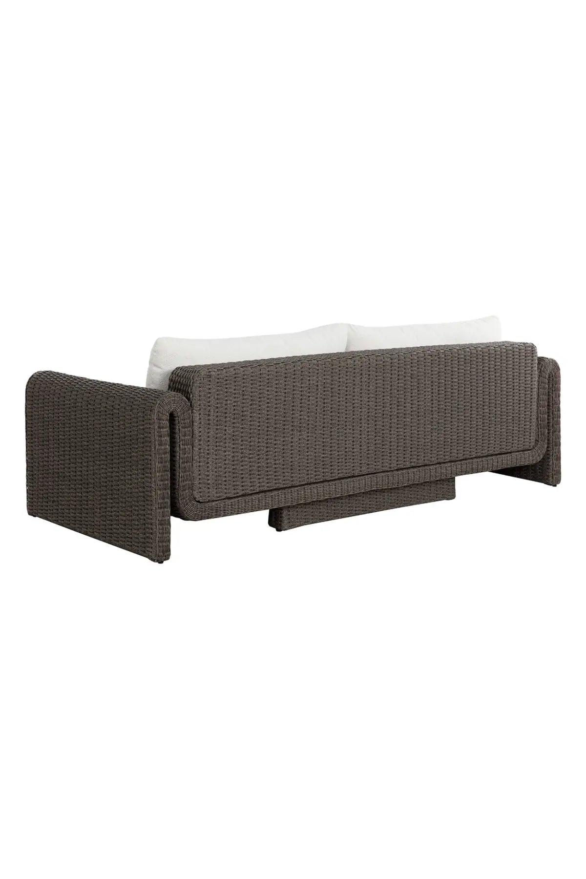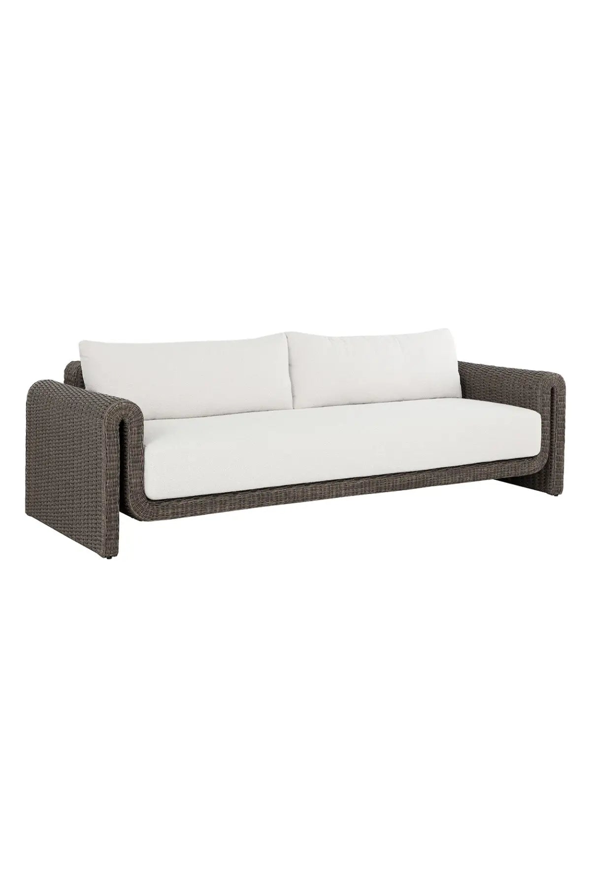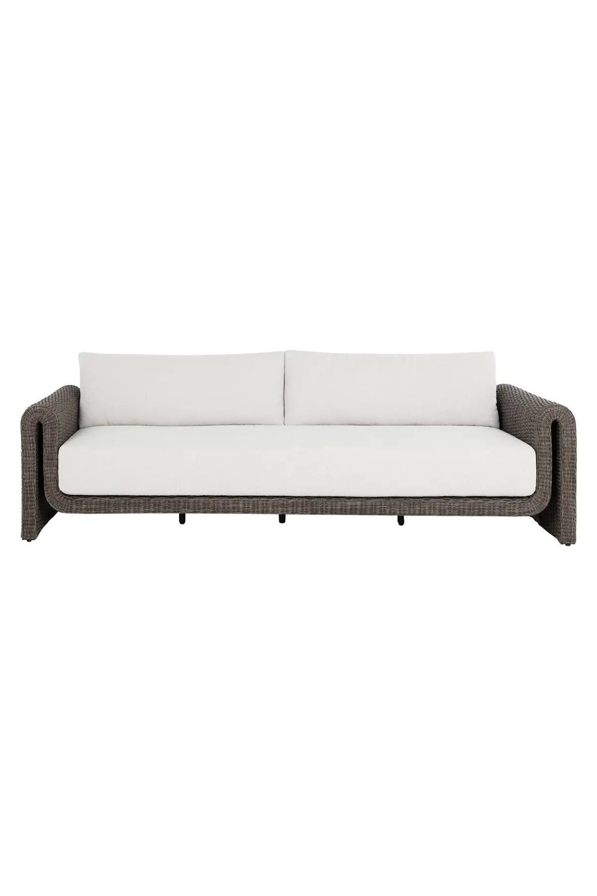 The curved proportions of the Tibi Sofa enhance the textural beauty of handwoven twisted wicker. The rolled arms connect seamlessly to nestle the comfortable cushioning upholstered in our louis cream outdoor boucle performance fabric.