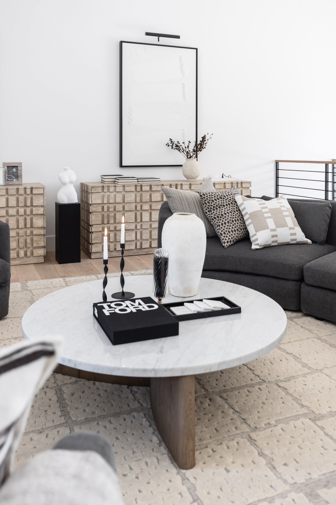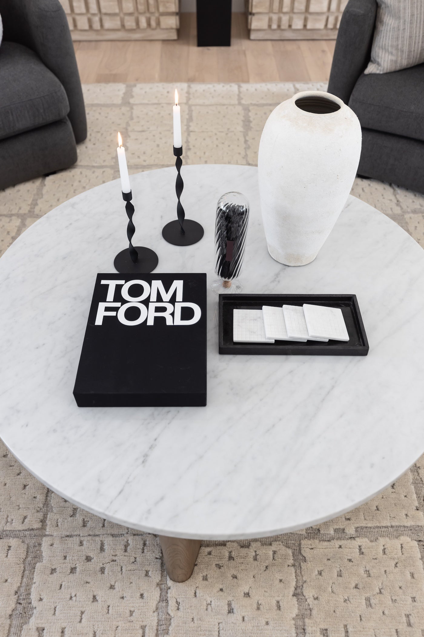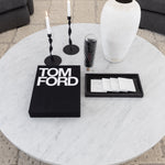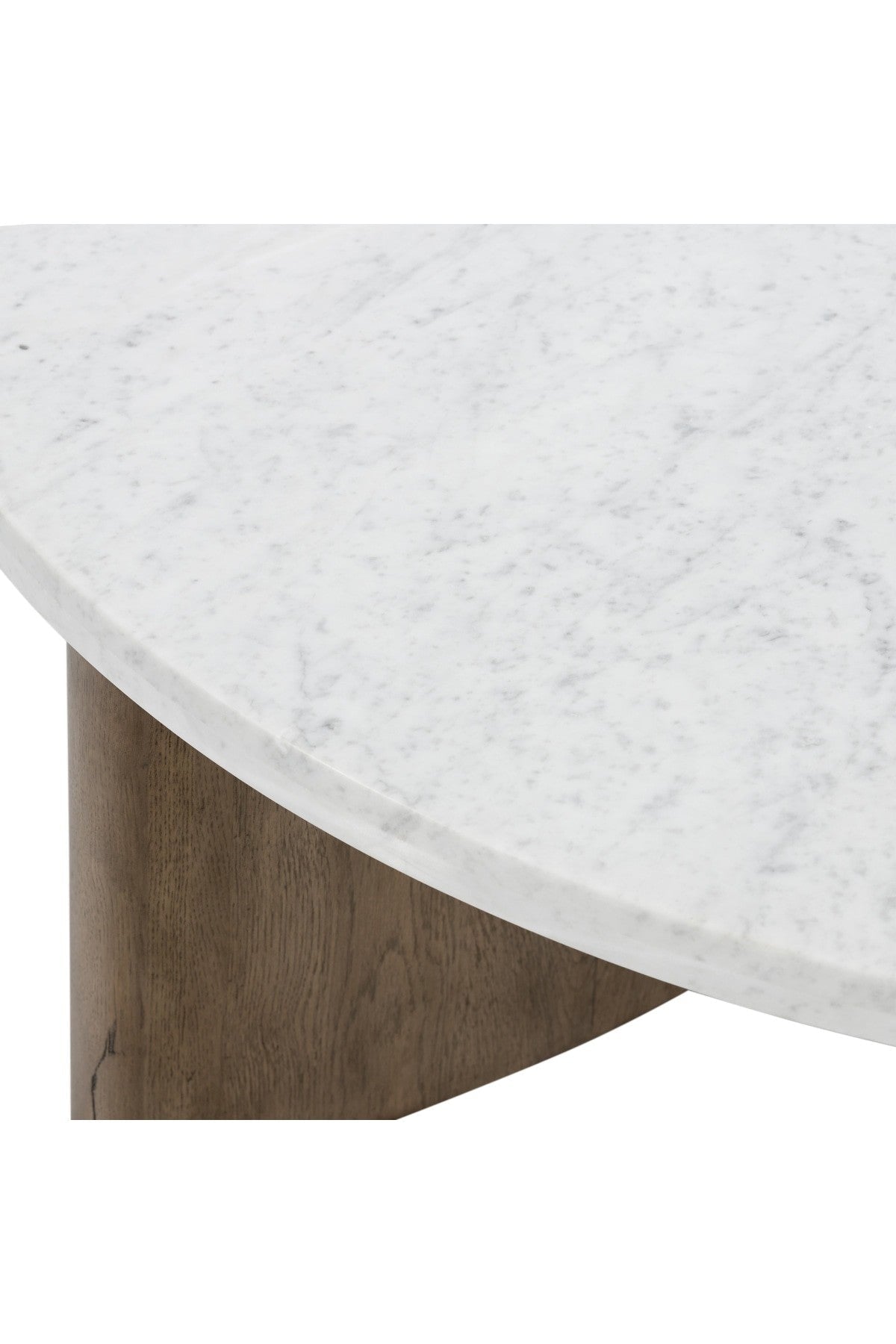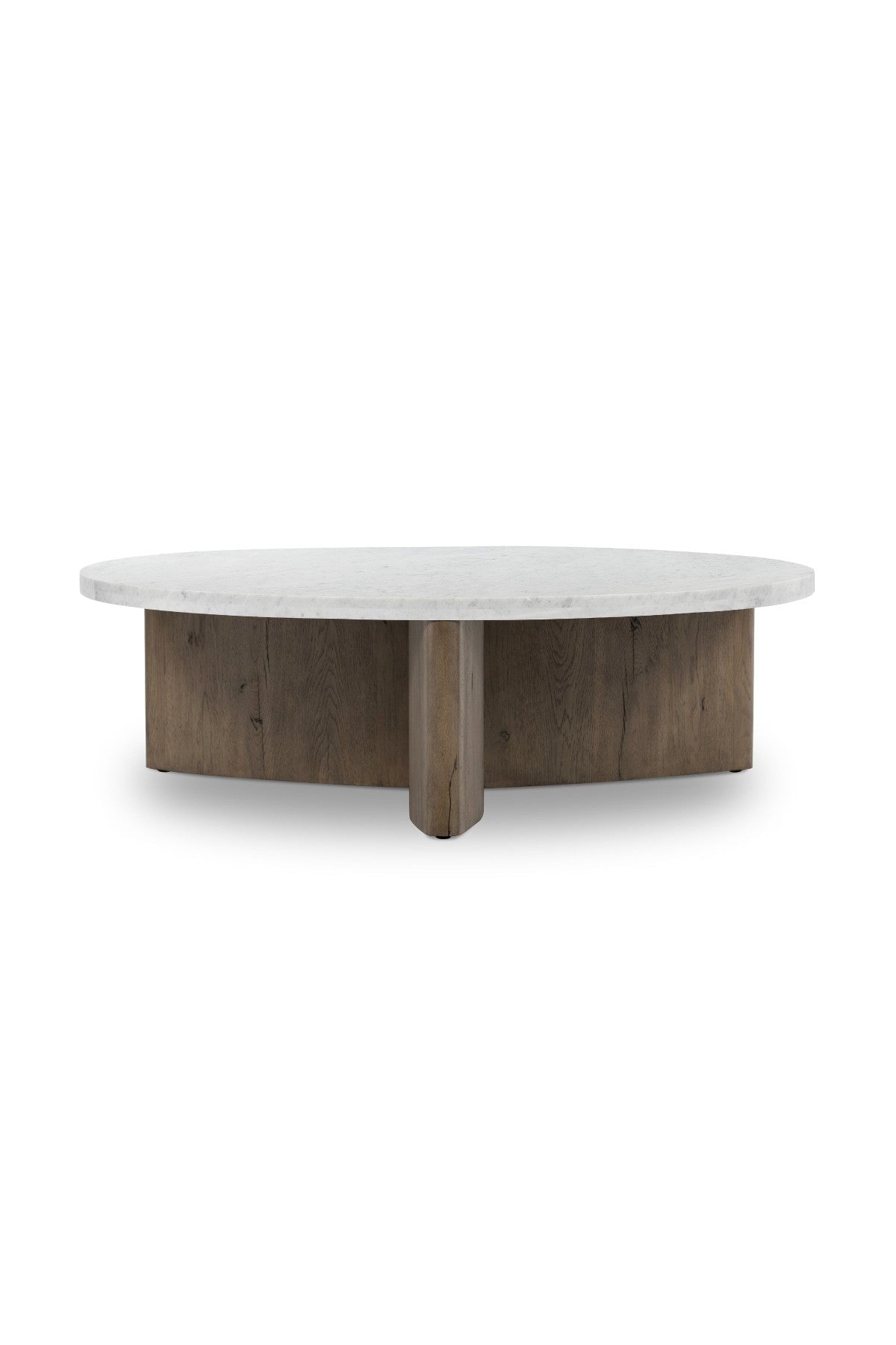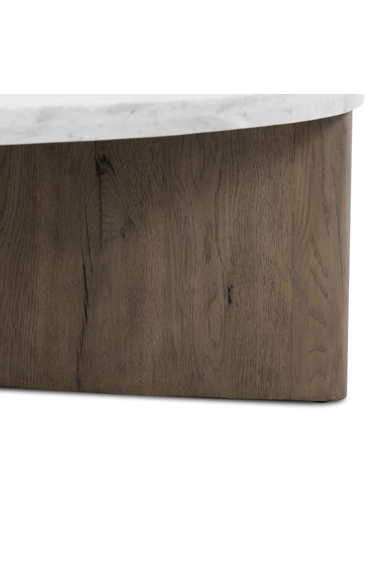 Meet the Toli Coffee Table. Mixed materials make the Toli Coffee Table. Finished in a rustic grey, thick-cut oak forms a chunky pedestal base for a rounded tabletop of white Italian marble, with beautifully subtle natural veining.