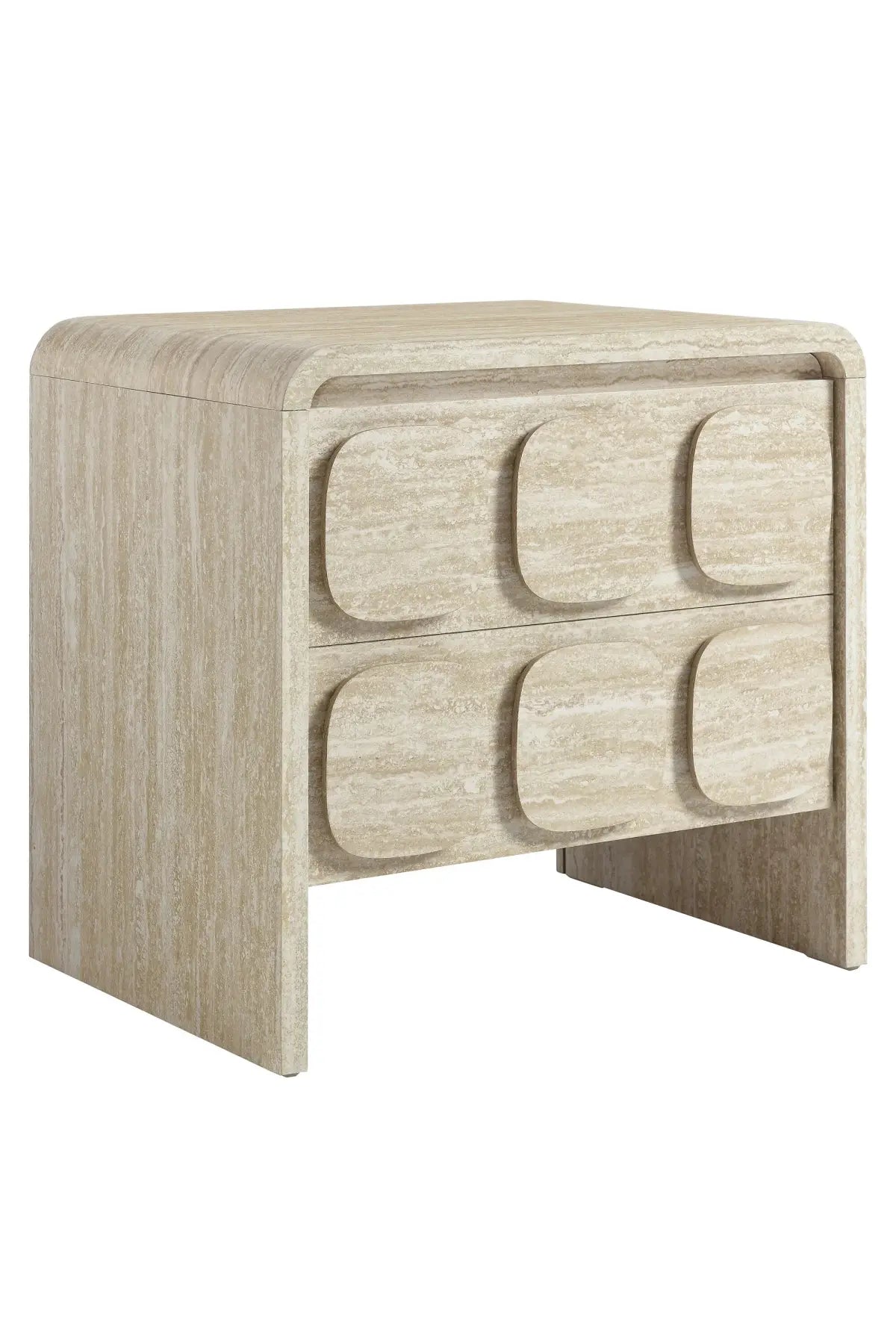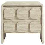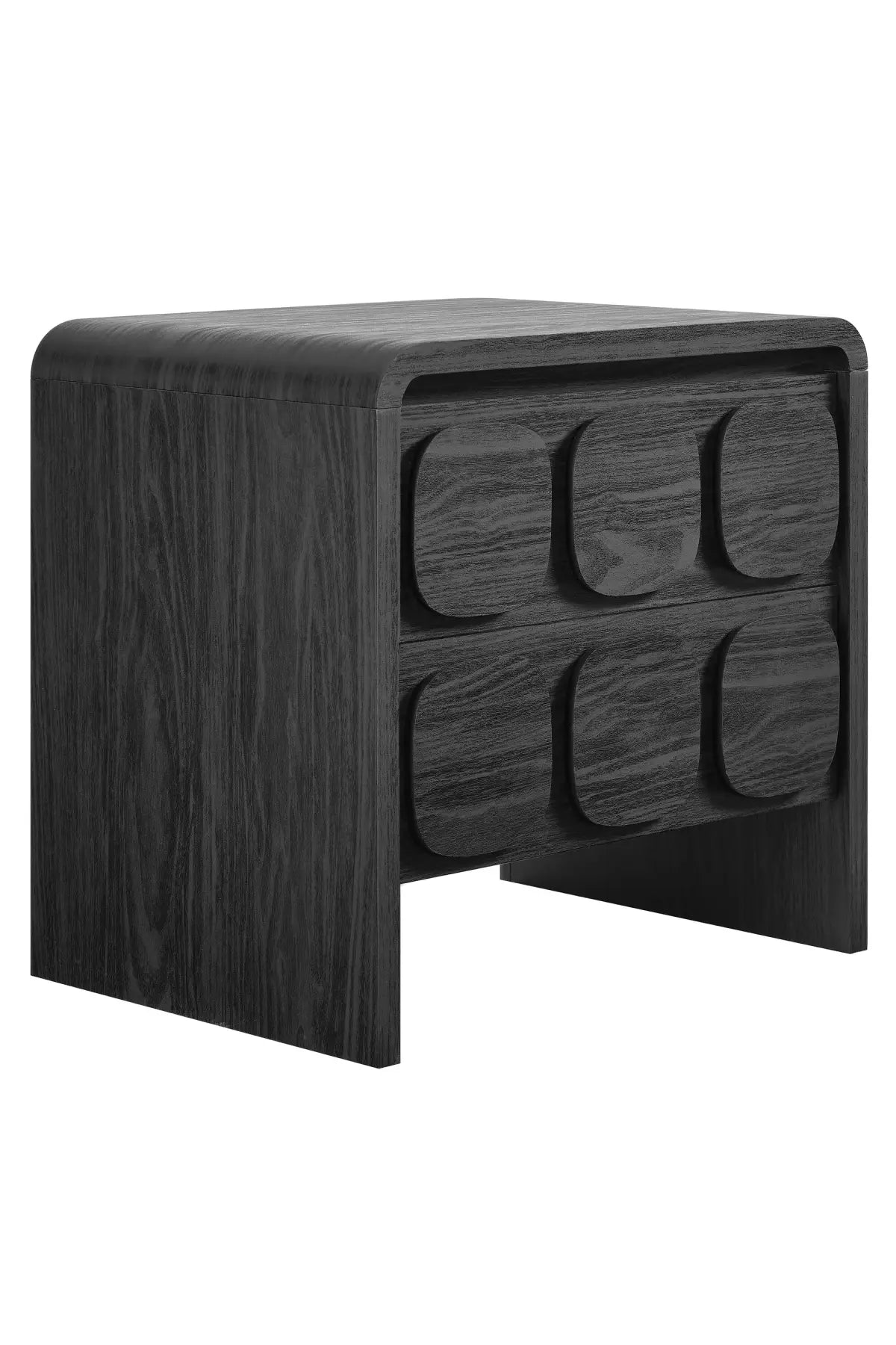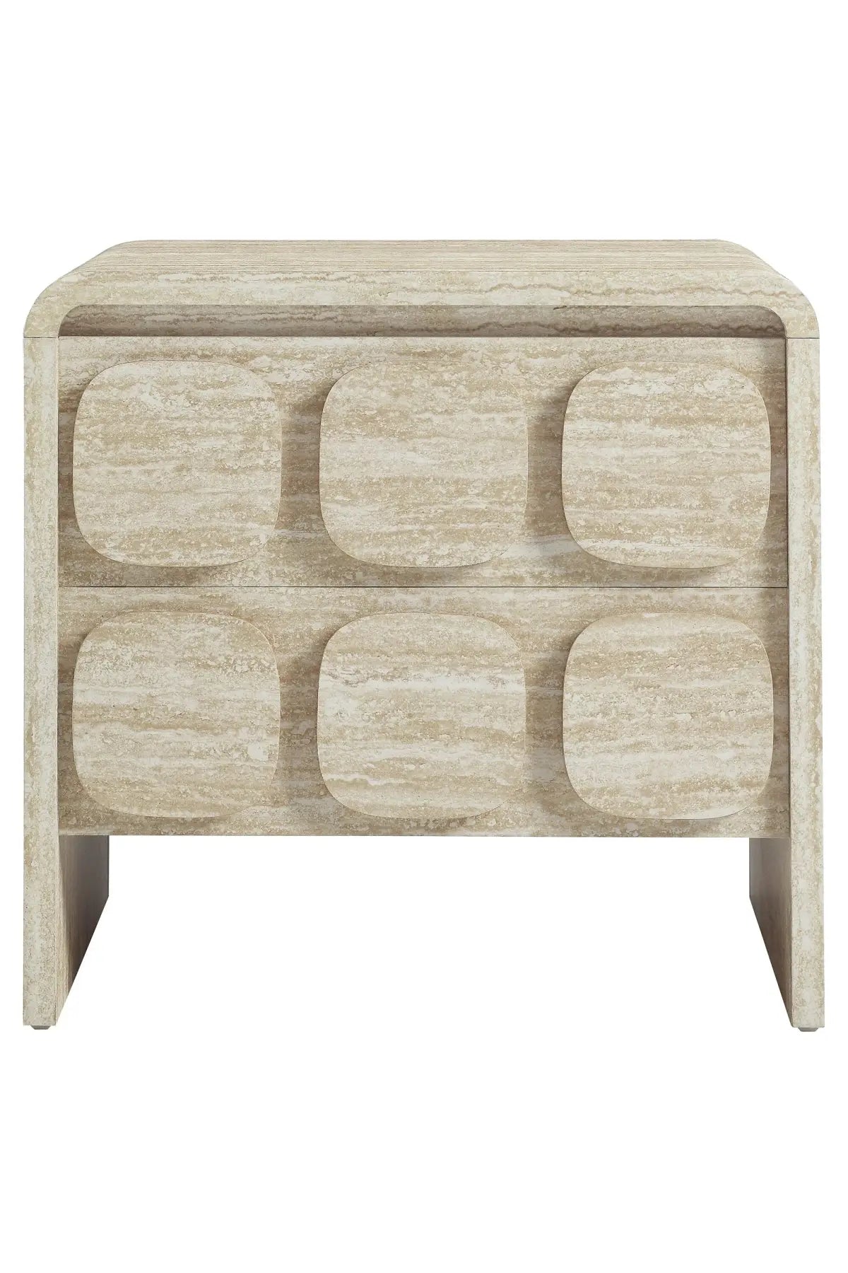 Meet the Toscana 2-Drawer Nightstand. Elevate your space with this elegant nightstand, featuring rounded corners and a circular pattern motif across the drawer fronts. Crafted with durable paper laminate, it offers a sleek, contemporary look. Ideal for the bedroom, living room, or office, this modern nightstand seamlessly blends style and functionality. Assembly required.