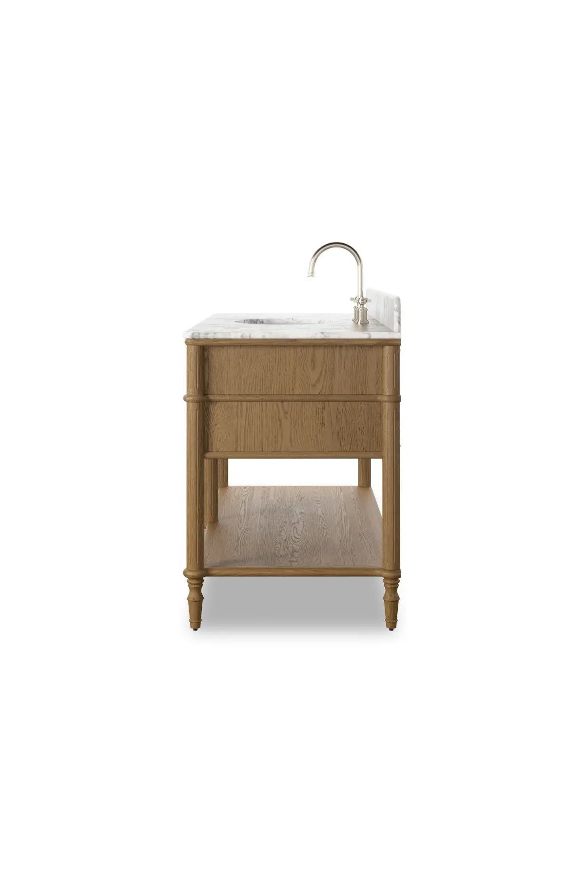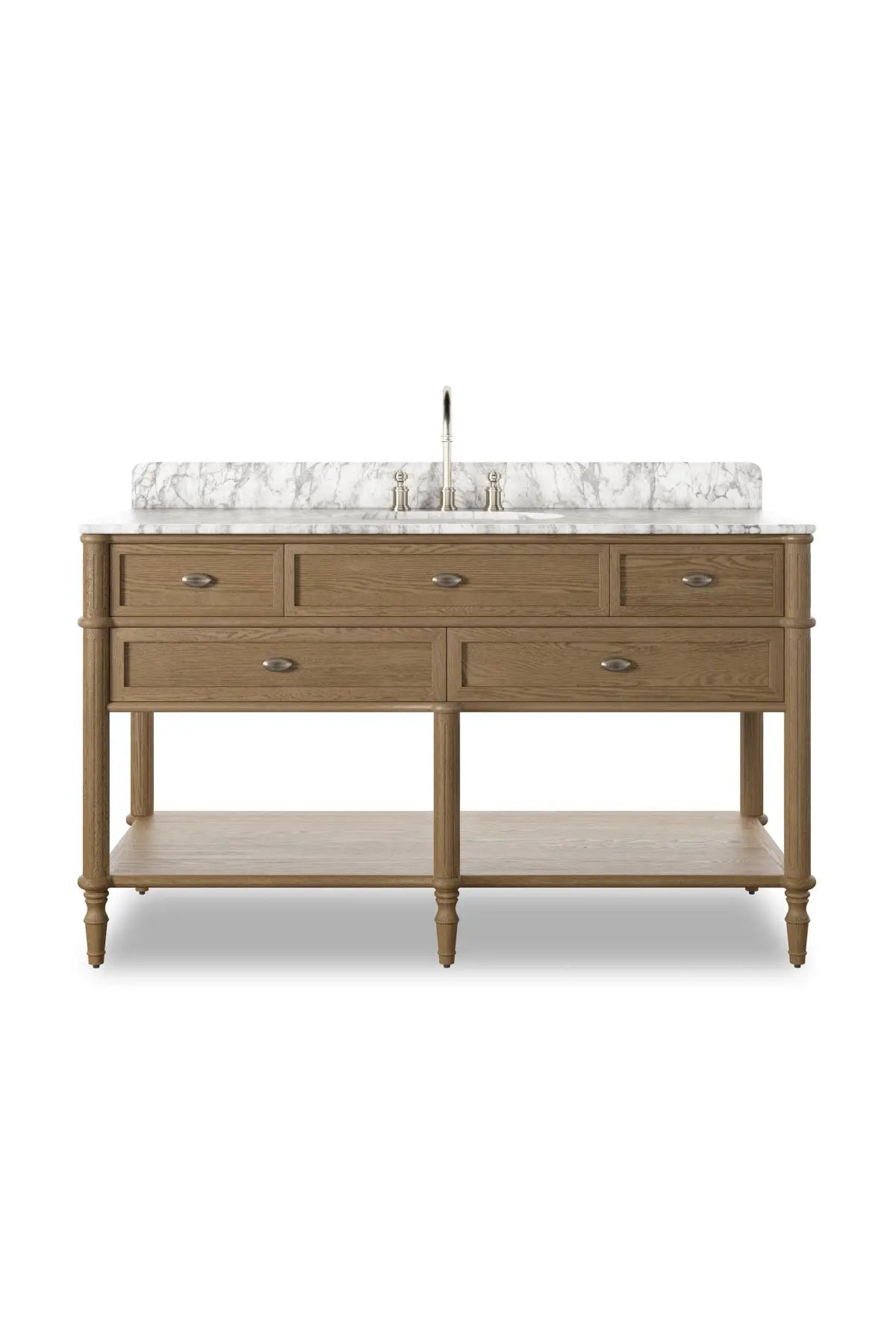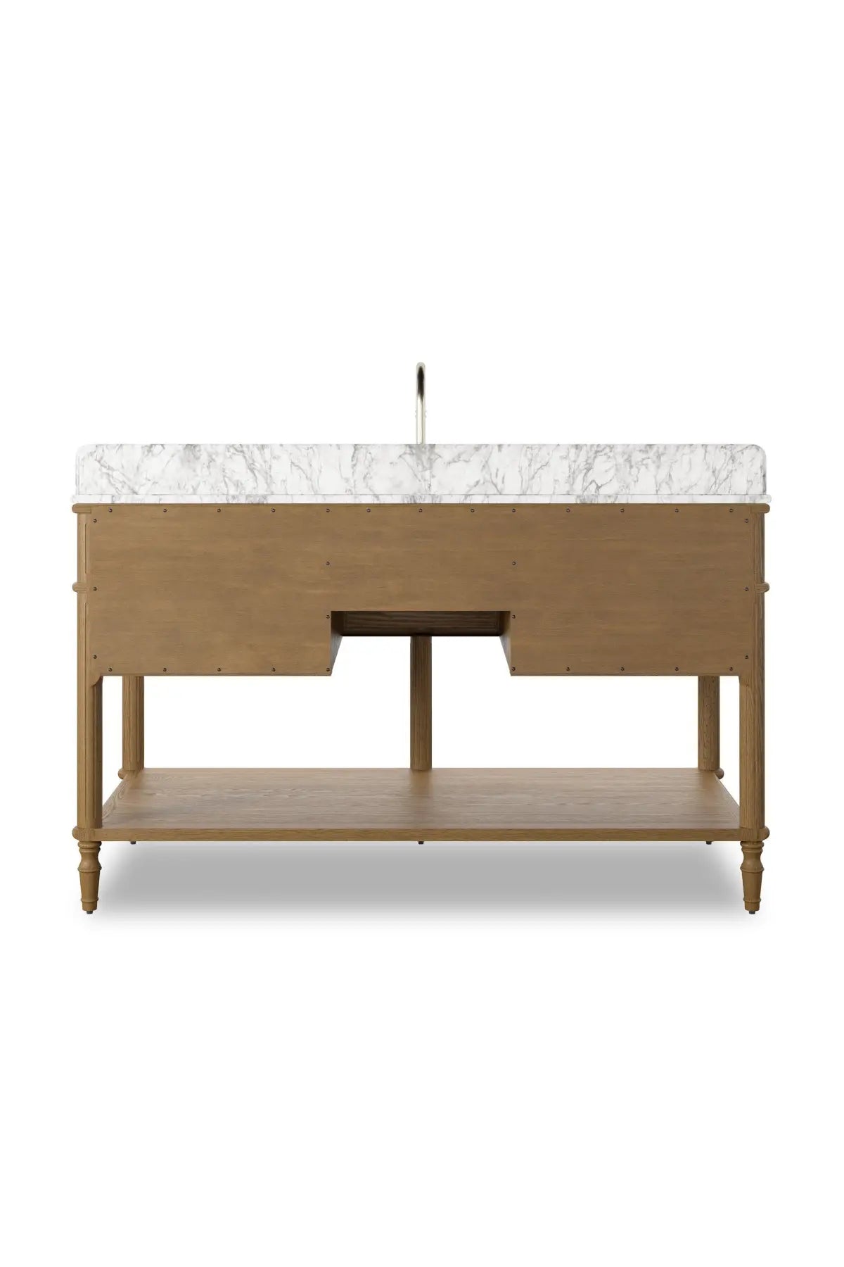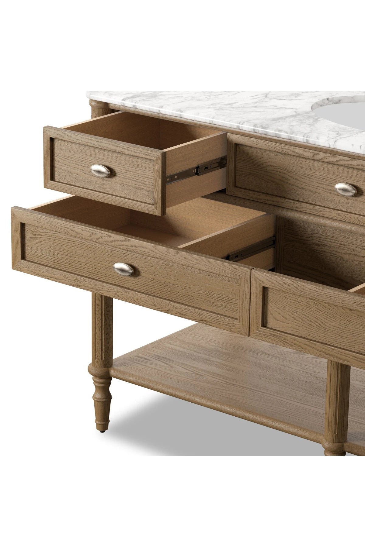 Meet the Toulouse Single Wide Vanity. Influenced by vintage European lines, this inspired bath vanity brings a sense of calm and serenity to the bath space. Crafted from solid oak and veneer with rounded corners and tapered spindle legs in a natural washed blonde finish, aged satin brass hardware and a Carrara marble top. Includes four functional drawers and a deep open shelf below. Finished with a bath-safe sealant for moisture resistance. Designed to accommodate 8"-widespread faucets and standard-size hardware for easy customization; faucet shown not included. Sink and backsplash included; backsplash ships separately. Removable back with cutouts for plumbing; fits standard P-trap. Professional installation required.
