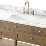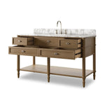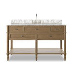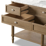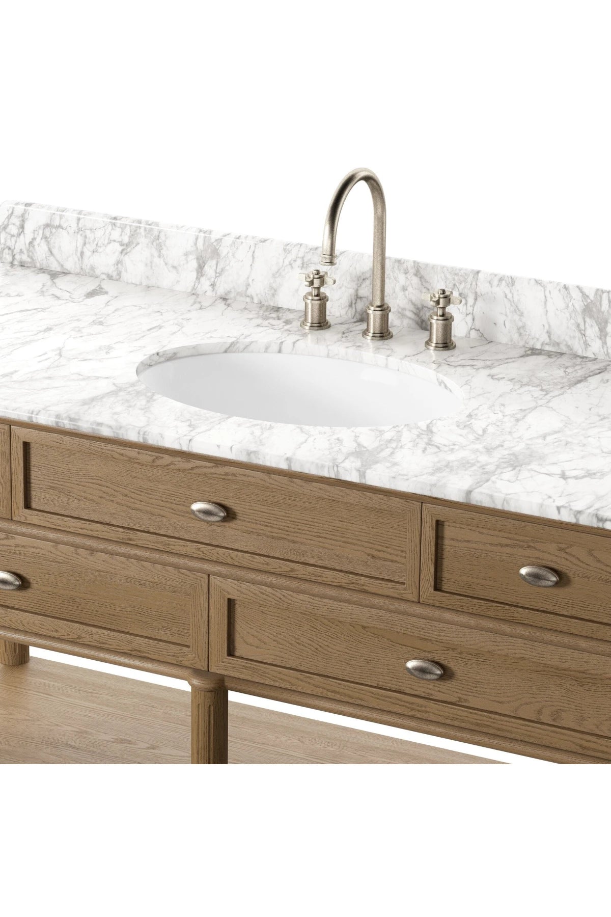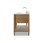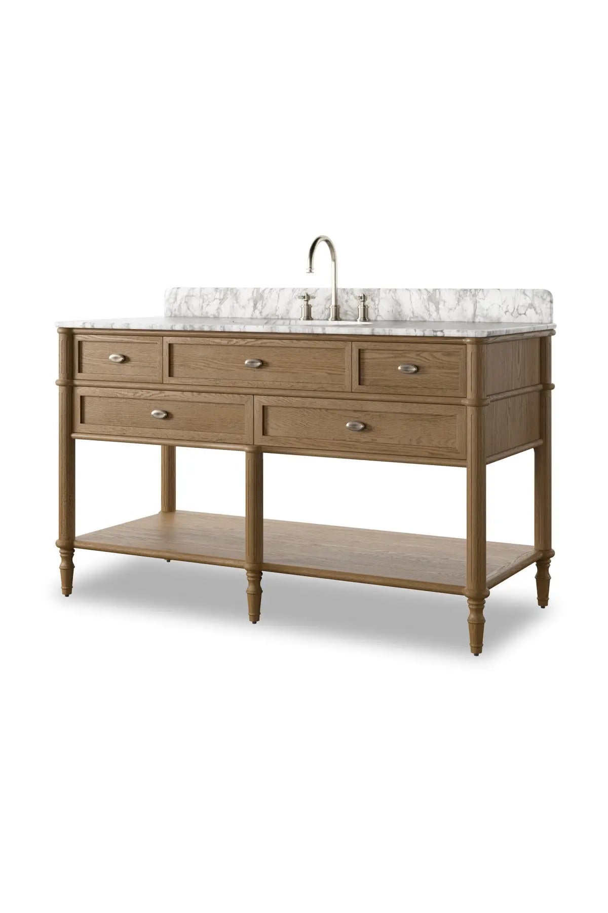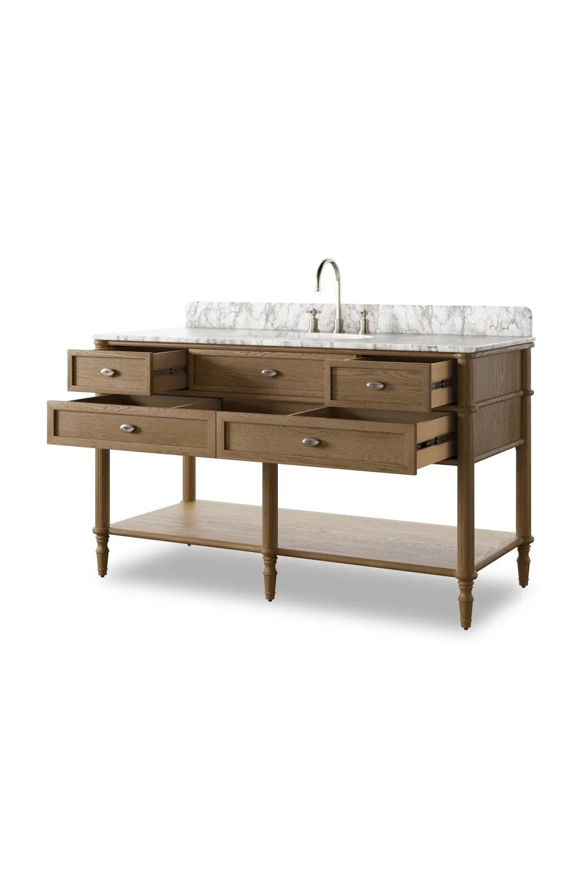Meet the Toulouse Single Wide Vanity. Influenced by vintage European lines, this inspired bath vanity brings a sense of calm and serenity to the bath space. Crafted from solid oak and veneer with rounded corners and tapered spindle legs in a natural washed blonde finish, aged satin brass hardware and a Carrara marble top. Includes four functional drawers and a deep open shelf below. Finished with a bath-safe sealant for moisture resistance. Designed to accommodate 8"-widespread faucets and standard-size hardware for easy customization; faucet shown not included. Sink and backsplash included; backsplash ships separately. Removable back with cutouts for plumbing; fits standard P-trap. Professional installation required.