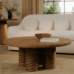 Meet the Treccia Round Coffee Table. The table features an exaggerated, elegantly detailed pedestal base, presenting a bold modern twist while ensuring practicality. Its pedestal design is visually appealing and enhances functionality, creating a welcoming, uncluttered space for gatherings and everyday use.