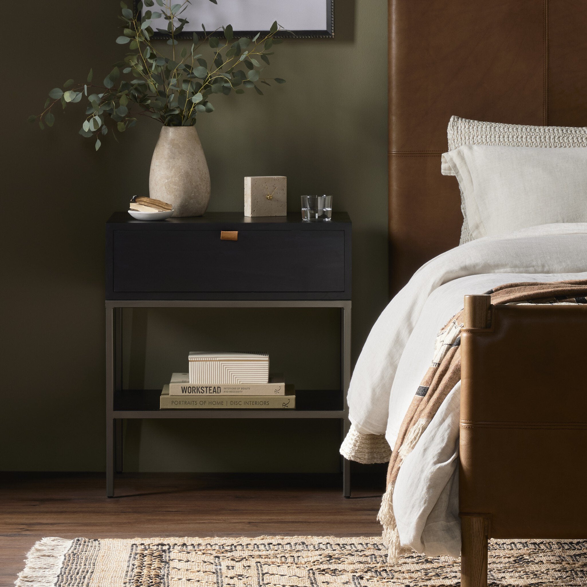 Meet the Trey Nightstand. Inspired by clean mid-century design, a stylish nightstand of solid black-washed poplar brings extra space to bedside storage. Metal-secured leather pull adds a textural element of surprise.