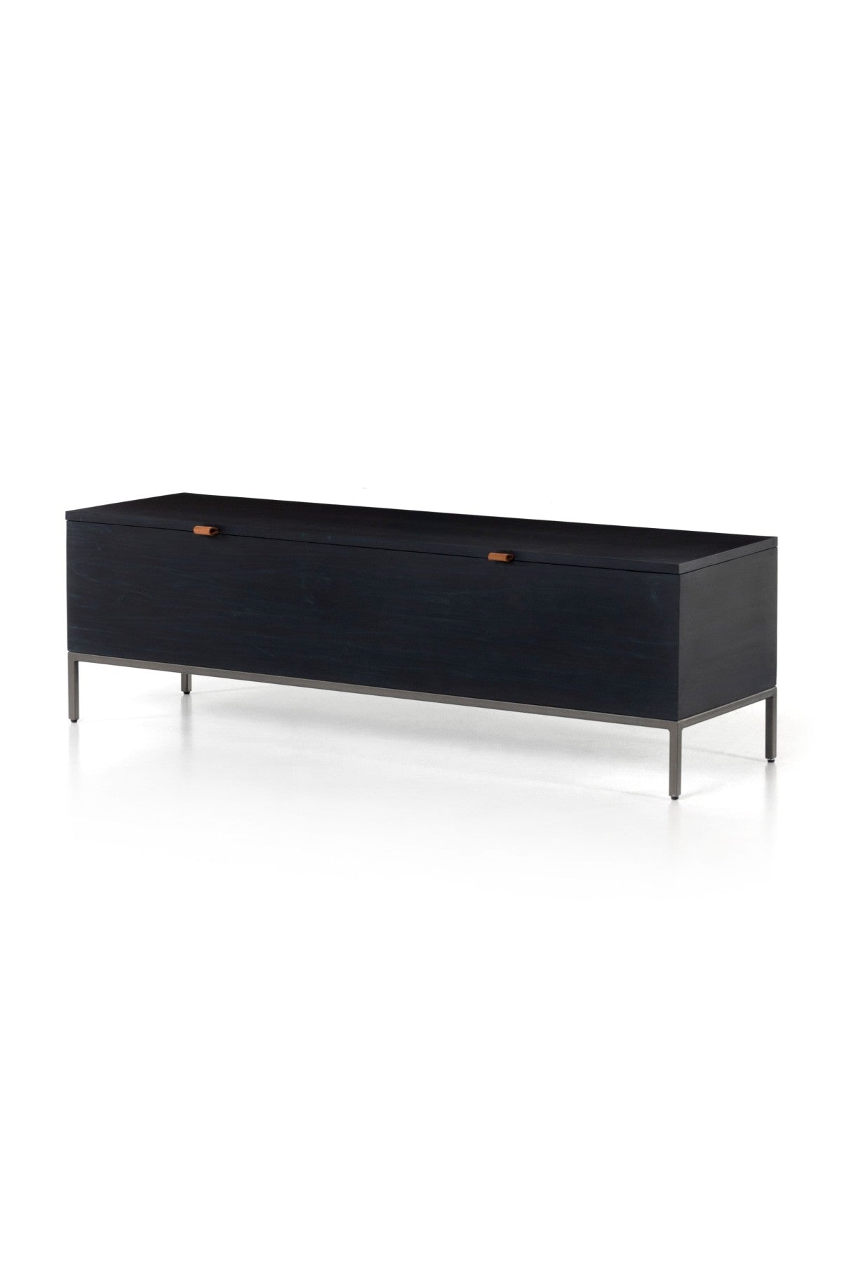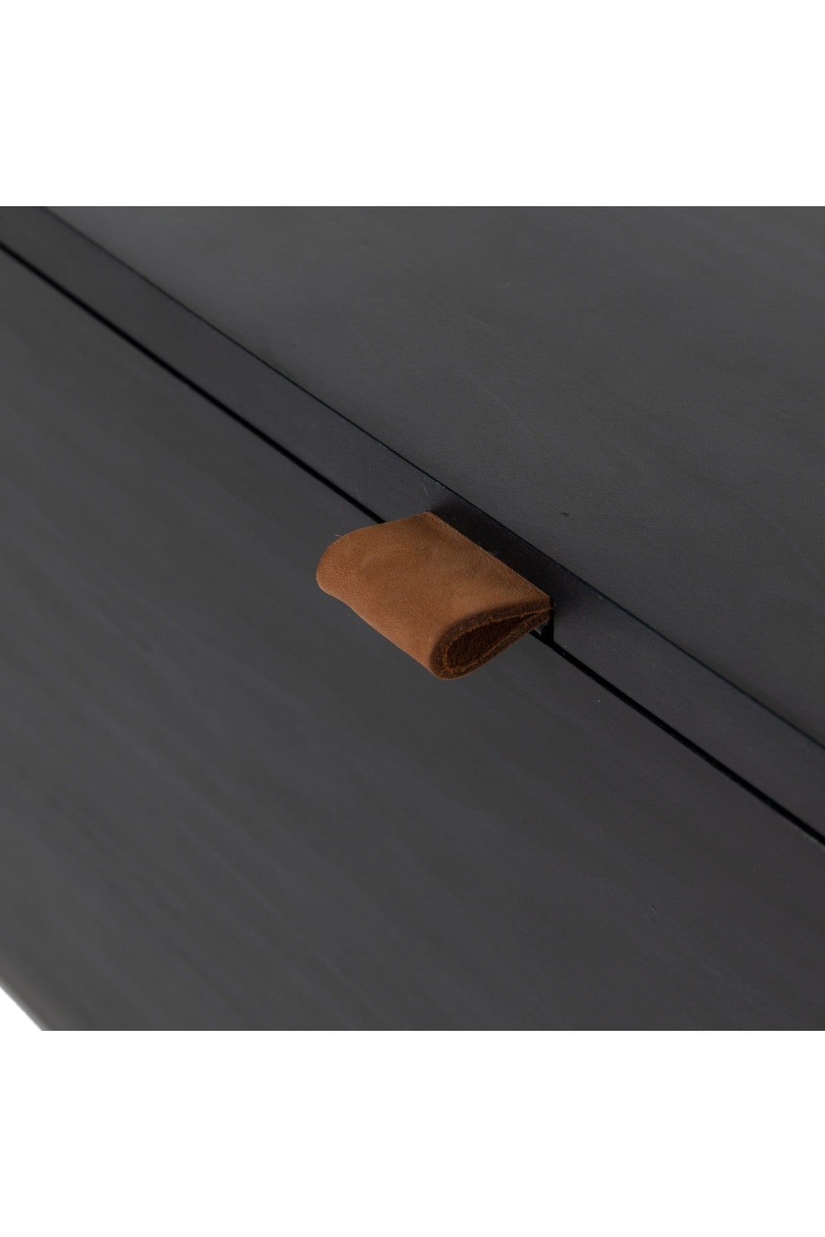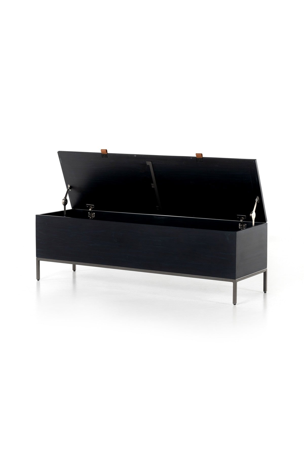 Meet the Trey Trunk. A spacious trunk black-washed poplar is perfect when styled at the foot of the bed for storage of extra blankets, linens, seasonal items, and more. Toffee-colored pulls of top-grain leather add modernity.