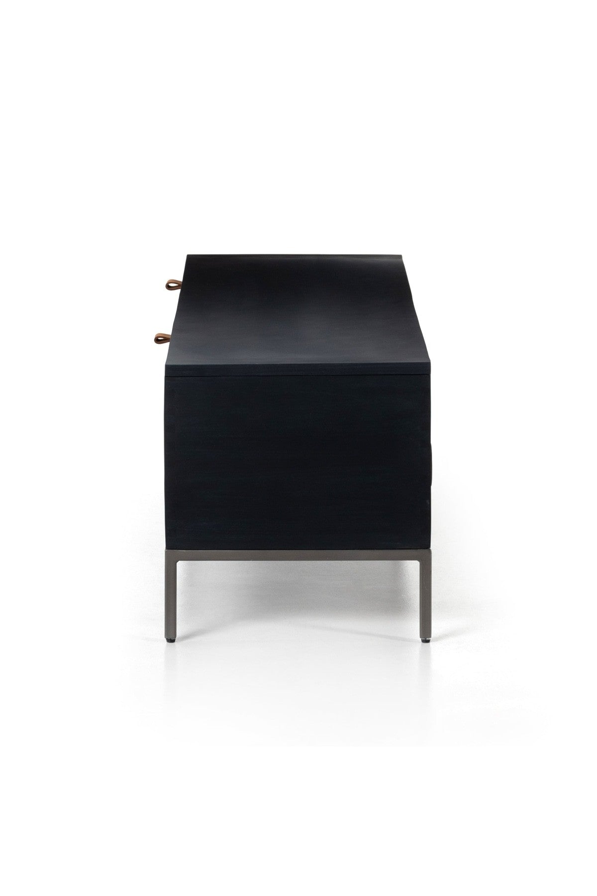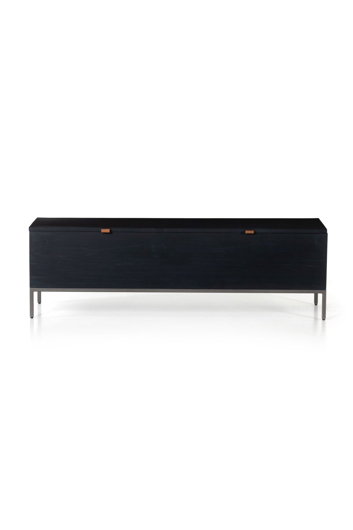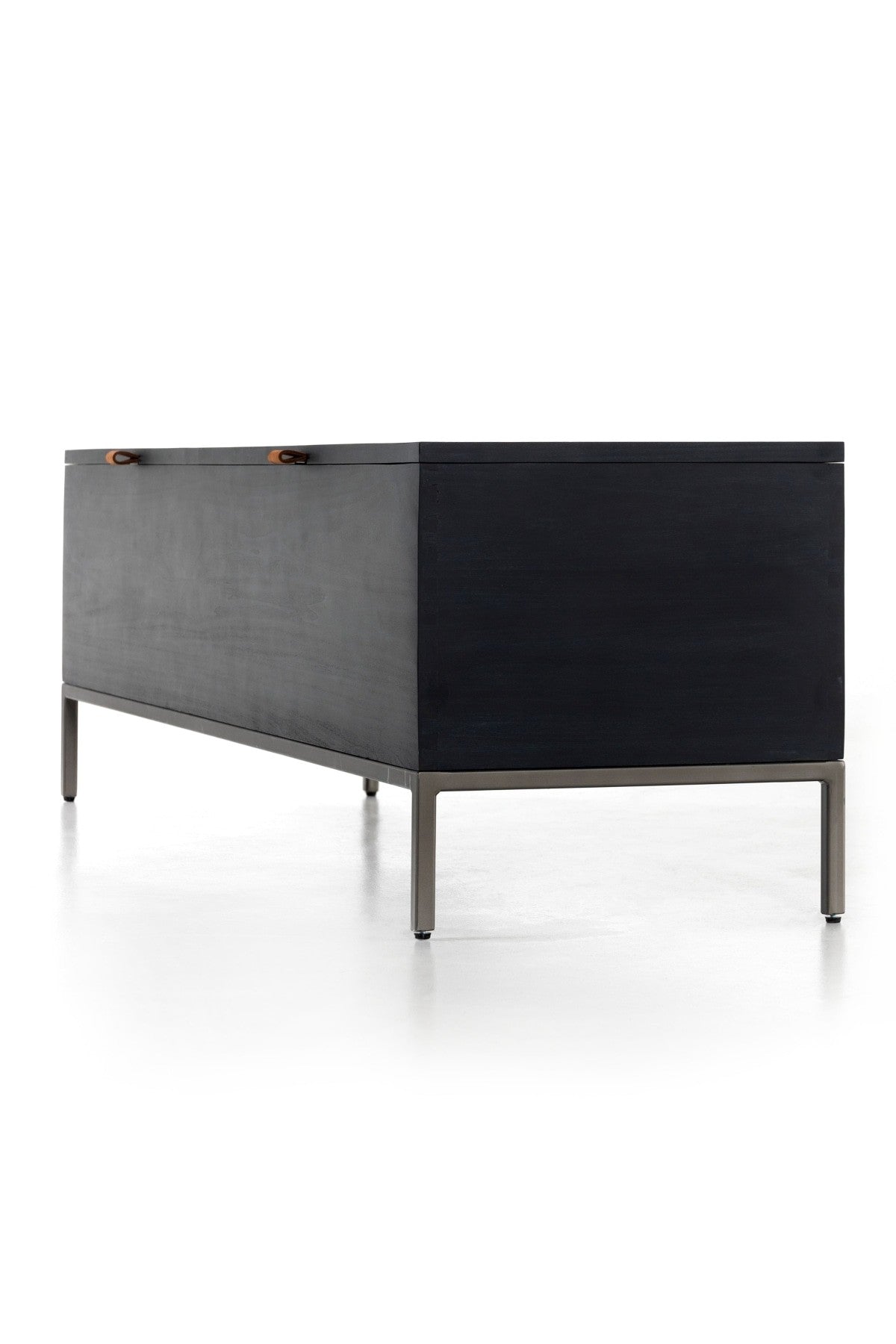Meet the Trey Trunk. A spacious trunk black-washed poplar is perfect when styled at the foot of the bed for storage of extra blankets, linens, seasonal items, and more. Toffee-colored pulls of top-grain leather add modernity.