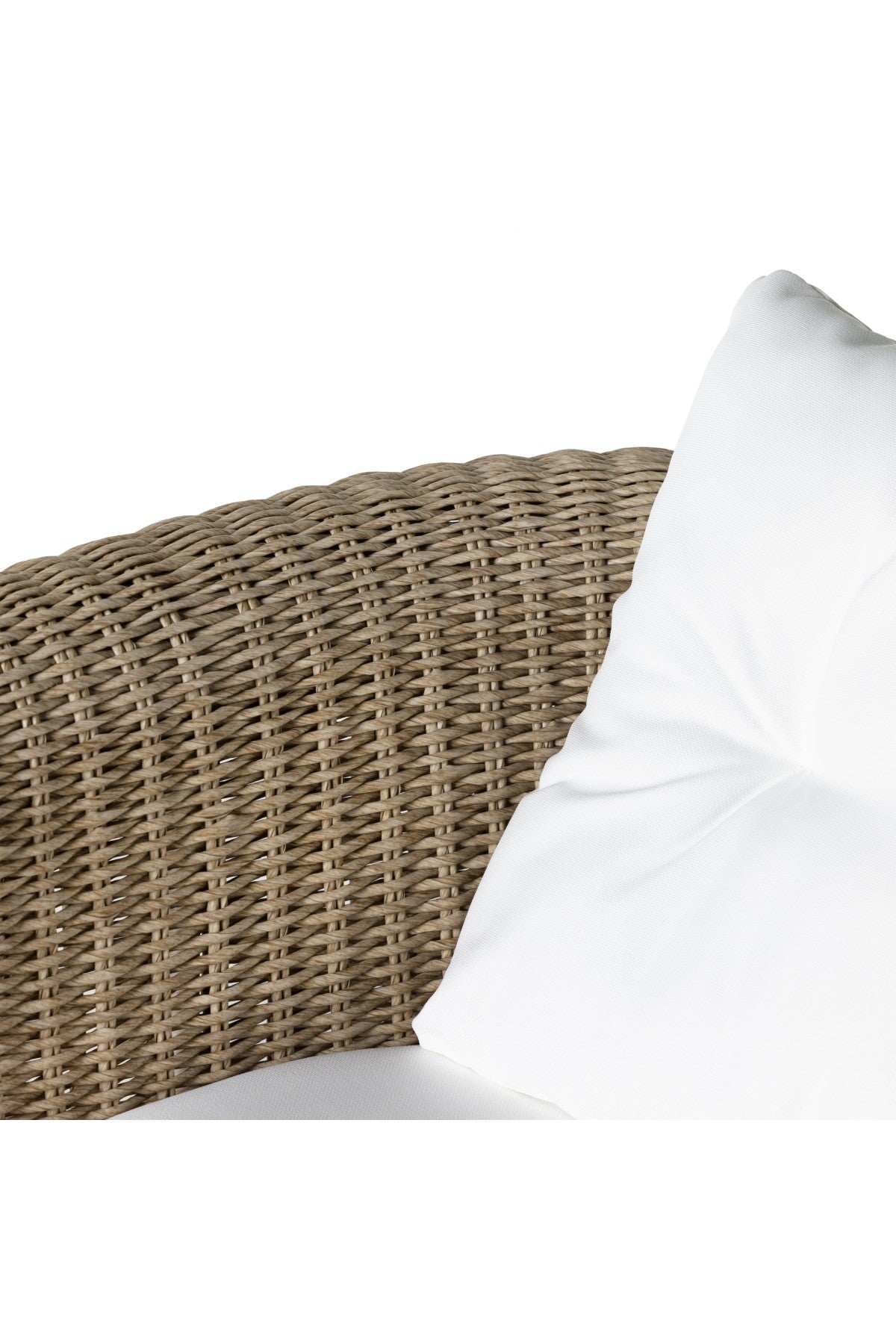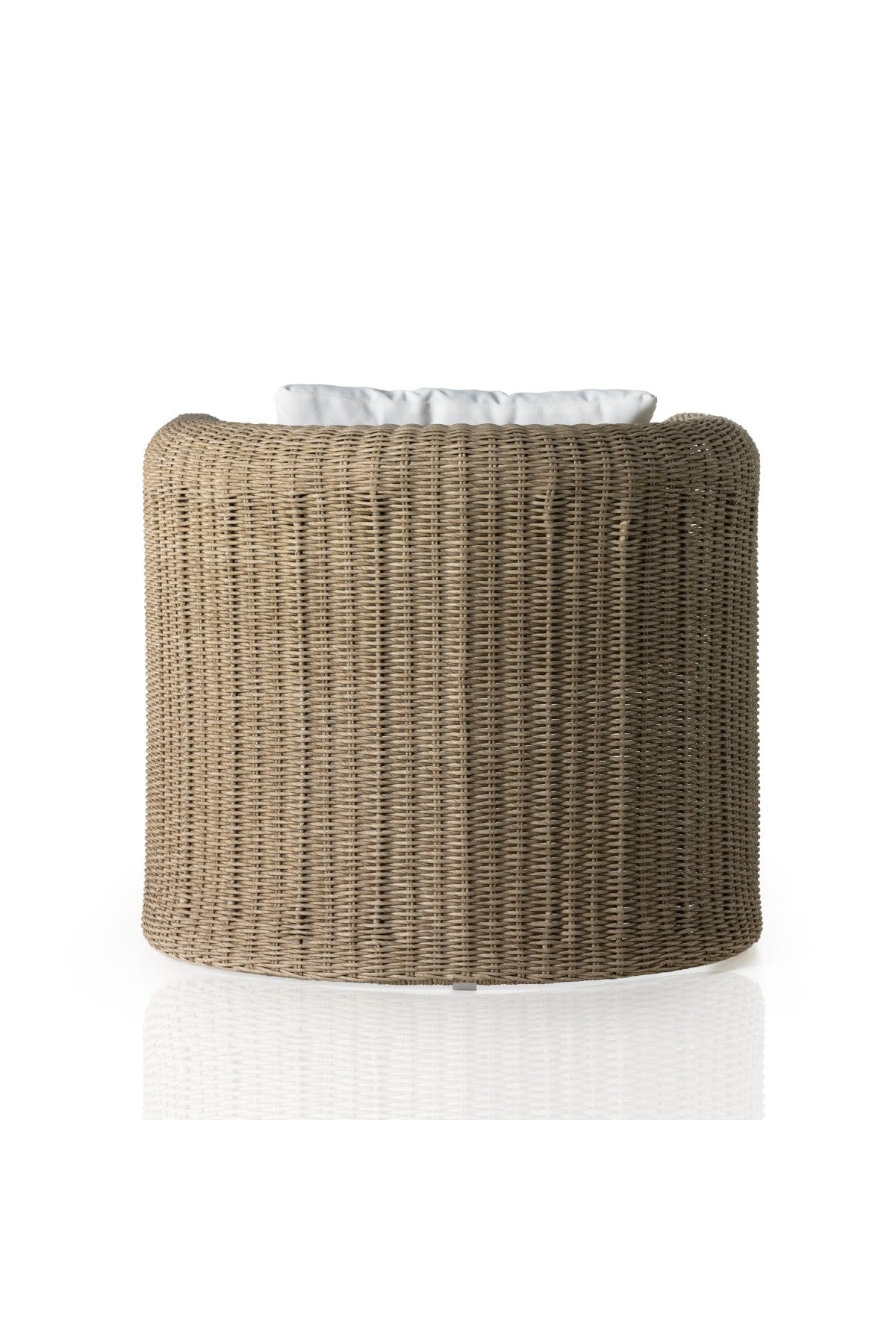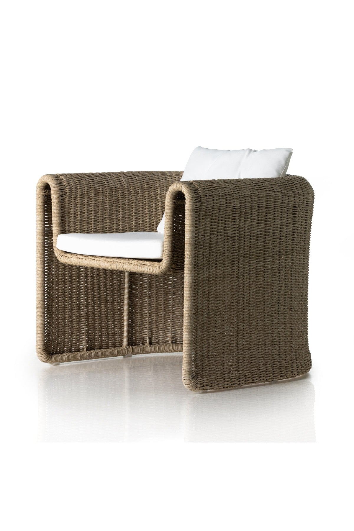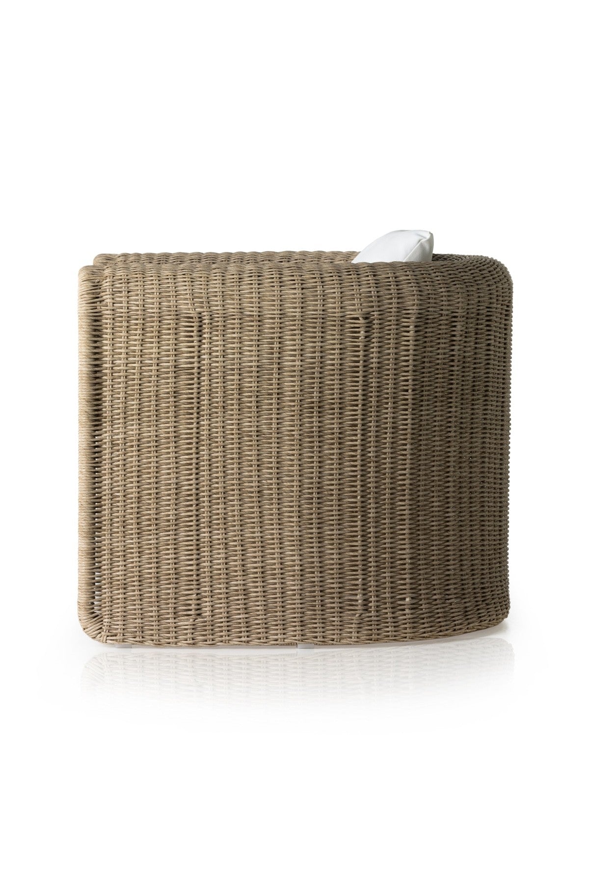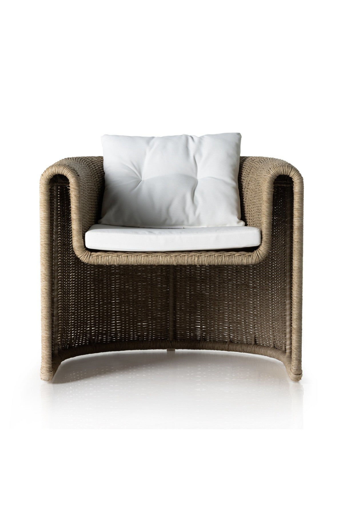 Meet the Tucson Woven Outdoor Chair. A nod to curvy Seventies styling, woven natural wicker framing forms a fluid, sling-like shape with a waterfall arm, with durable tufted cushioning in a versatile white. Cover or store indoors during inclement weather and when not in use.