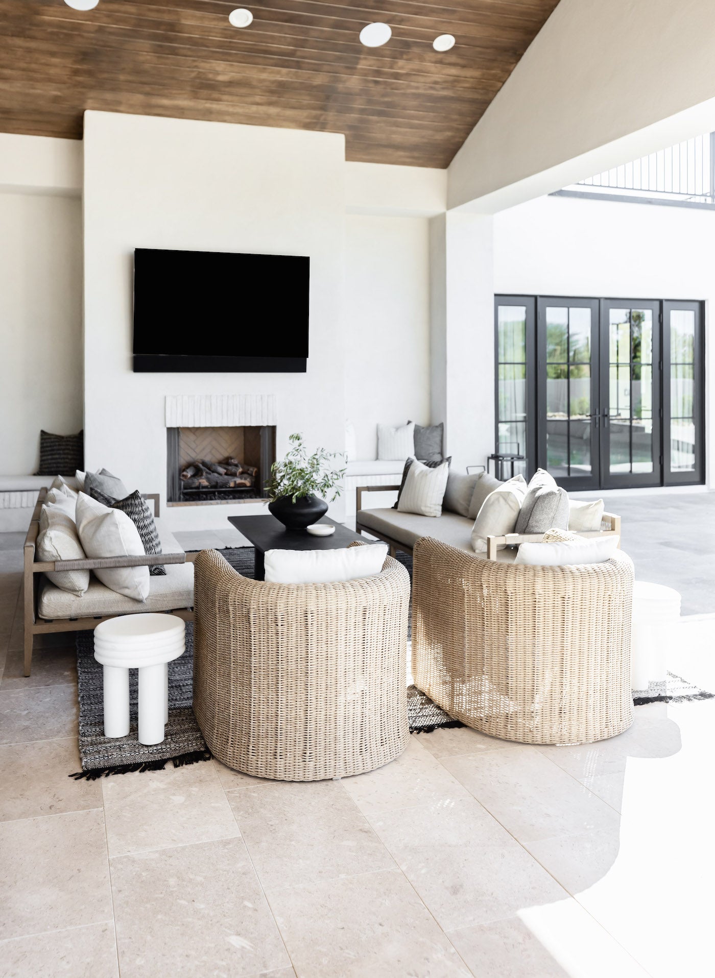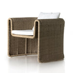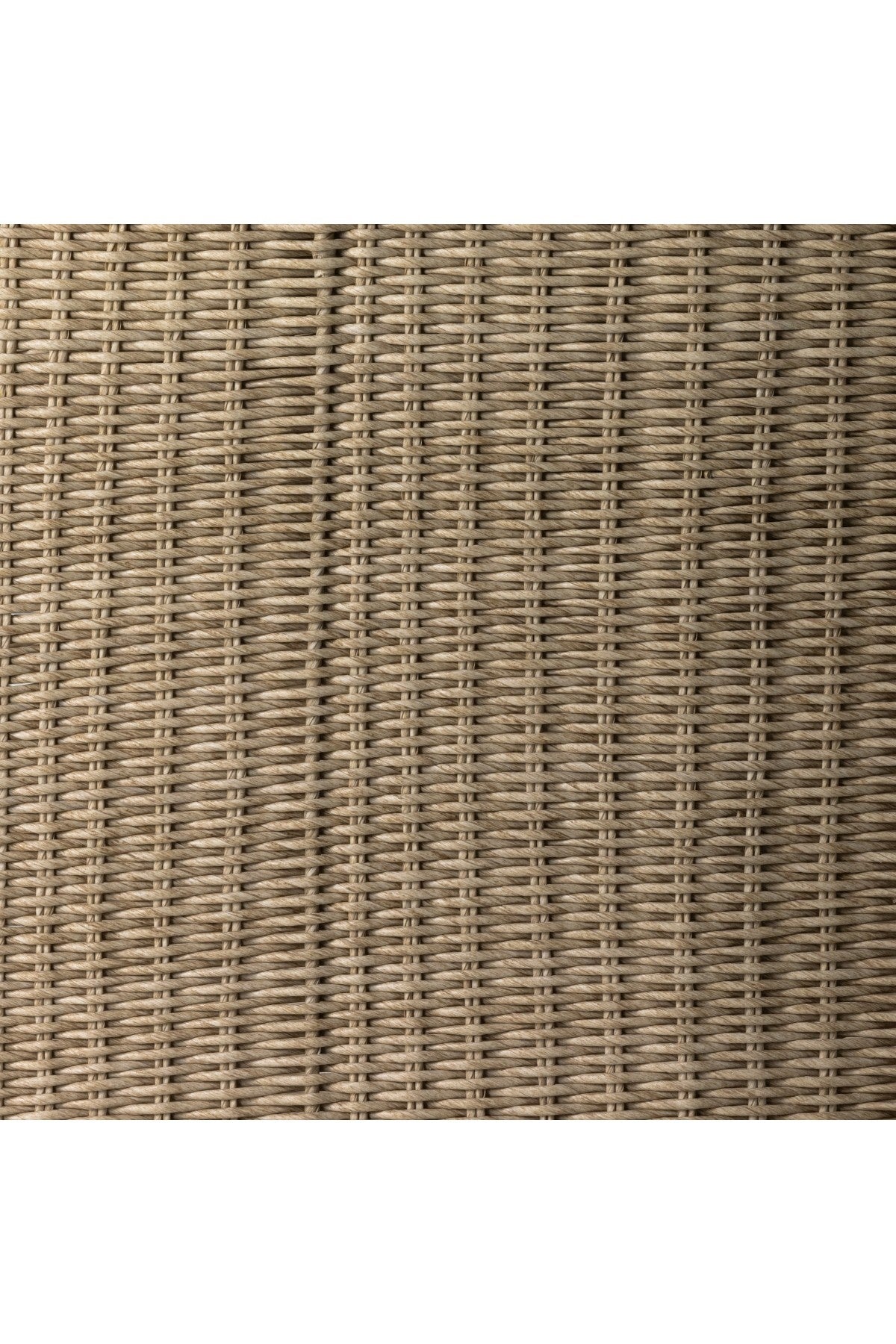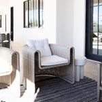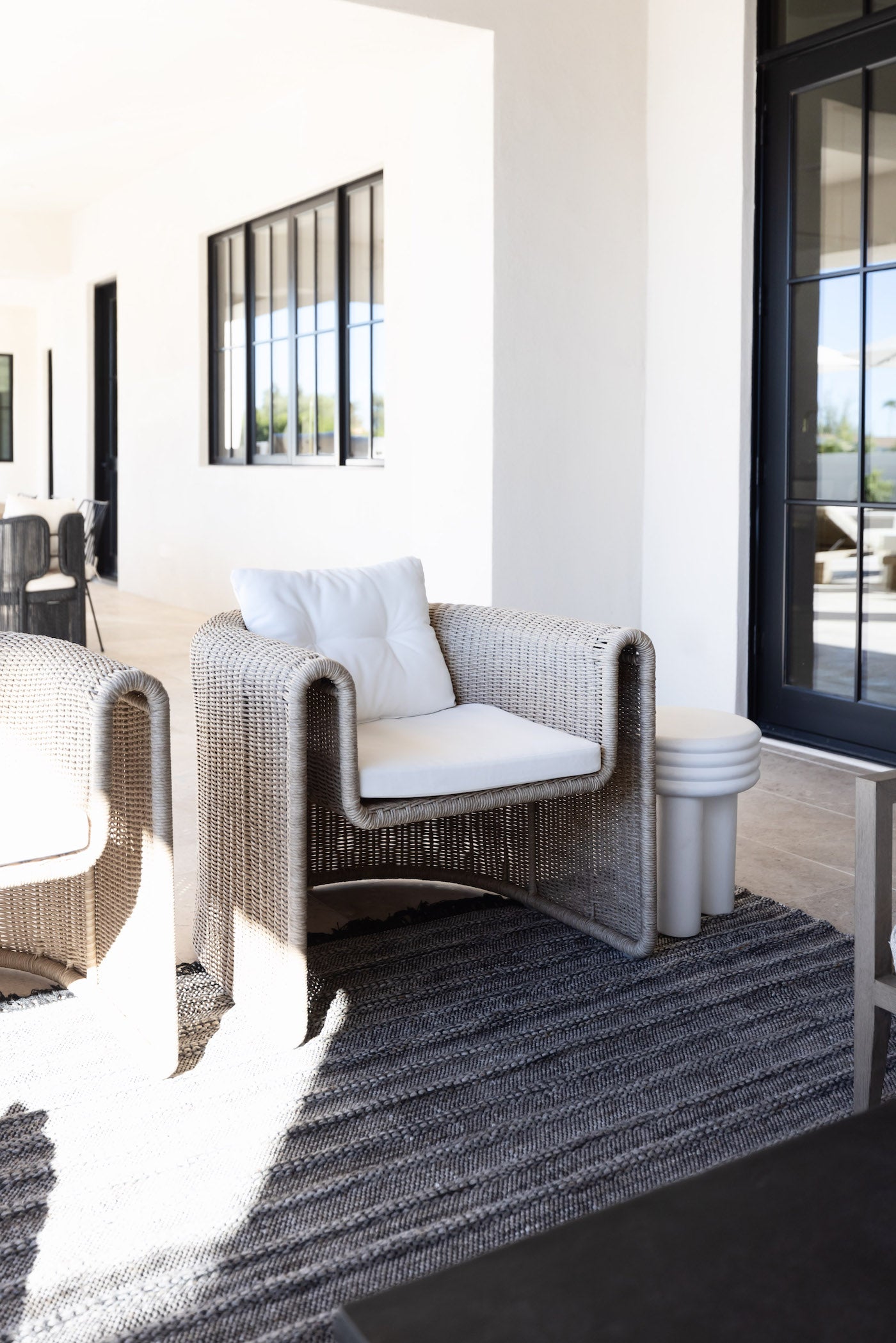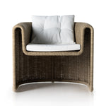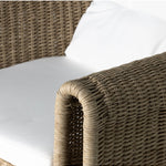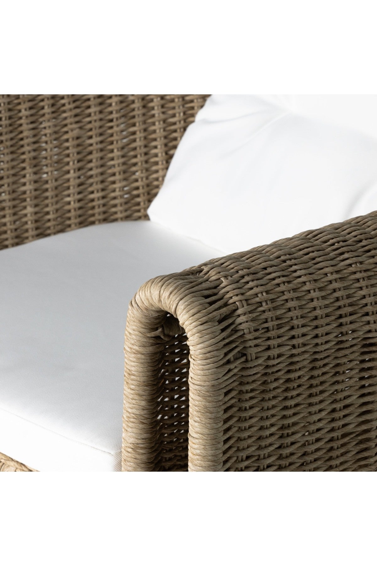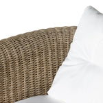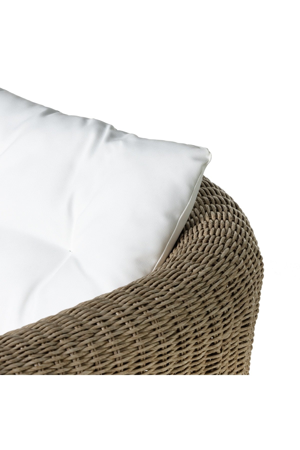 Meet the Tucson Woven Outdoor Chair. A nod to curvy Seventies styling, woven natural wicker framing forms a fluid, sling-like shape with a waterfall arm, with durable tufted cushioning in a versatile white. Cover or store indoors during inclement weather and when not in use.