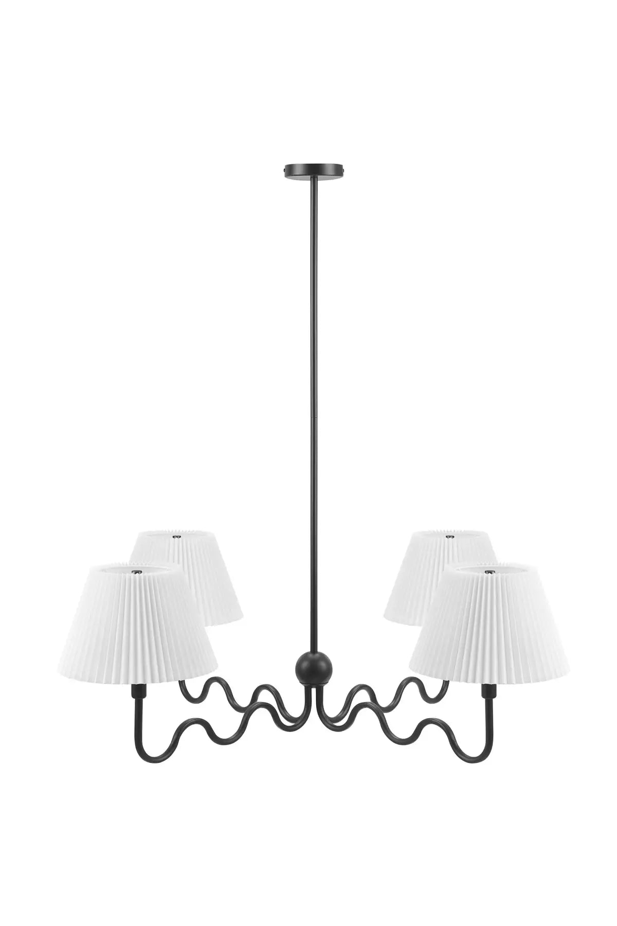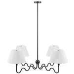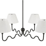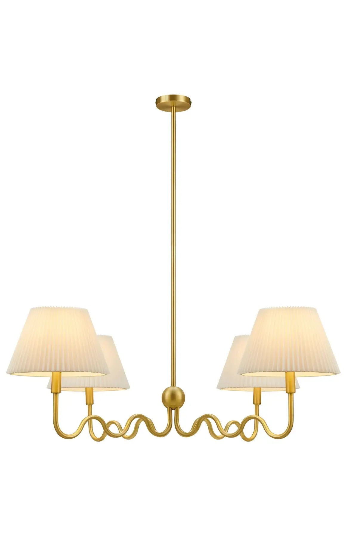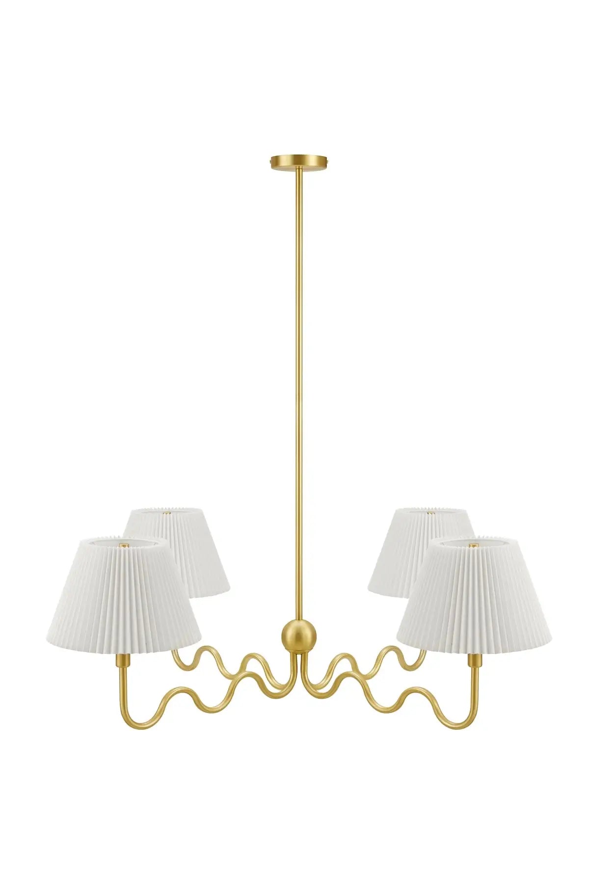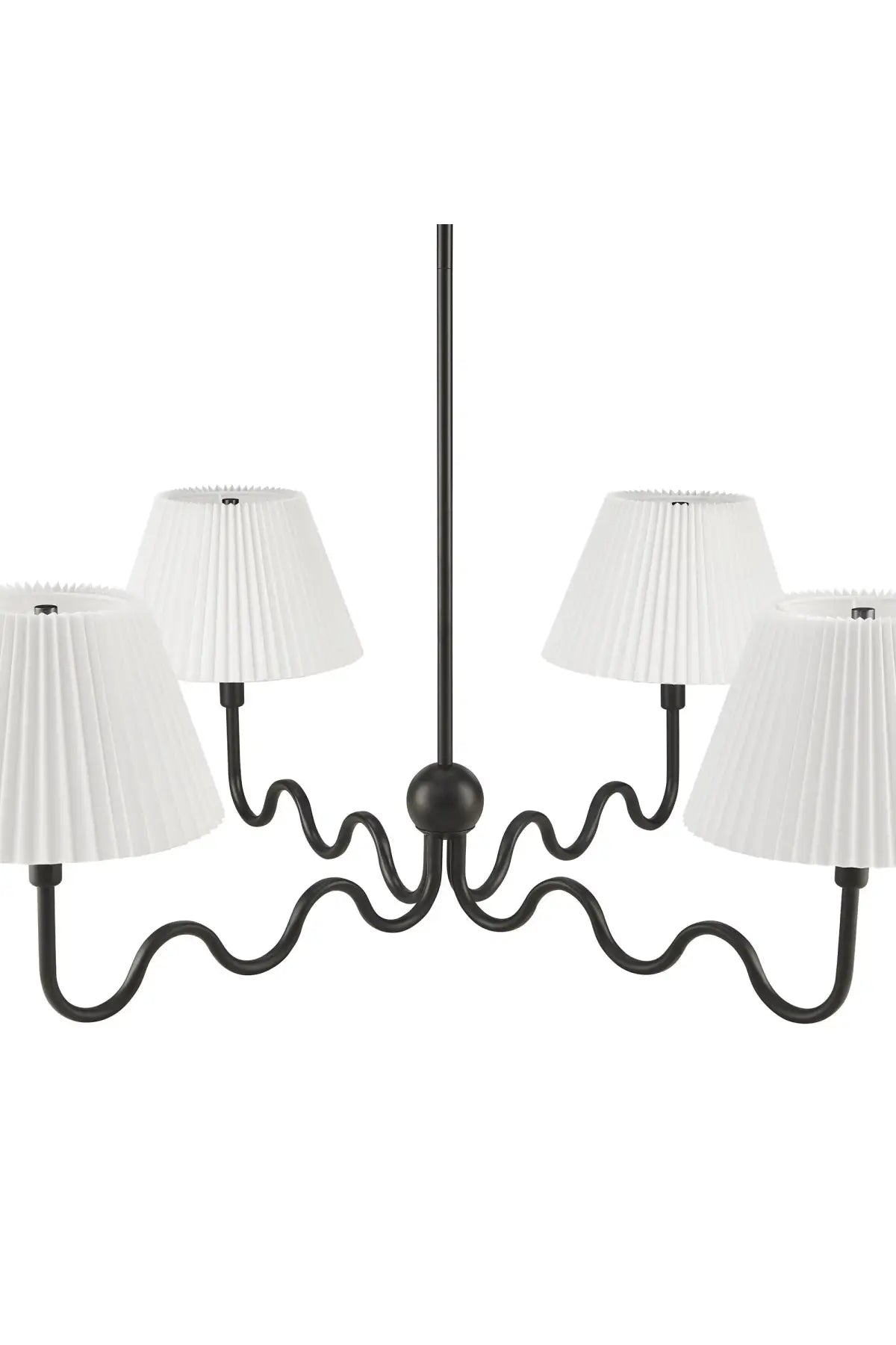 Meet the Wave Squiggle 4-Arm Pendant, blending contemporary design with timeless elegance. Featuring playful metal squiggle rods and four pleated fabric shades, it casts a warm glow, perfect for an entryway, living space, or dining room. The hardwired design ensures a clean look, anchored by a sleek metal ceiling canopy. ETL listed and approved. Bulb(s) not included. Assembly required.