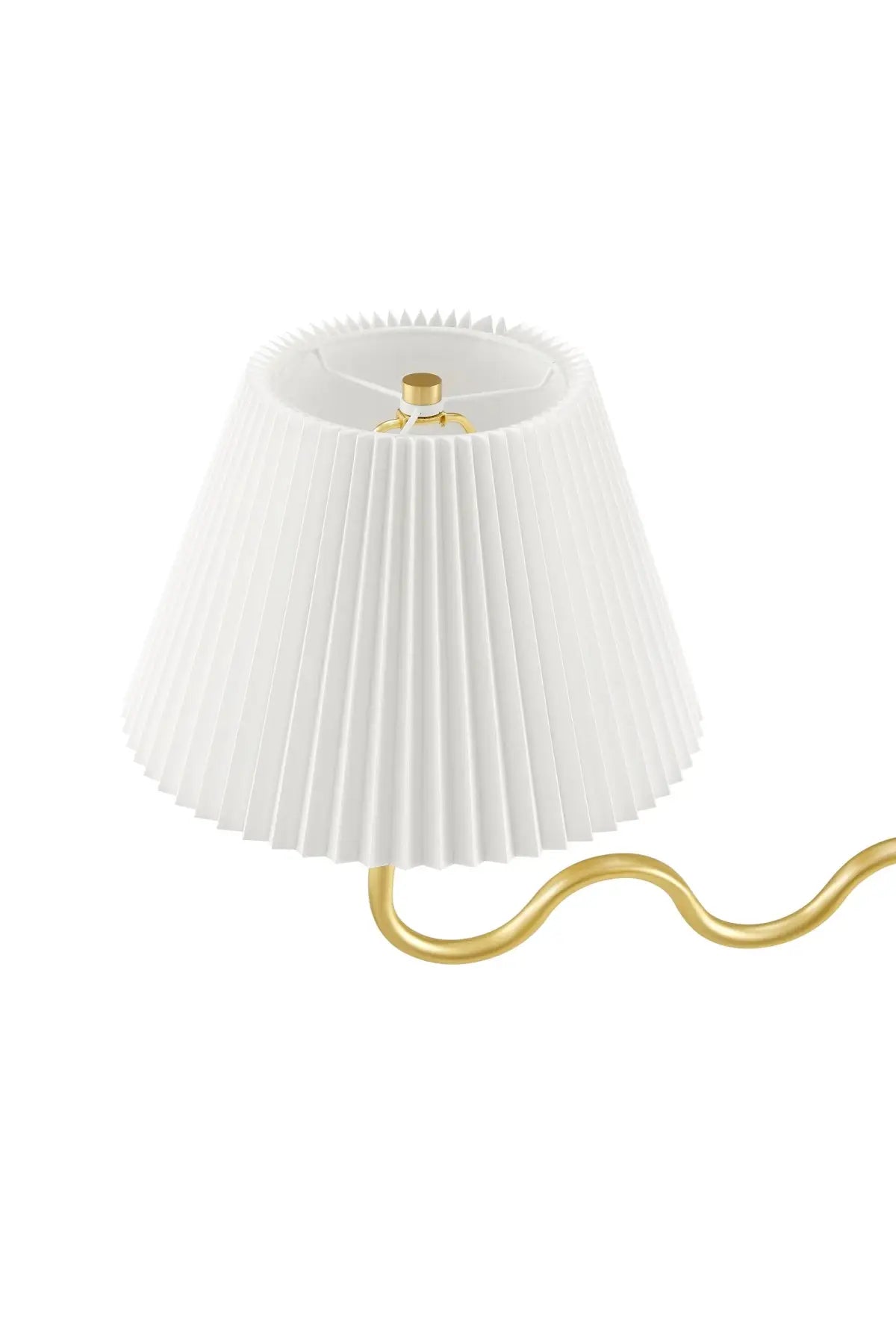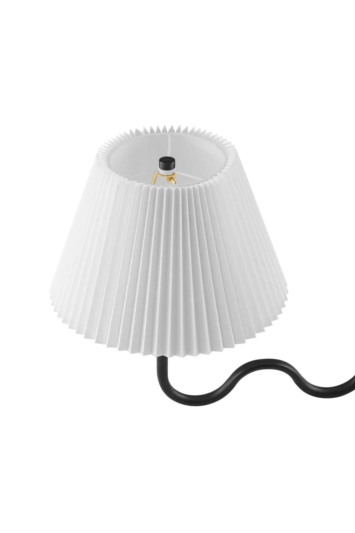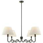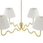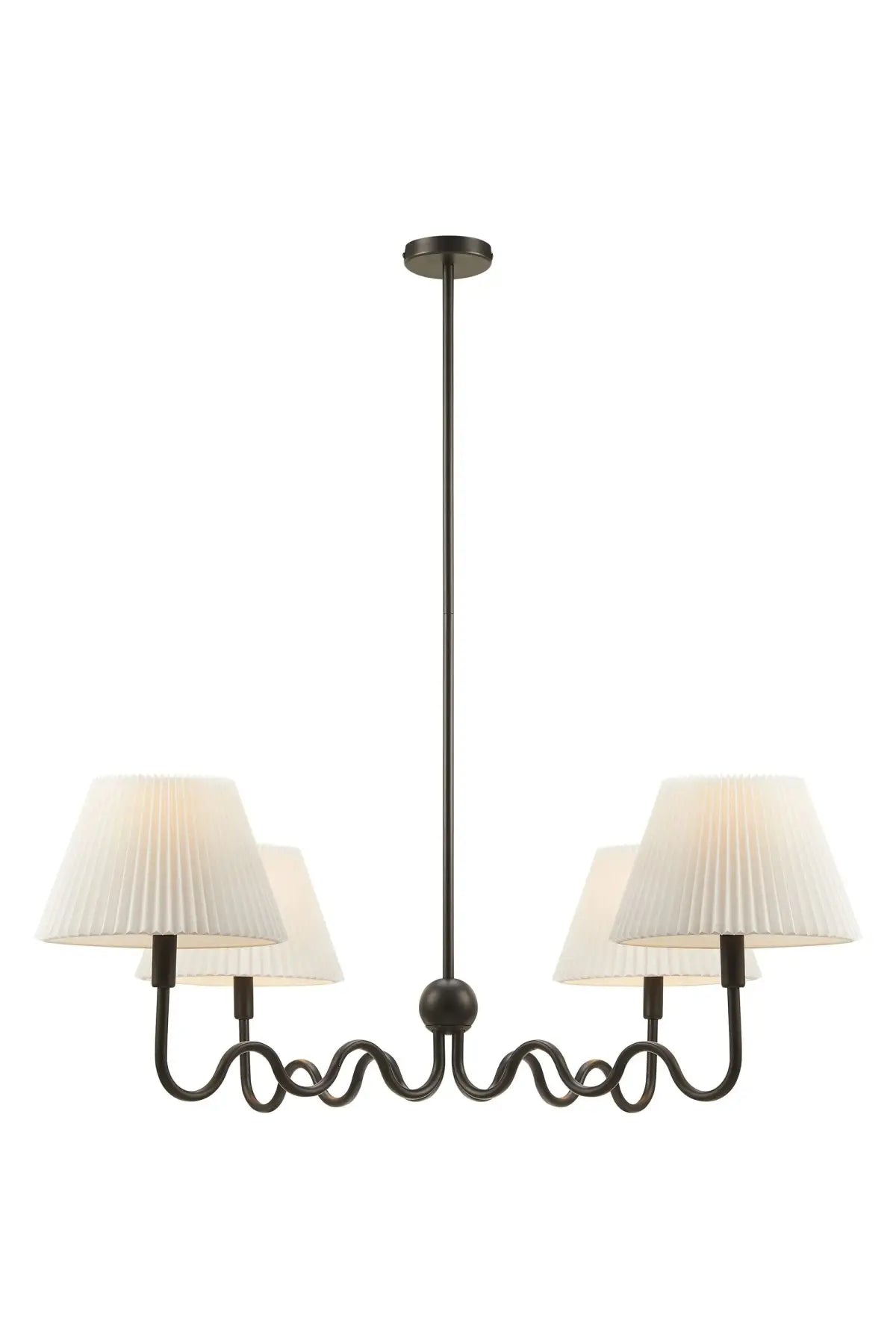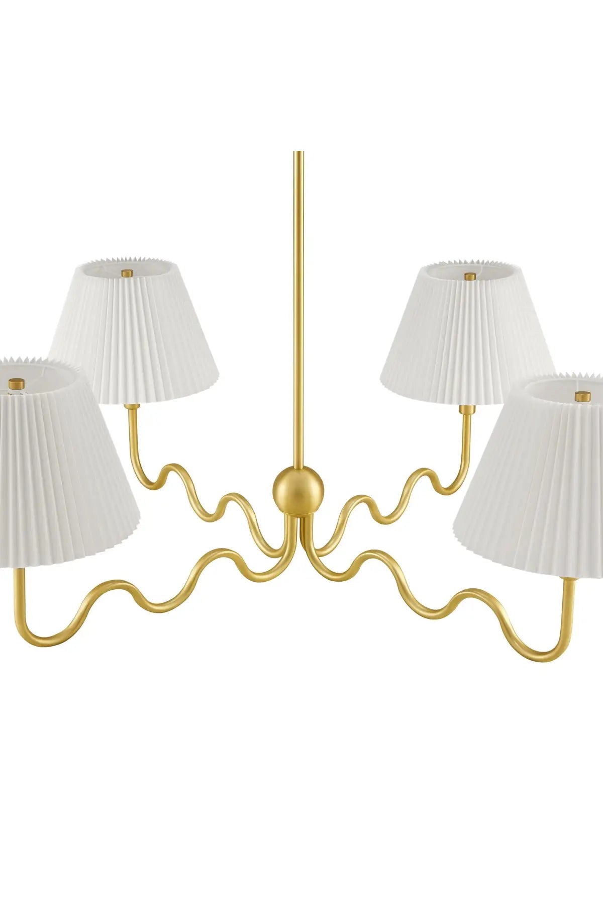 Meet the Wave Squiggle 4-Arm Pendant, blending contemporary design with timeless elegance. Featuring playful metal squiggle rods and four pleated fabric shades, it casts a warm glow, perfect for an entryway, living space, or dining room. The hardwired design ensures a clean look, anchored by a sleek metal ceiling canopy. ETL listed and approved. Bulb(s) not included. Assembly required.