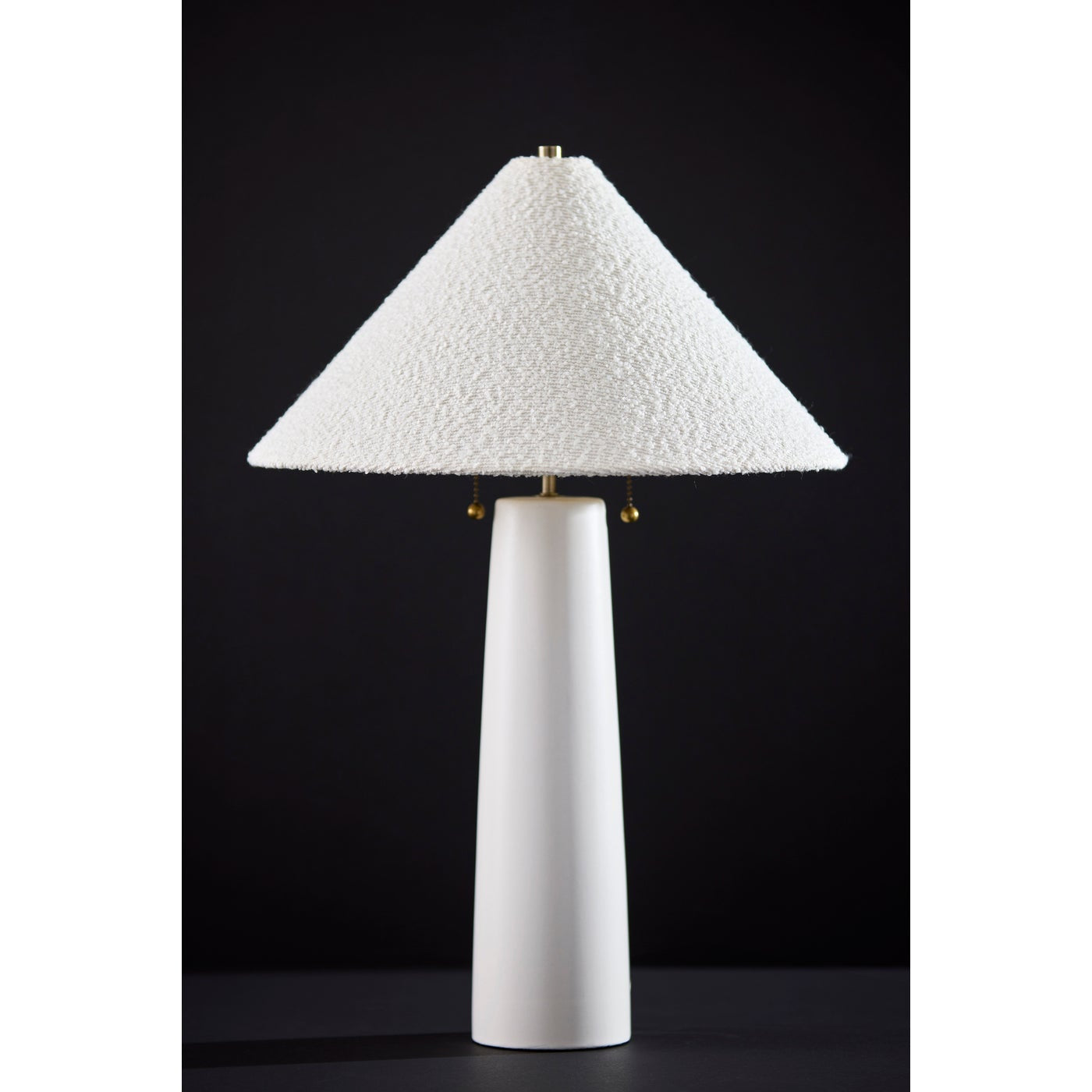Introducing the Waylon Table Lamp, a perfect combination of modern design and timeless elegance. Featuring a sleek white ceramic base, this lamp brings a fresh, clean look to any space. Paired with a tapered white boucle fabric shade, it exudes a soft and textured sophistication. The on/off double pull chain switches provide effortless control, blending both style and function in a single piece. Elegant and functional this lamp combines clean design with practical features to suit various interiors.