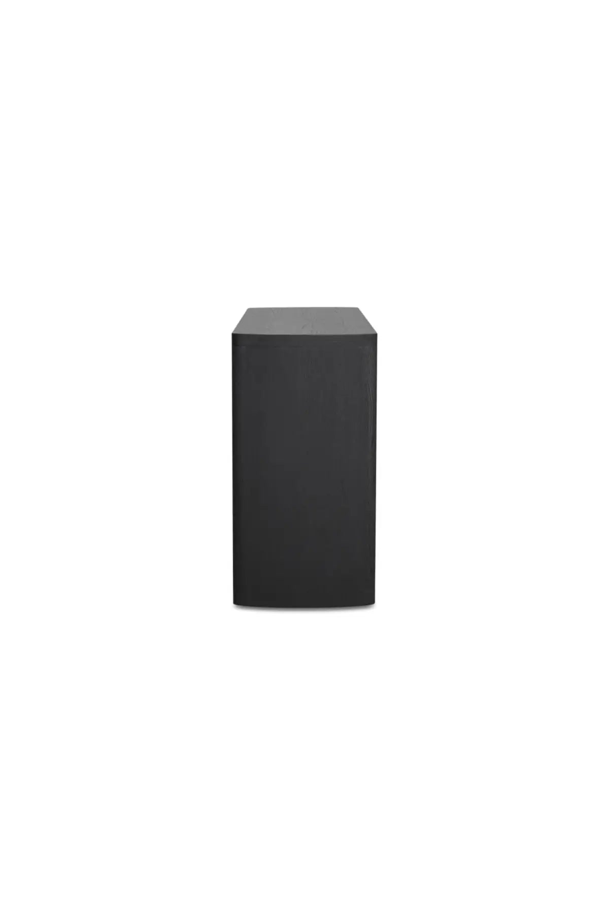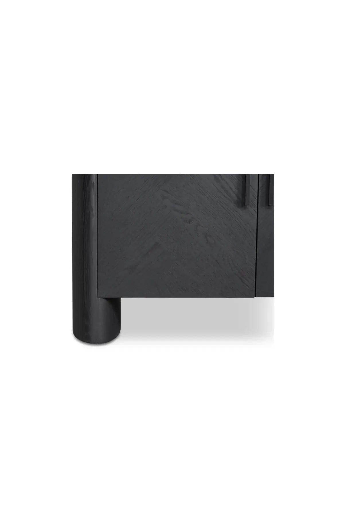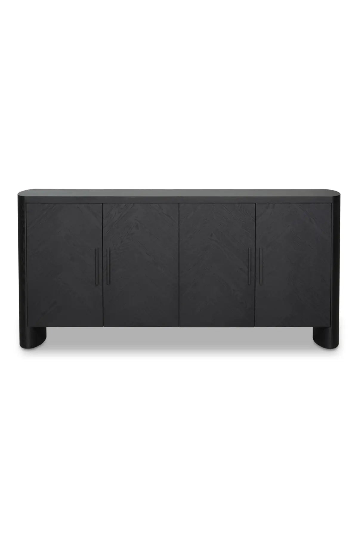 The William Sideboard showcases a sleek, modern silhouette with a rounded edge frame and base. A herringbone pattern embellishes its door front, adding a touch of sophistication, while the sideboard's rich black stain finish exudes a sense of maturity and timelessness.