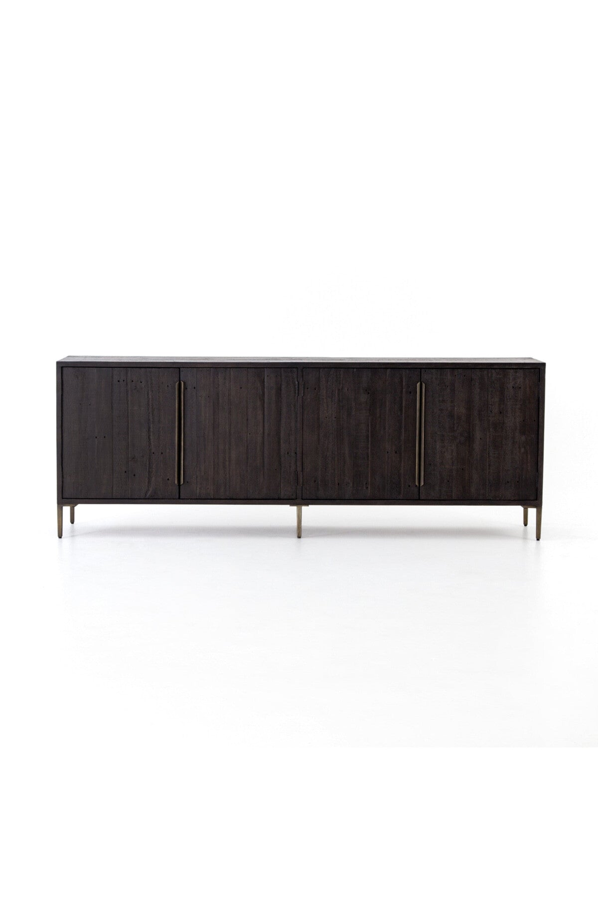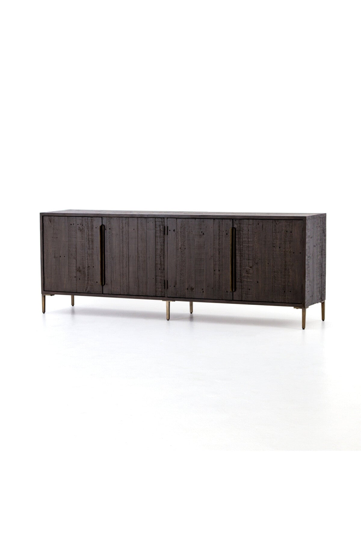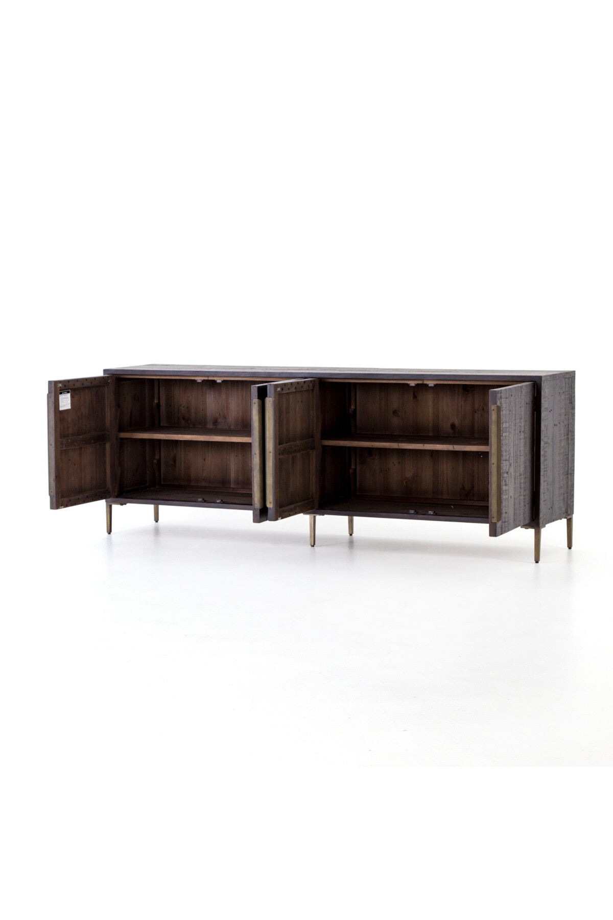 Meet the Wyeth Sideboard. Reclaimed pine takes on a deep carbon tone, letting natural graining emit its innately rich character. Slim legs and flat, elongated antique brass-finished iron hardware place a fresh spin on a streamlined form. Four doors and interior shelving for ample dining or living room storage.