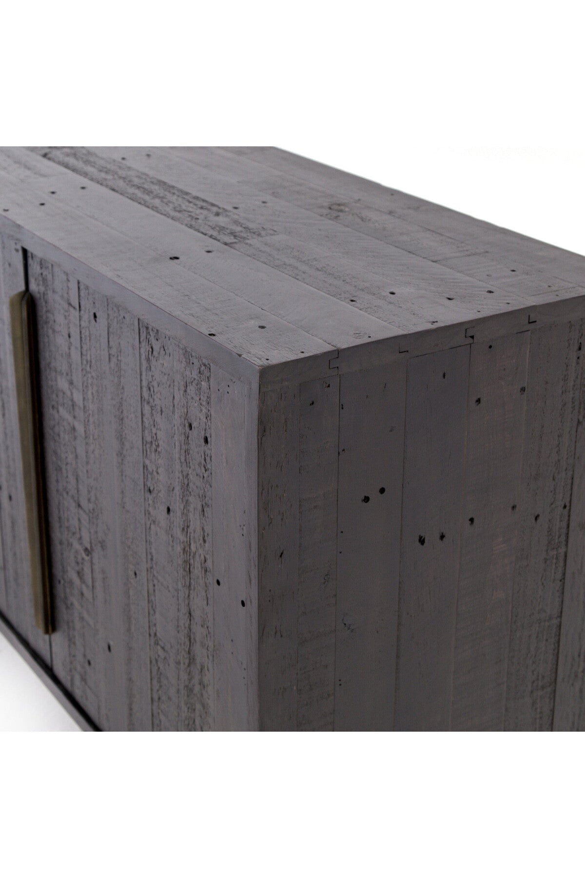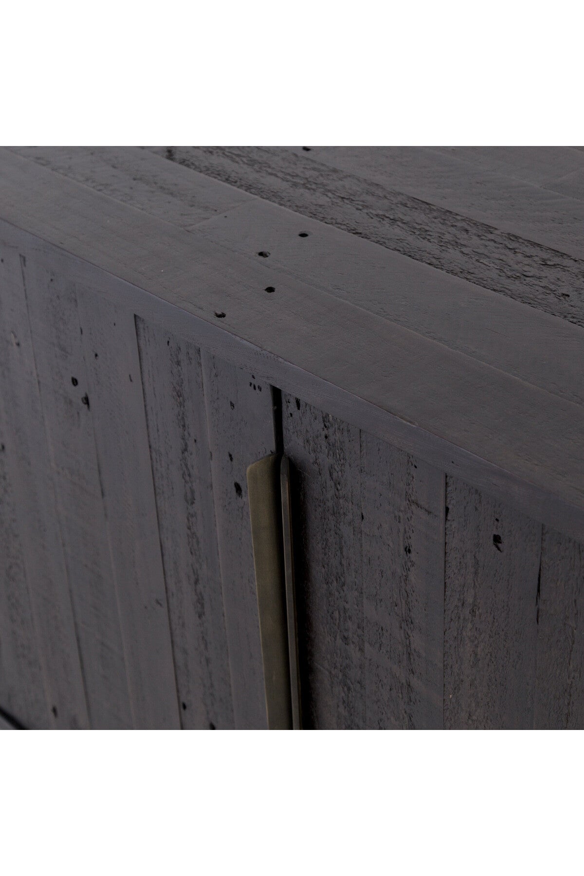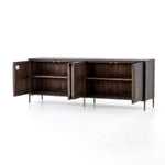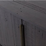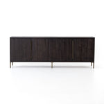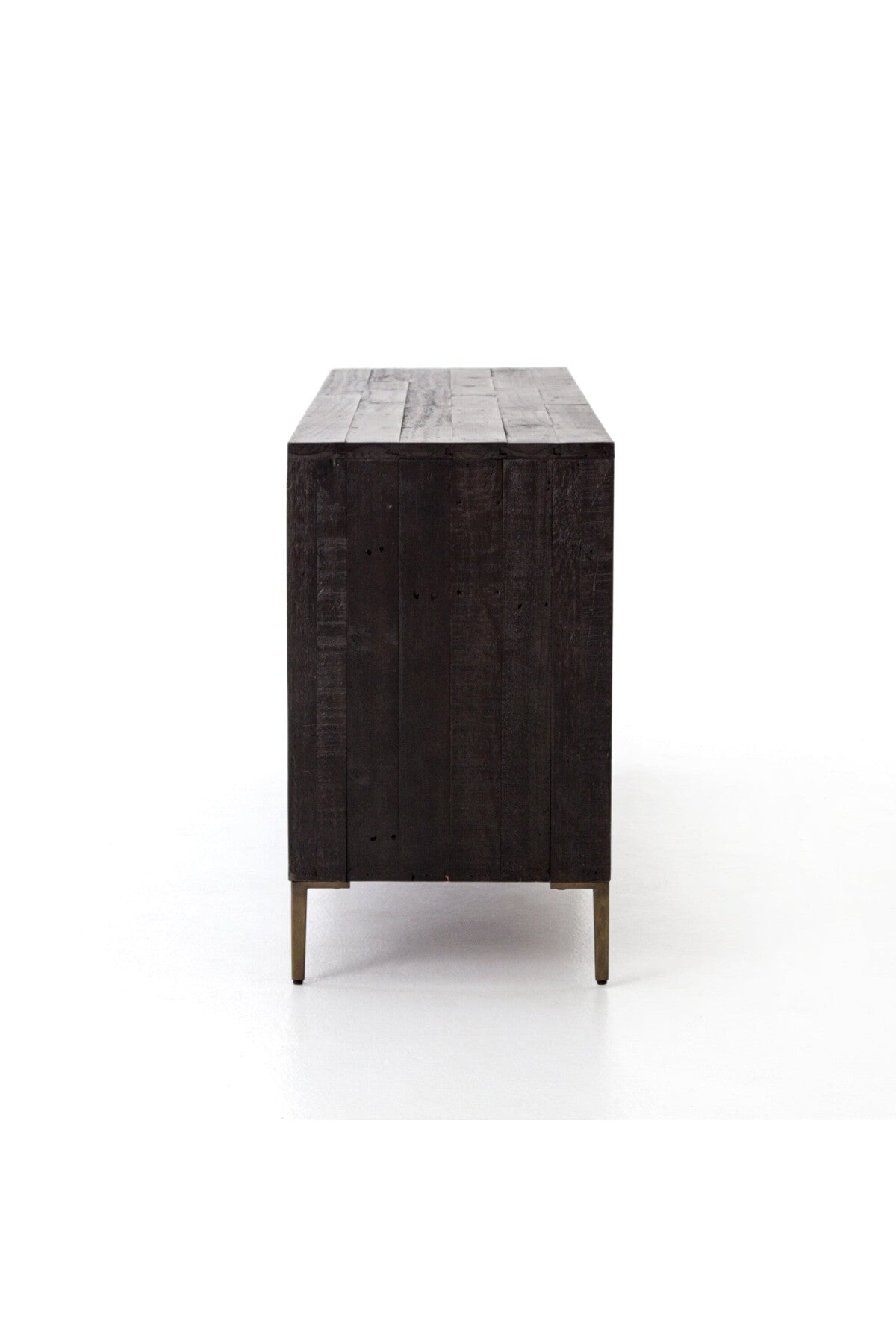 Meet the Wyeth Sideboard. Reclaimed pine takes on a deep carbon tone, letting natural graining emit its innately rich character. Slim legs and flat, elongated antique brass-finished iron hardware place a fresh spin on a streamlined form. Four doors and interior shelving for ample dining or living room storage.