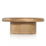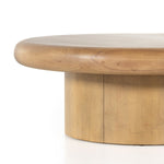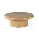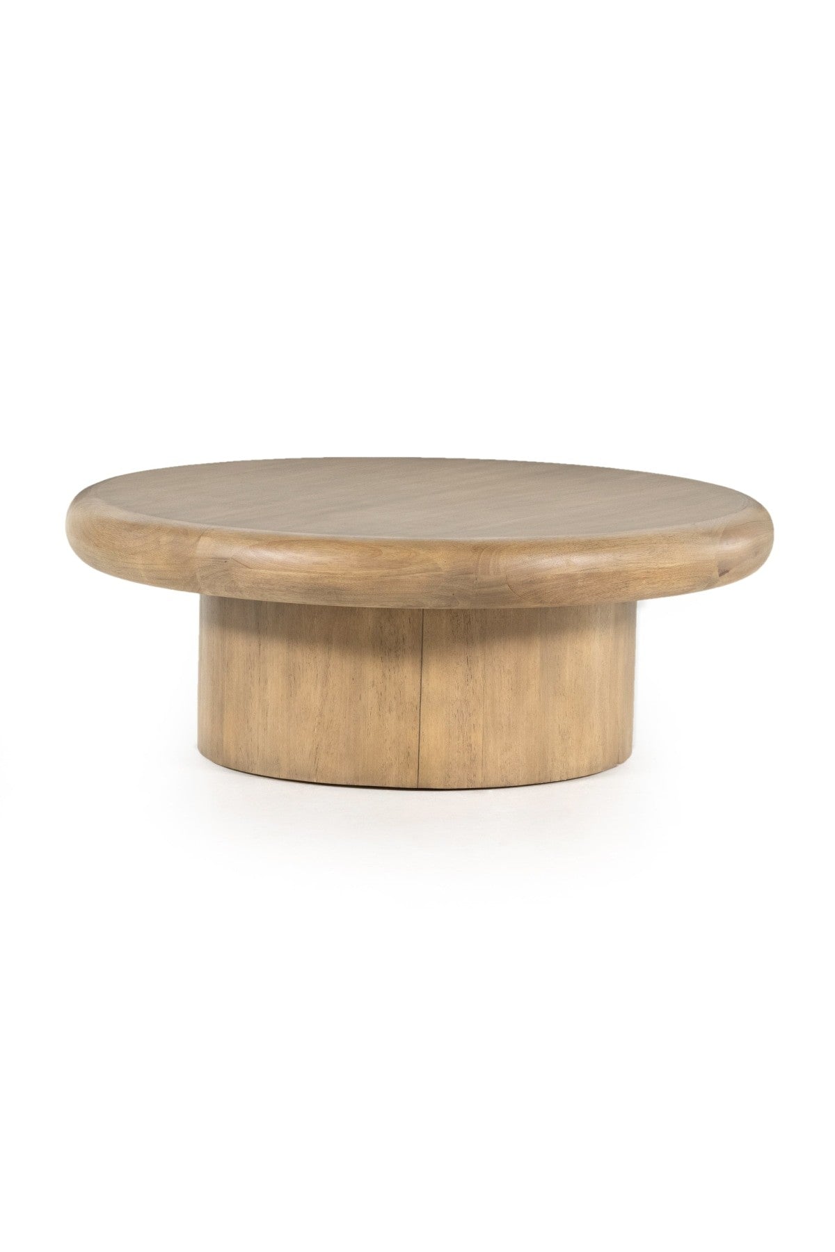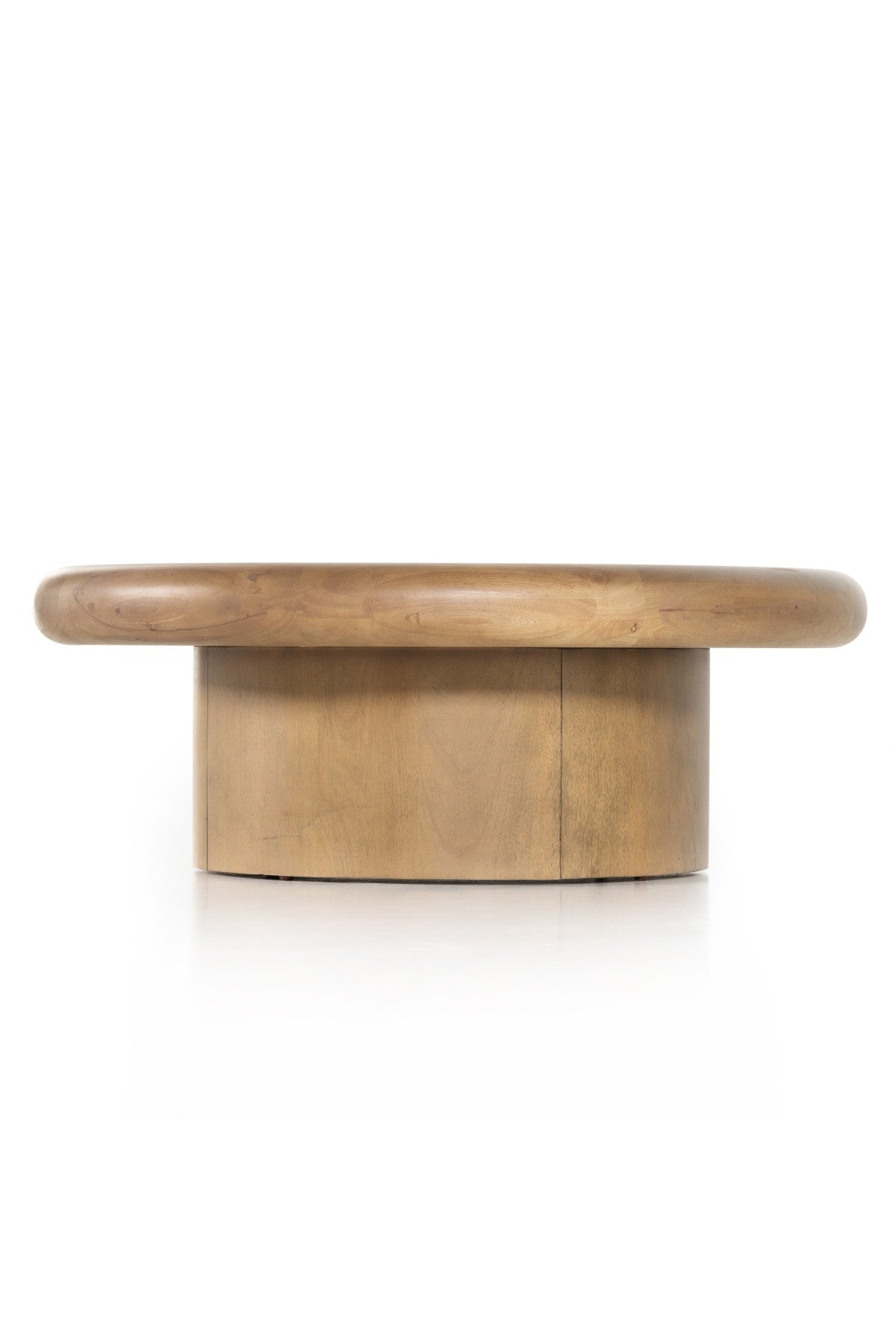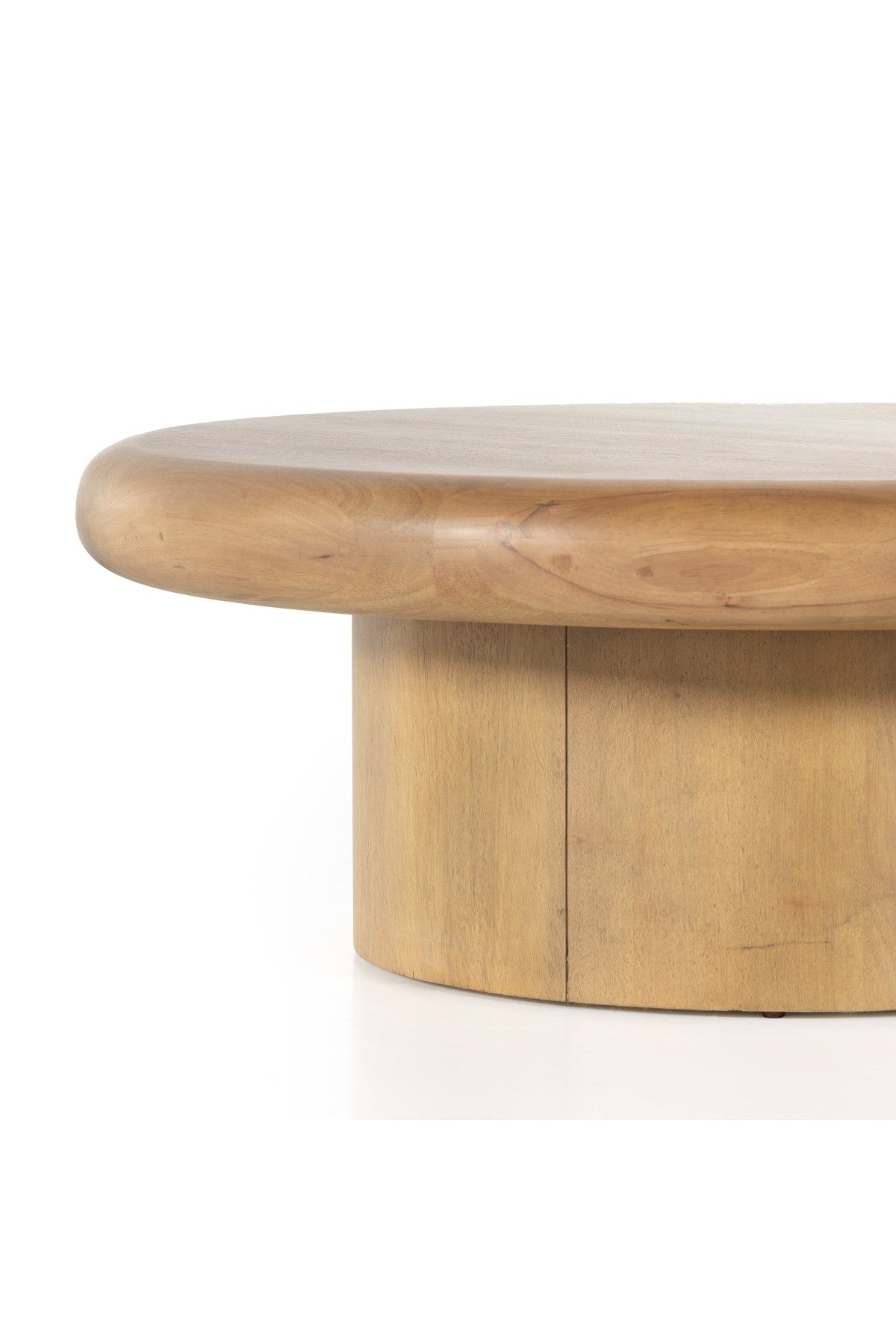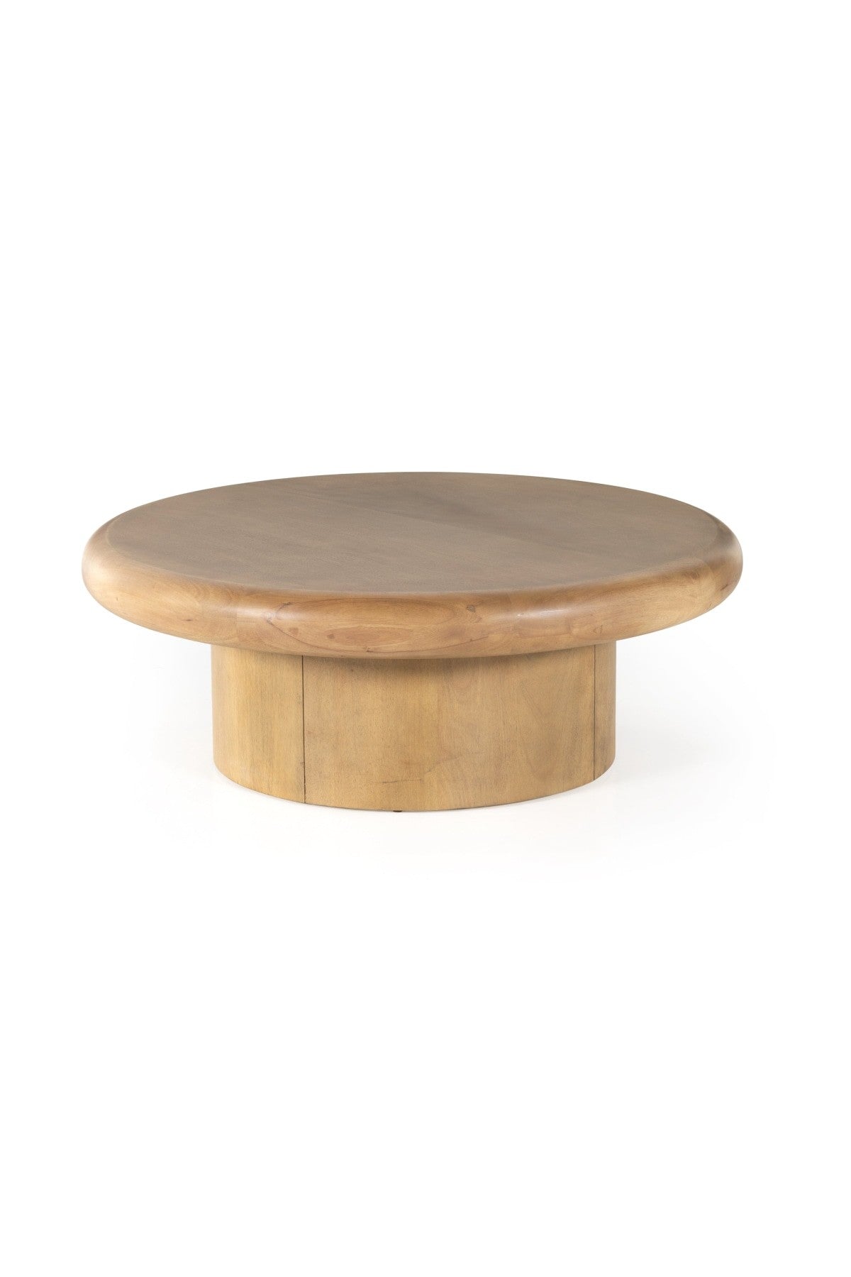 Meet the Zach Coffee Table in Natural. A pedestal-style base of solid burnished parawood supports a rounded tabletop with bullnose edging, for style and softness alike.