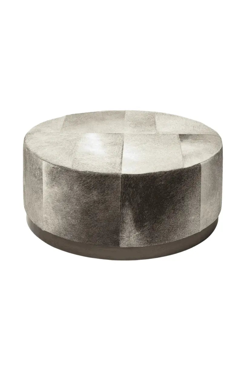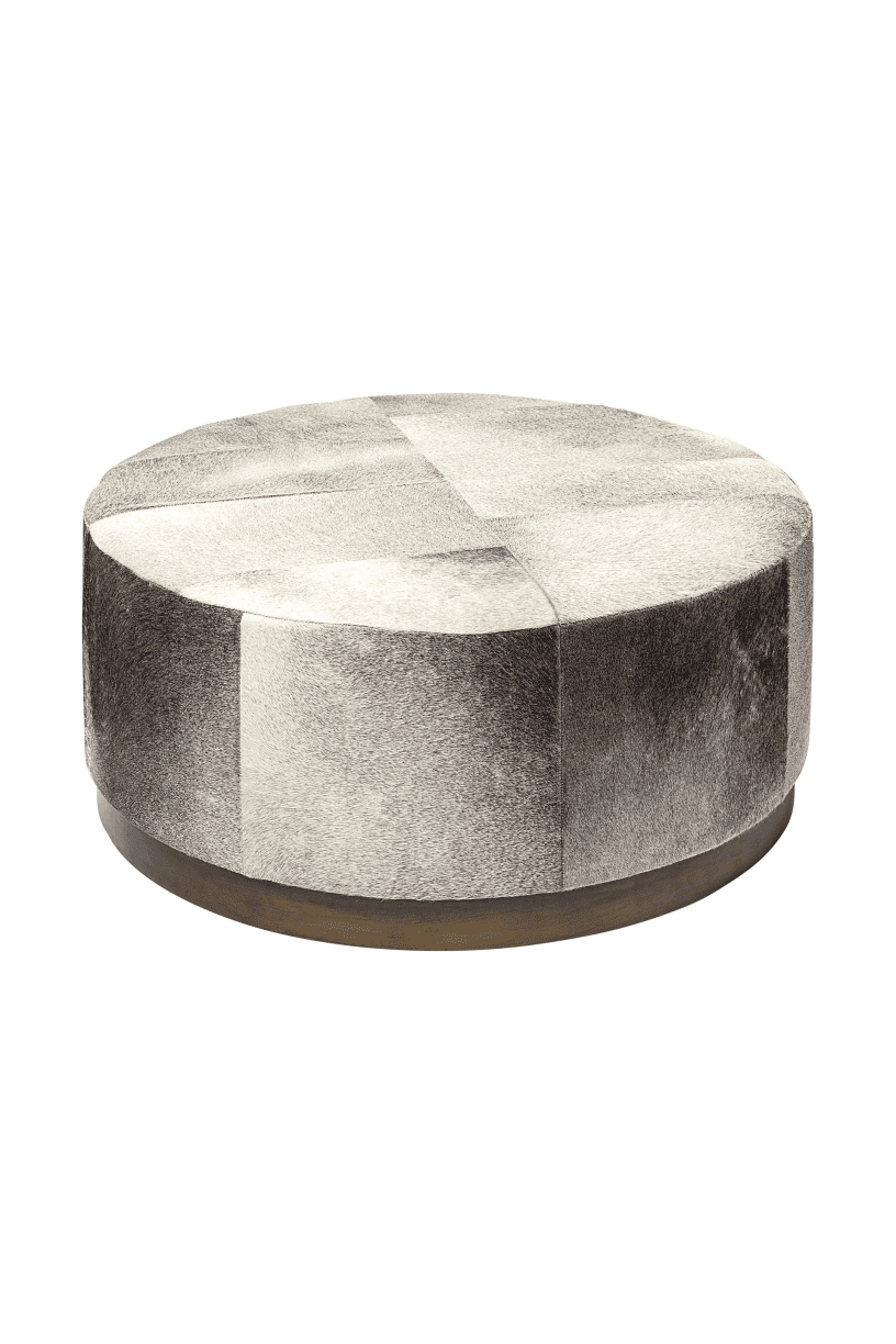 Meet the Zahavi Ottoman. A spectacular, cylindrical upholstered ottoman that flaunts a grey-toned, hair-on-leather wrap which gives it an unsurpassed look guaranteed to add a touch of luxury to your space.