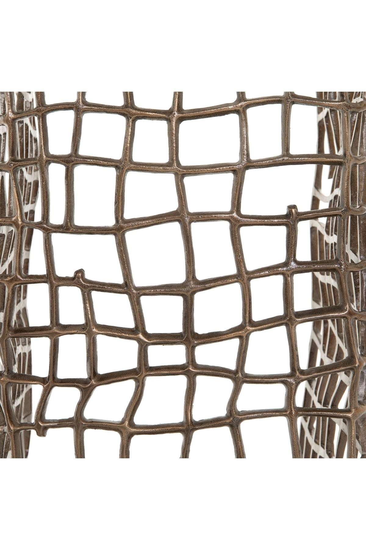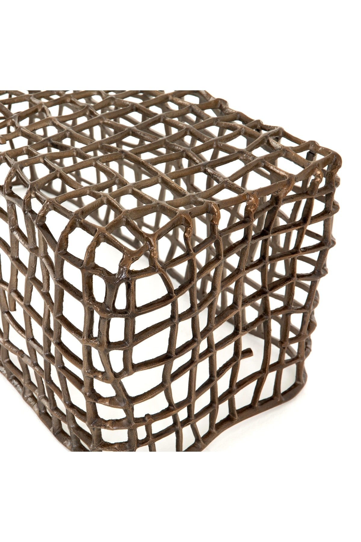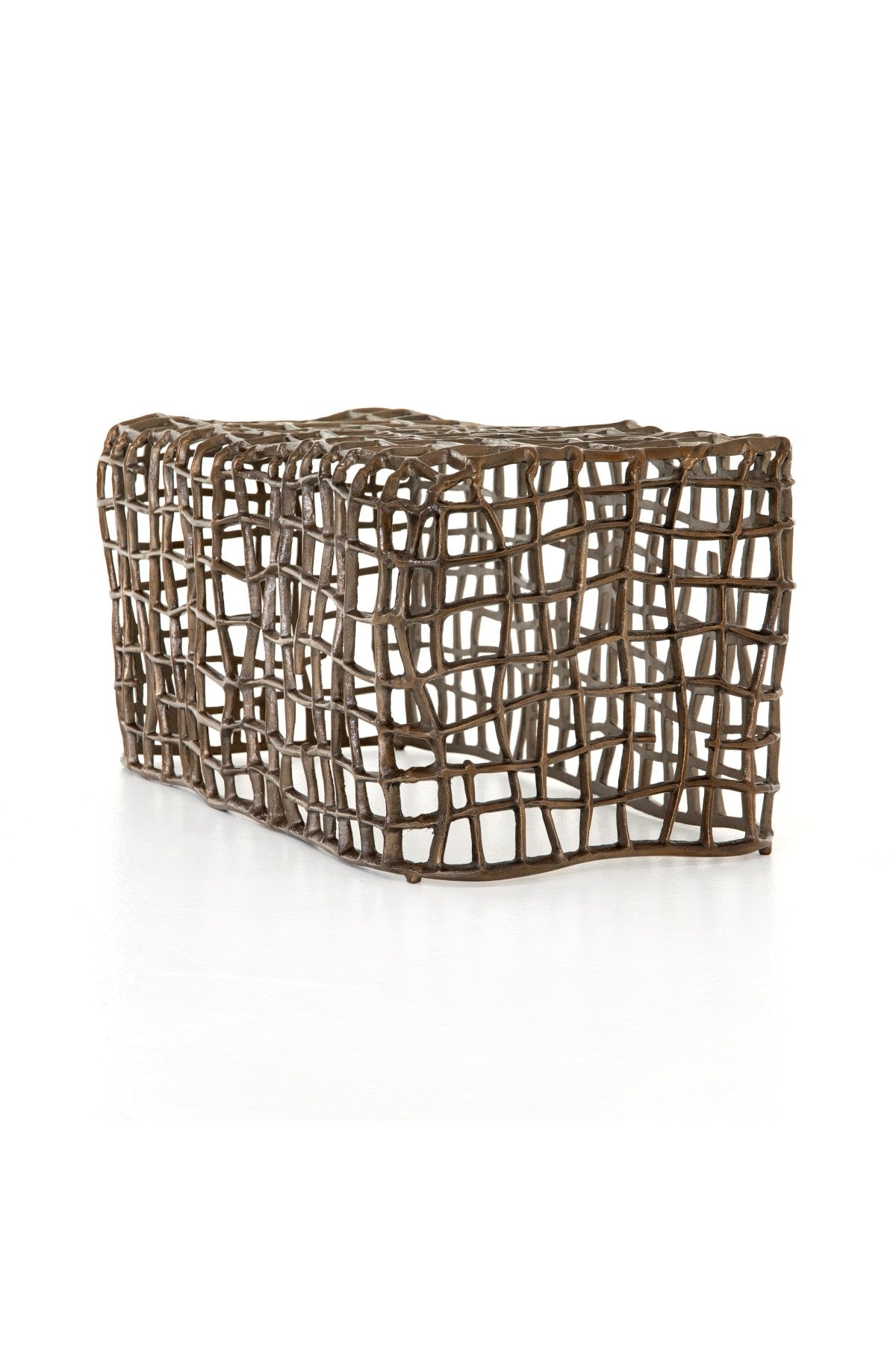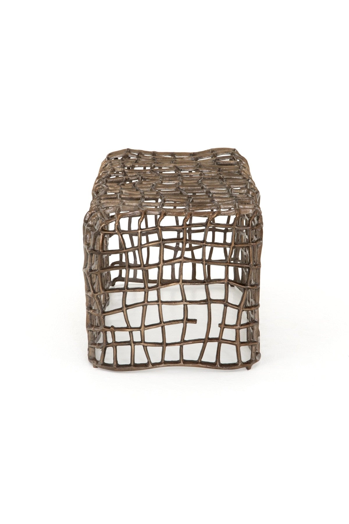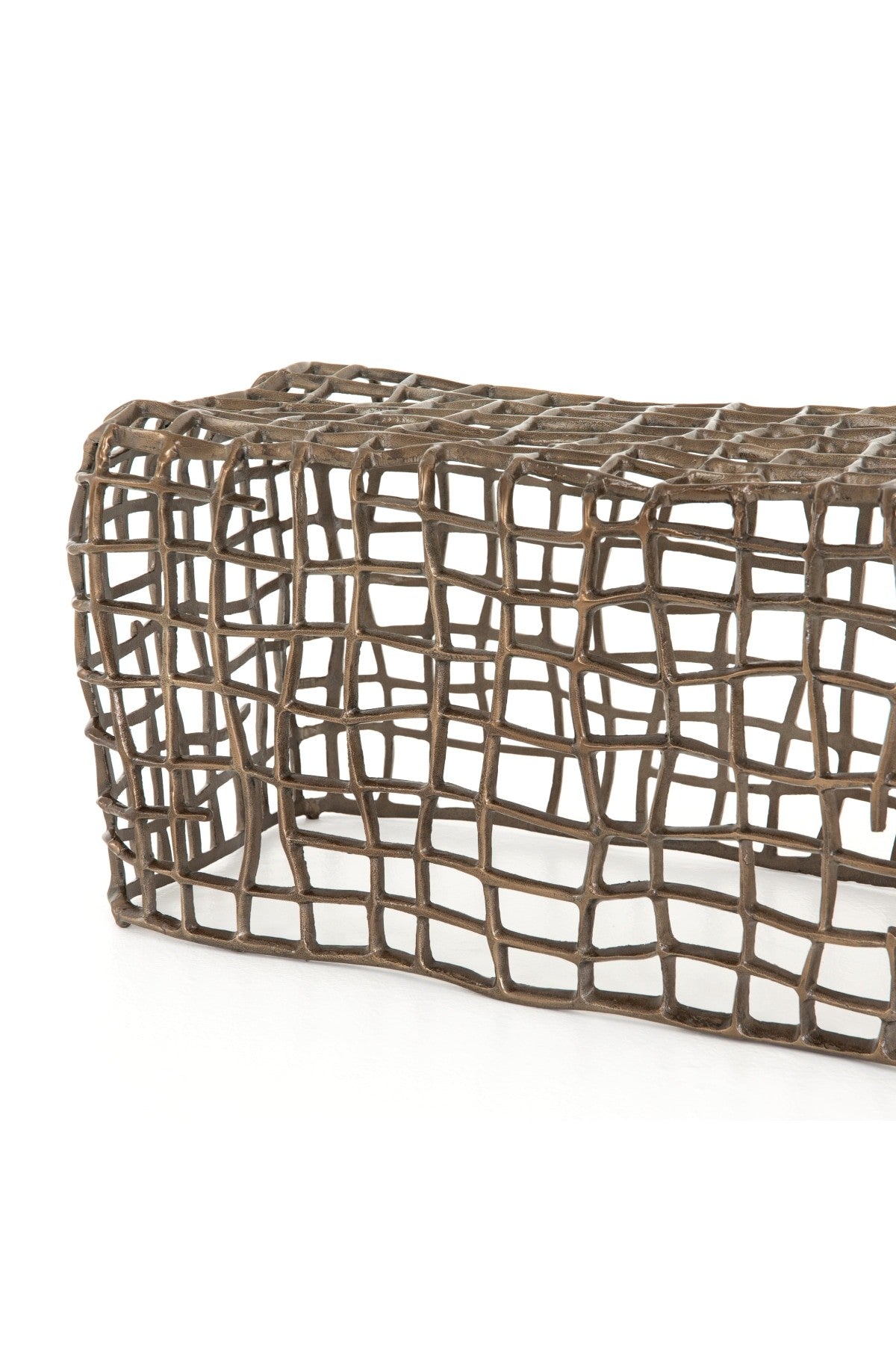 Meet the Zander Outdoor Bench. Aged bronze-finished aluminum forms a fluid, cage-like bench, for a forward-thinking look with clever distinction, indoors or out. Cover or store indoors during inclement weather and when not in use.
